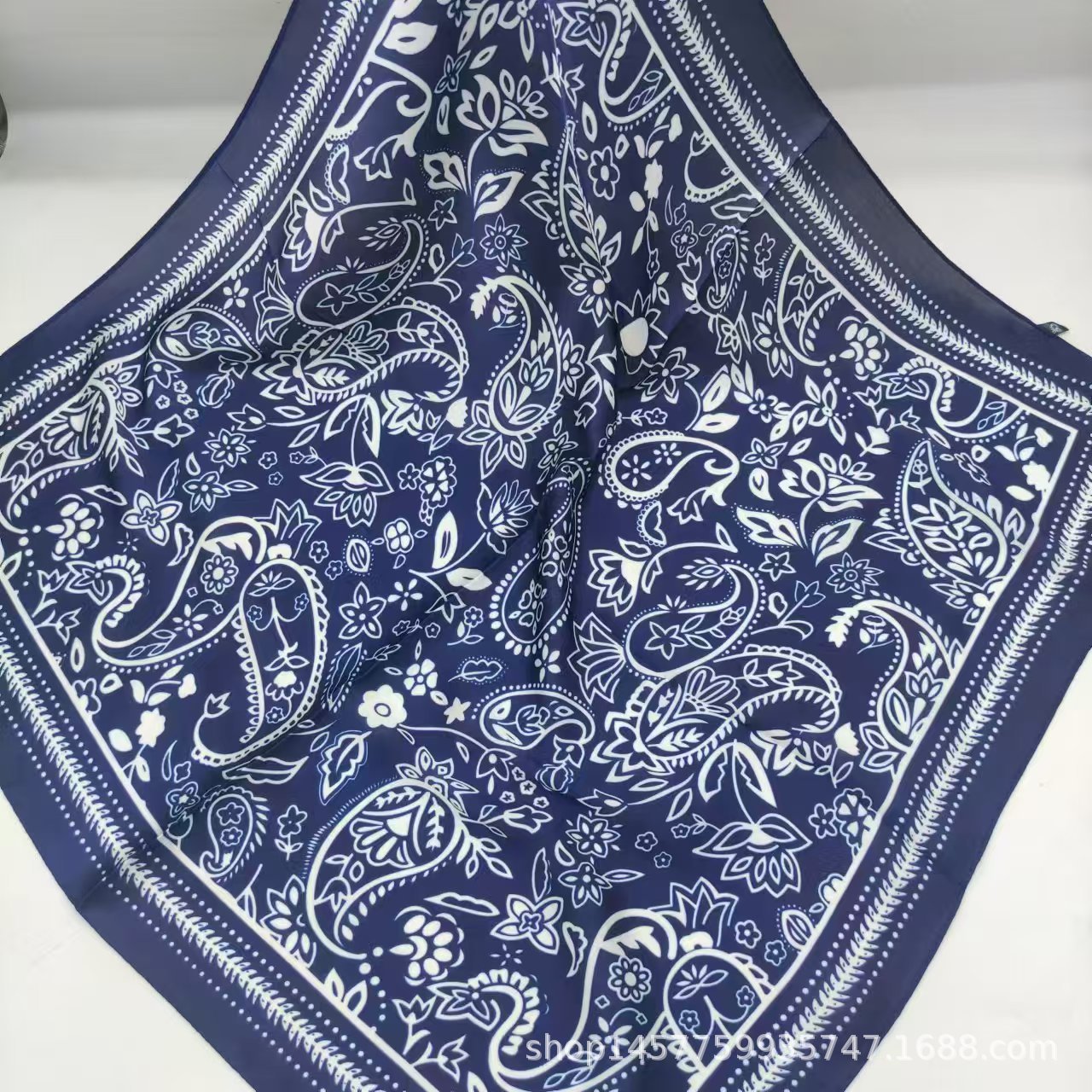 • 흰색 가장자리가 있는 파란색 캐슈 실크 스카프 작은 사각형 스카프
