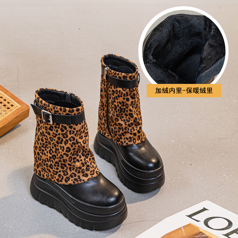 여성용 숏부츠 2025 가을 겨울 신상 두꺼운 밑창 튜브 부츠 마틴 부츠 레트로 레오파드 프린트 미드 튜브 벨트 버클 내부 오르가슴