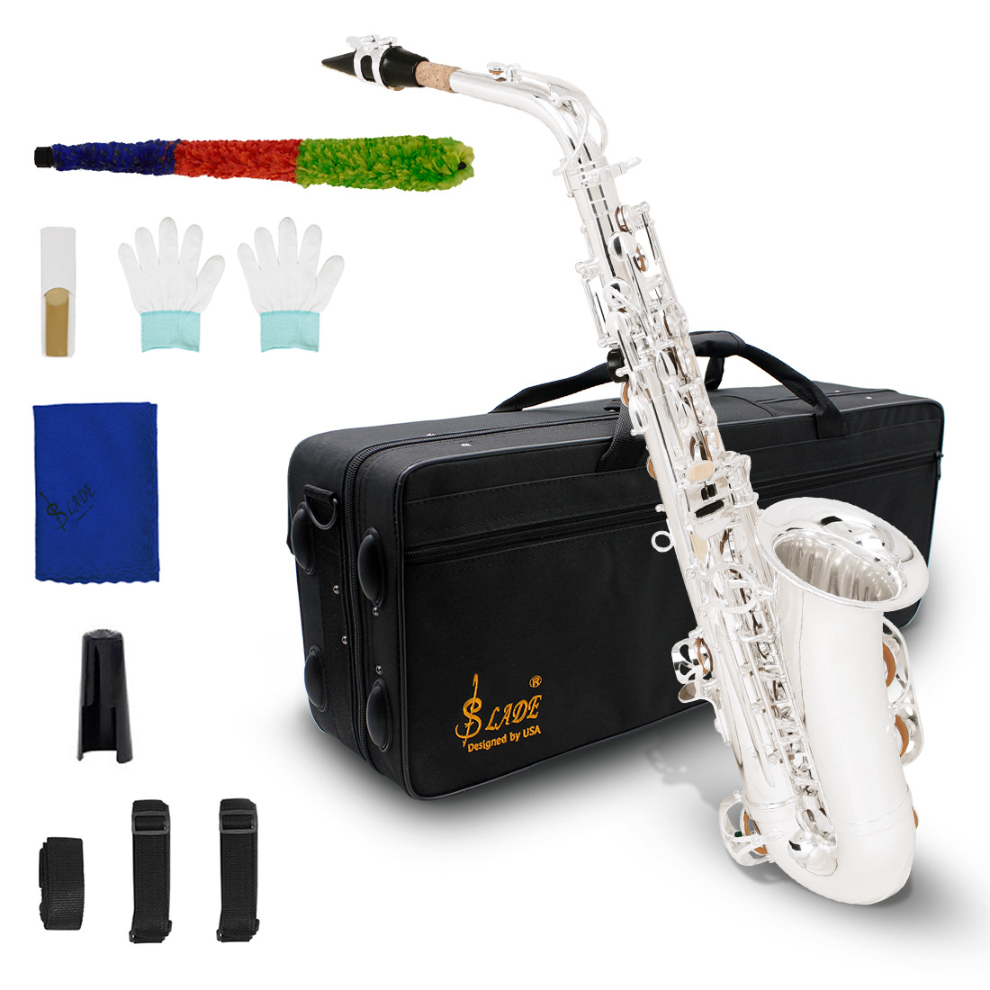 包装清单:包*1 萨克斯*1 背带*2 脖带*1 手套*1双 擦布*1 弯脖*1 笛头*1 卡子*1 哨片*1