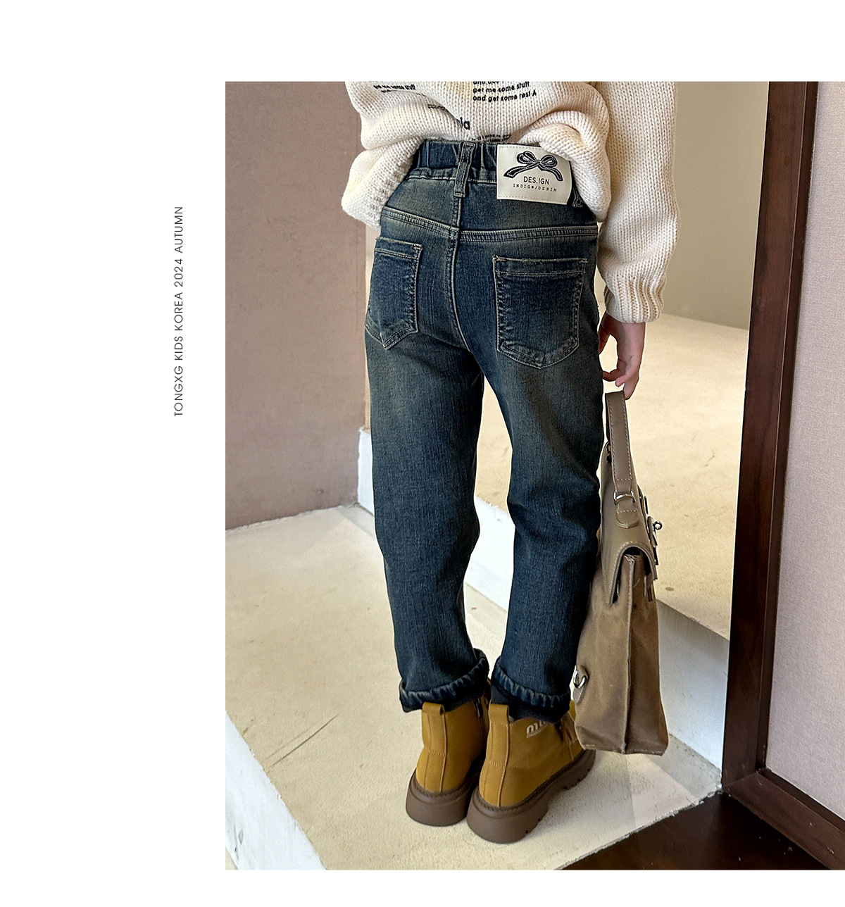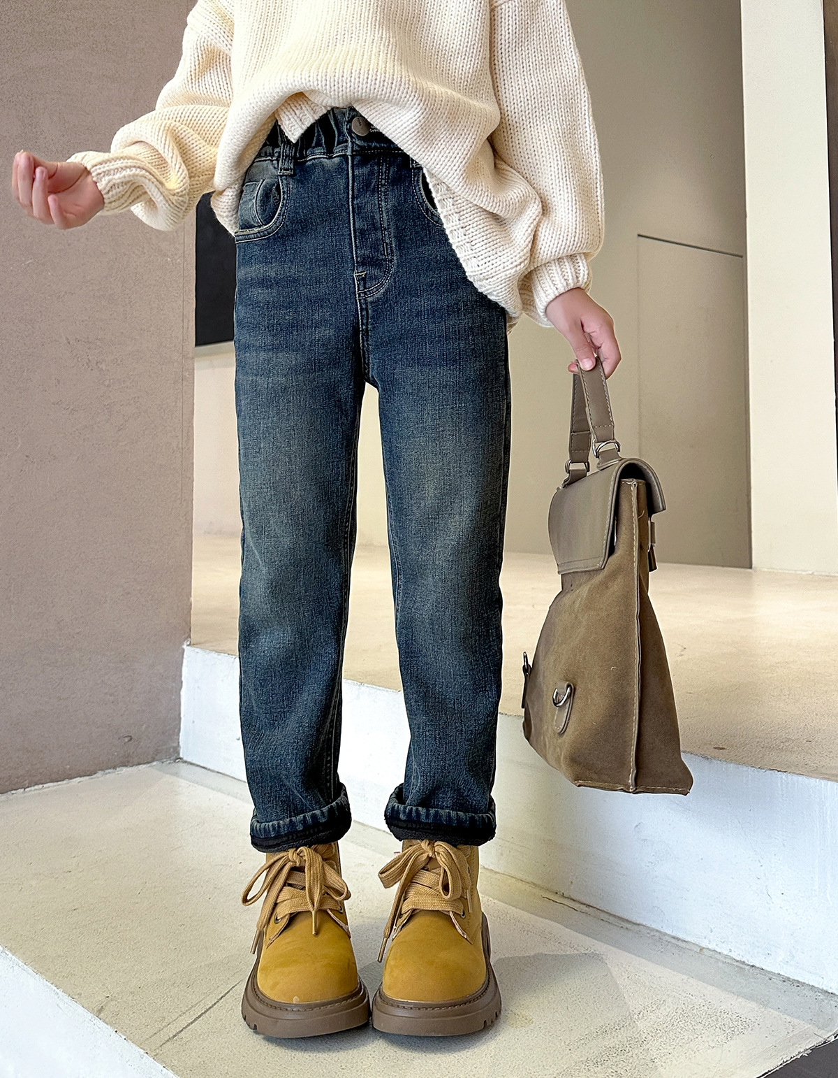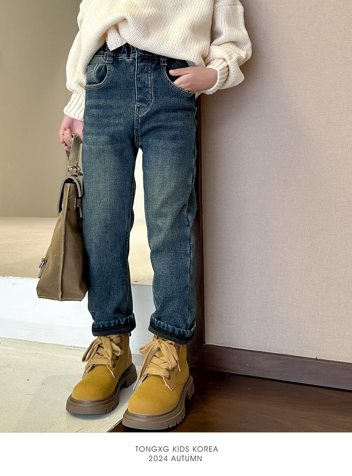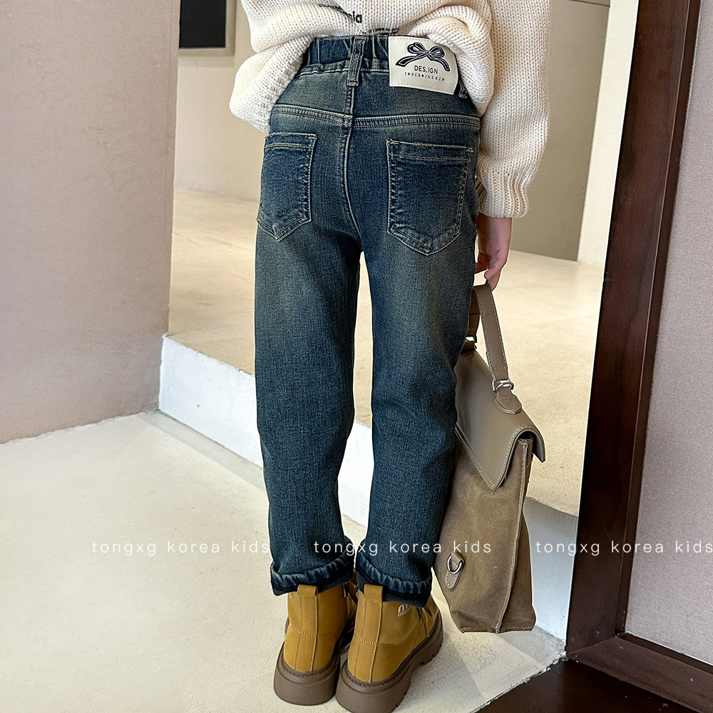 【재고 있음】2025 가을 겨울 신상 중대형 아동용 기모 두꺼운 워싱 데님 팬츠, 세련된 여아용 기모 데님스토어 가기