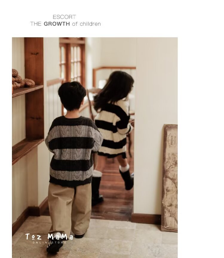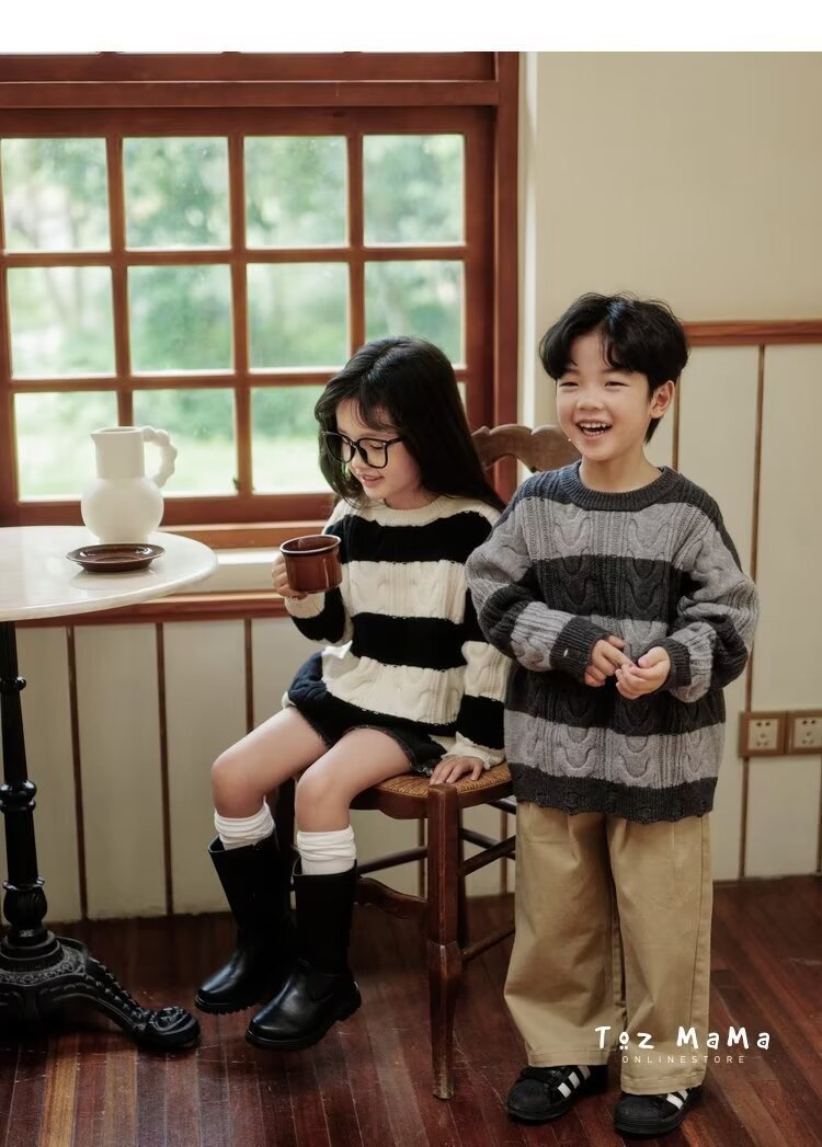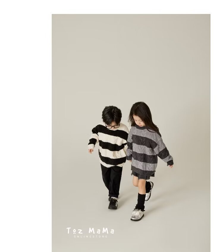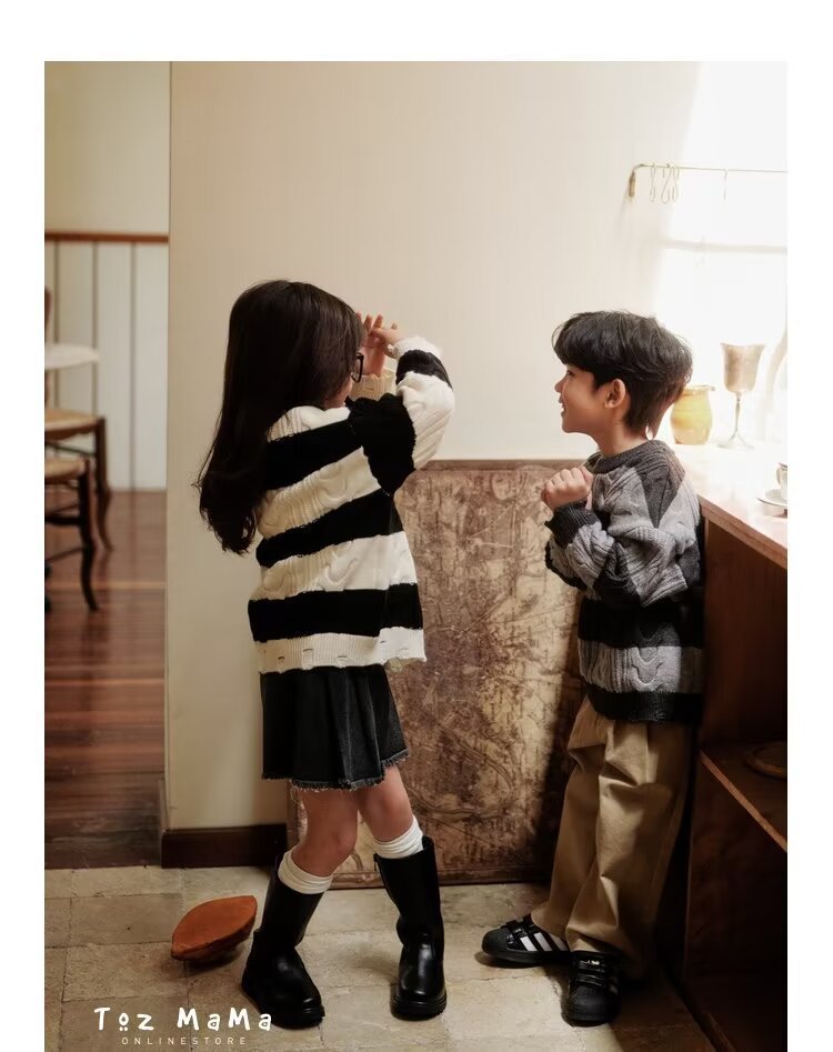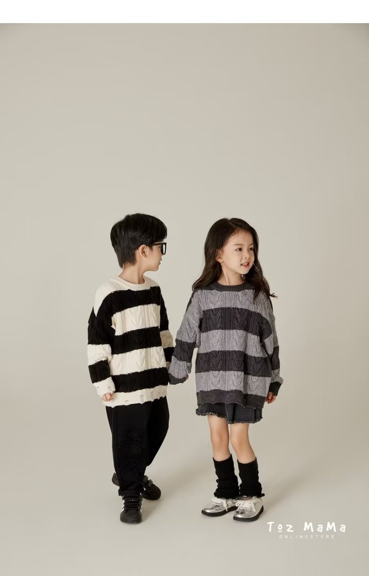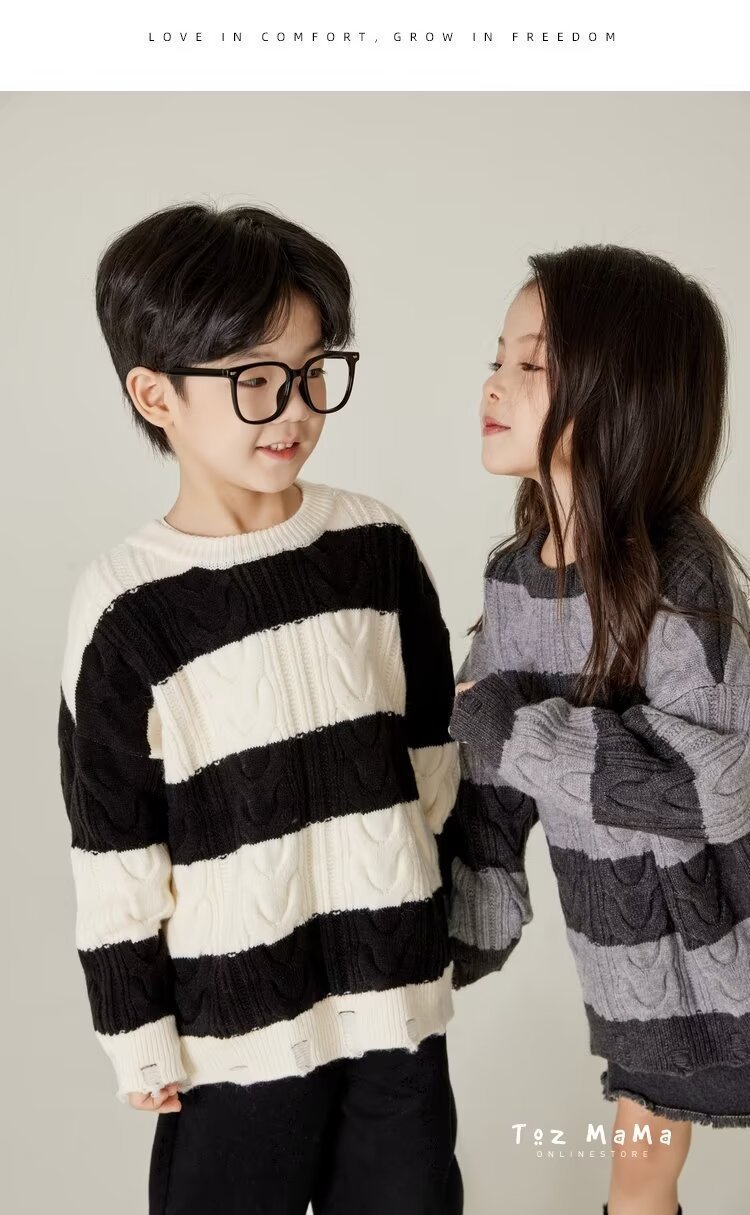 스트라이프 디자인 간단한 니트웨어 스웨터 소년과 소녀 가을과 겨울 새로운 찢어진 아이들의 긴 소매 라운드 넥 탑스토어 가기