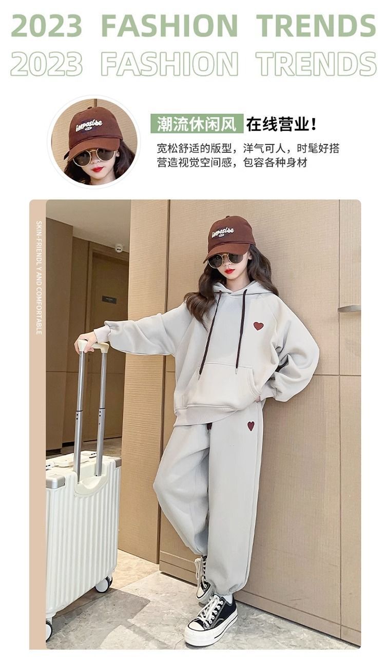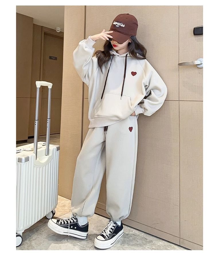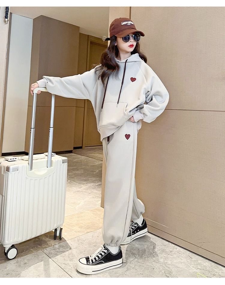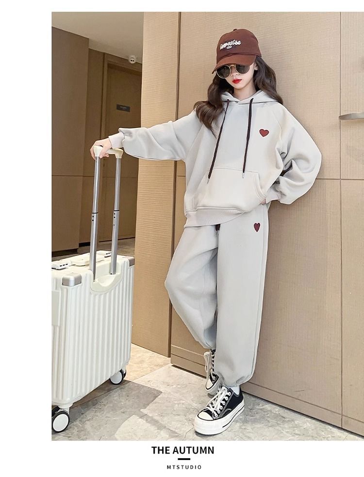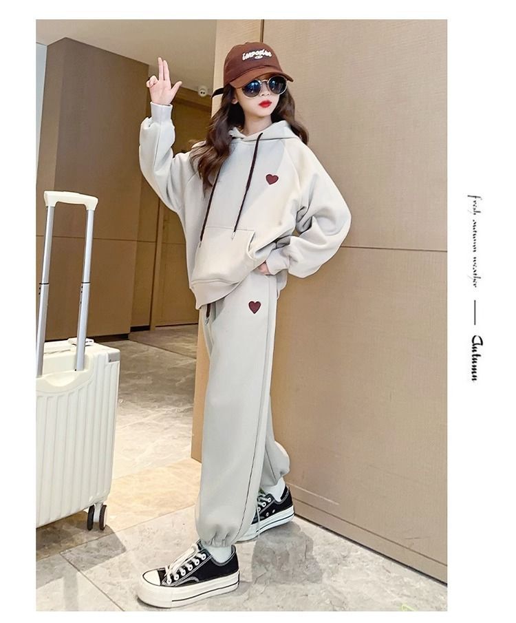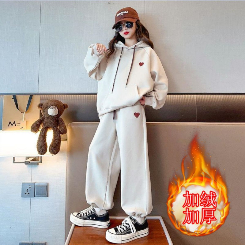 소녀의 세트 기모 두꺼운 가을과 겨울 소녀의 스포츠 자수 사랑 후드 땀 투피스 세트