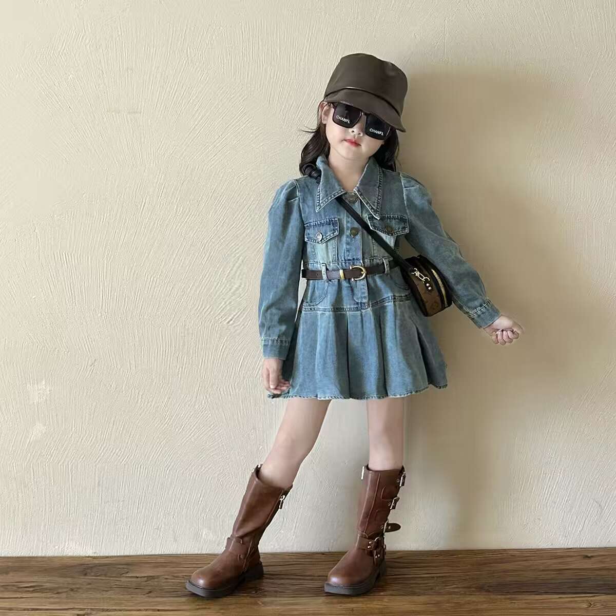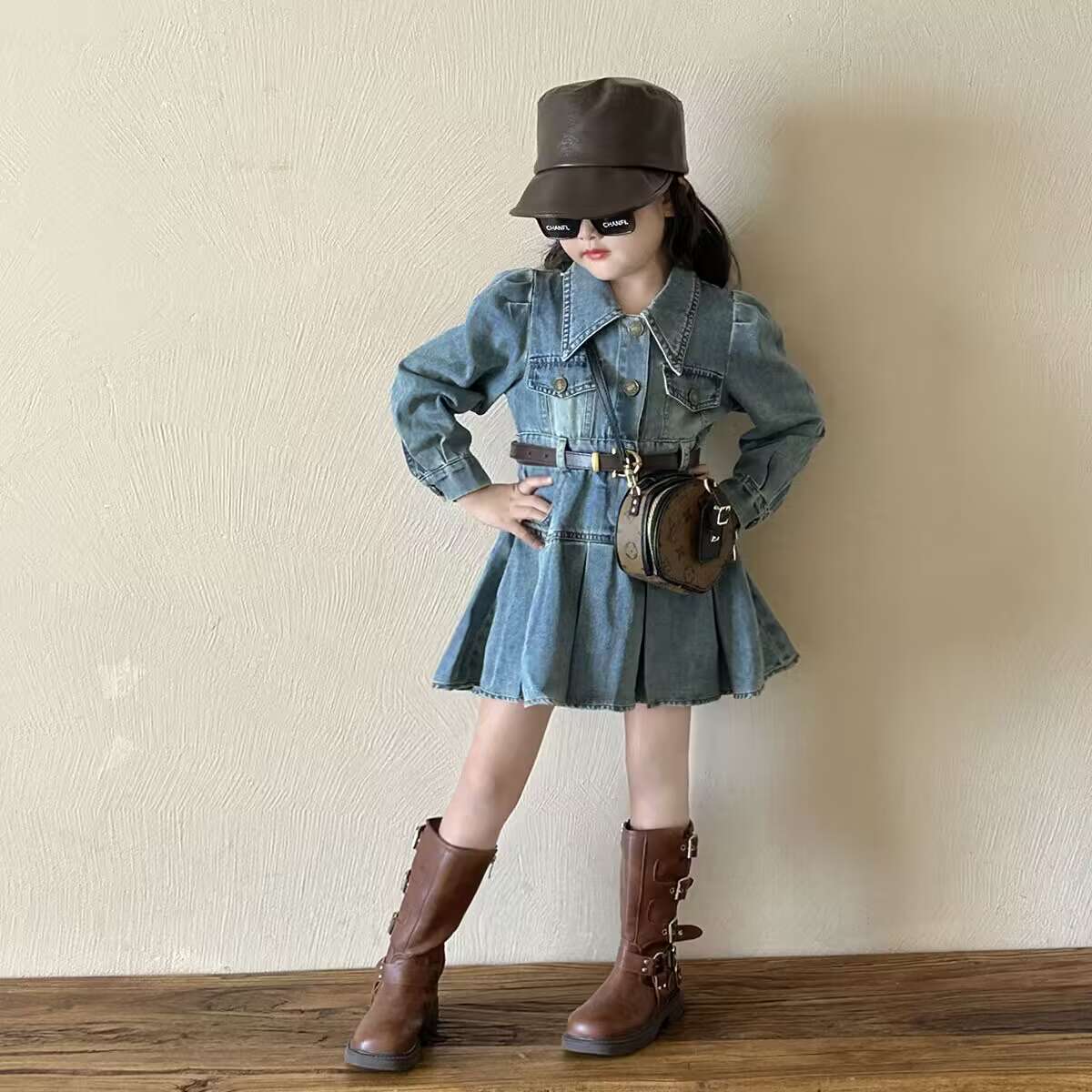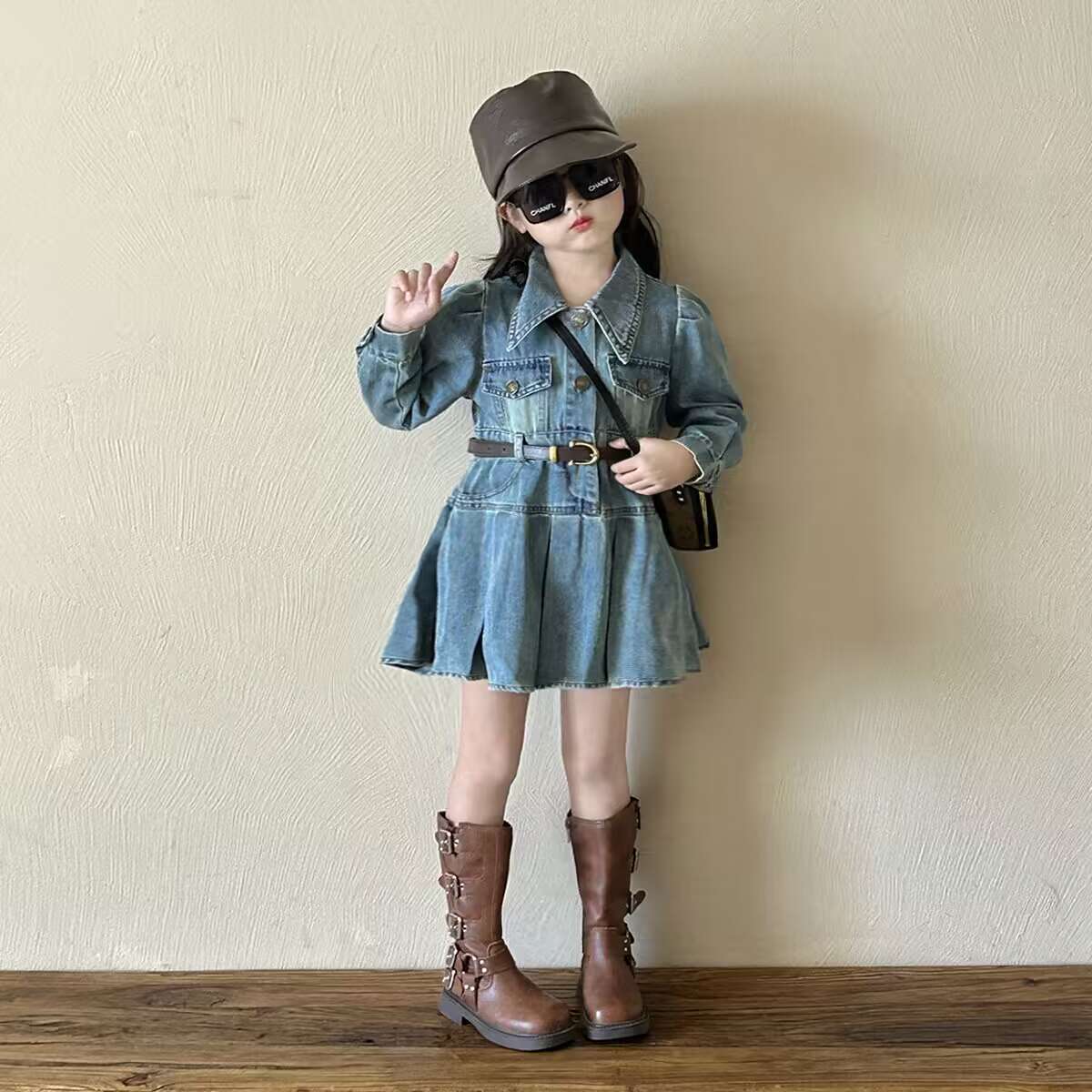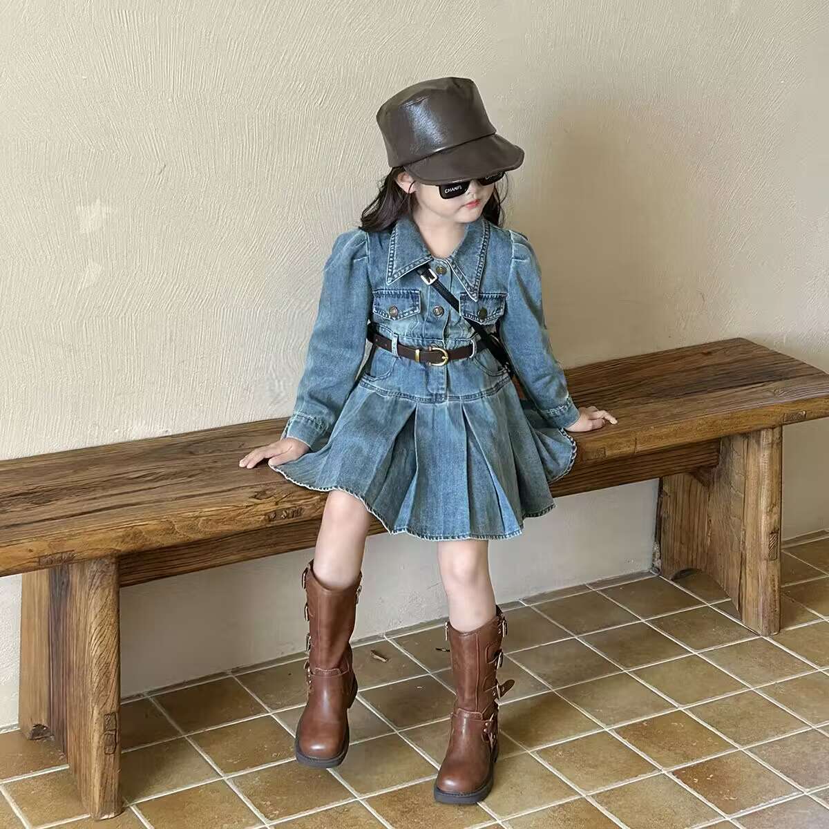 소녀 빈티지 데님 원피스 2024 가을 새 소녀 긴 소매 폴로 칼라 주름 치마 데님 A-라인 스커트스토어 가기