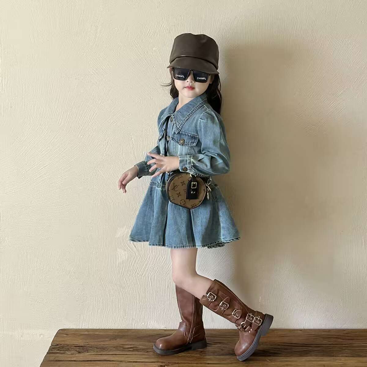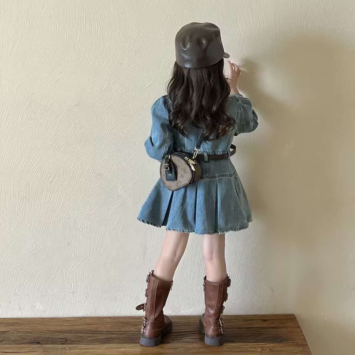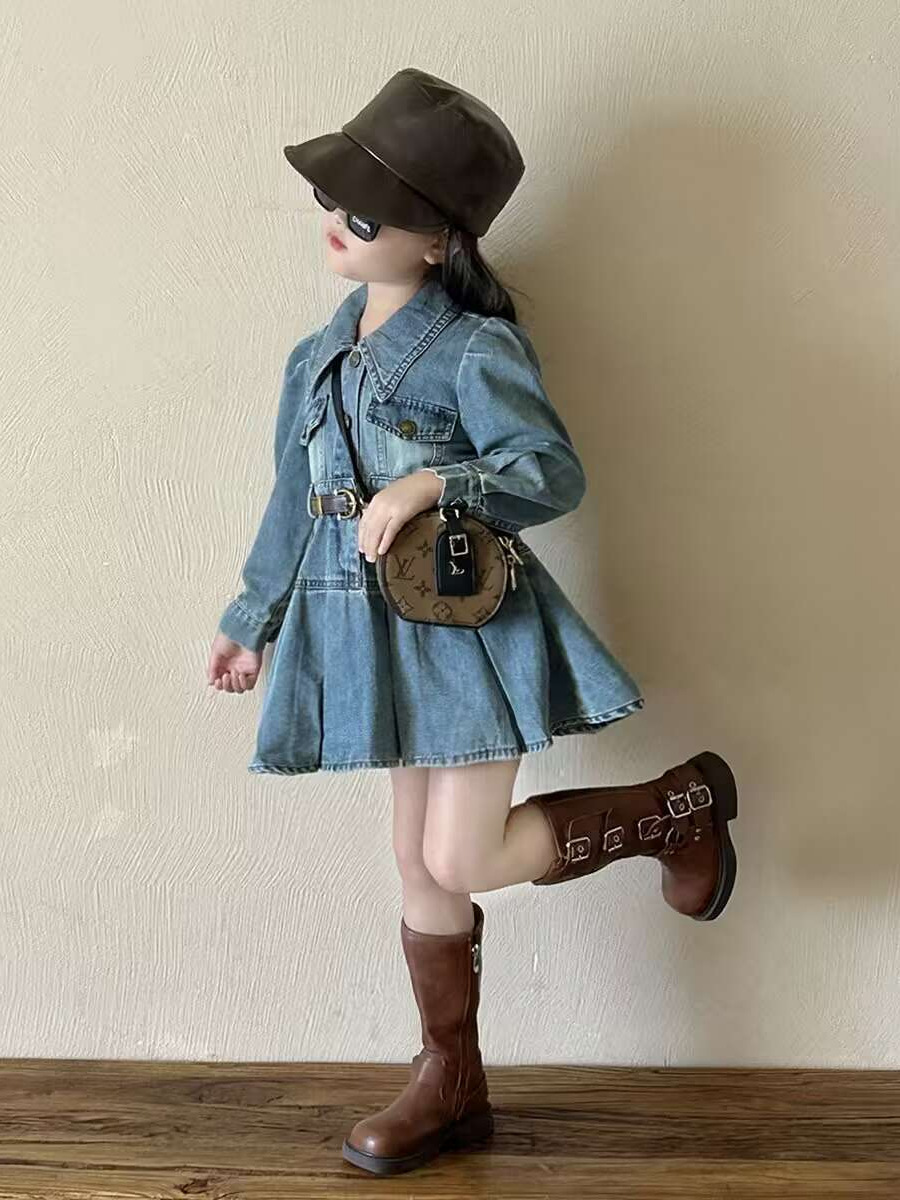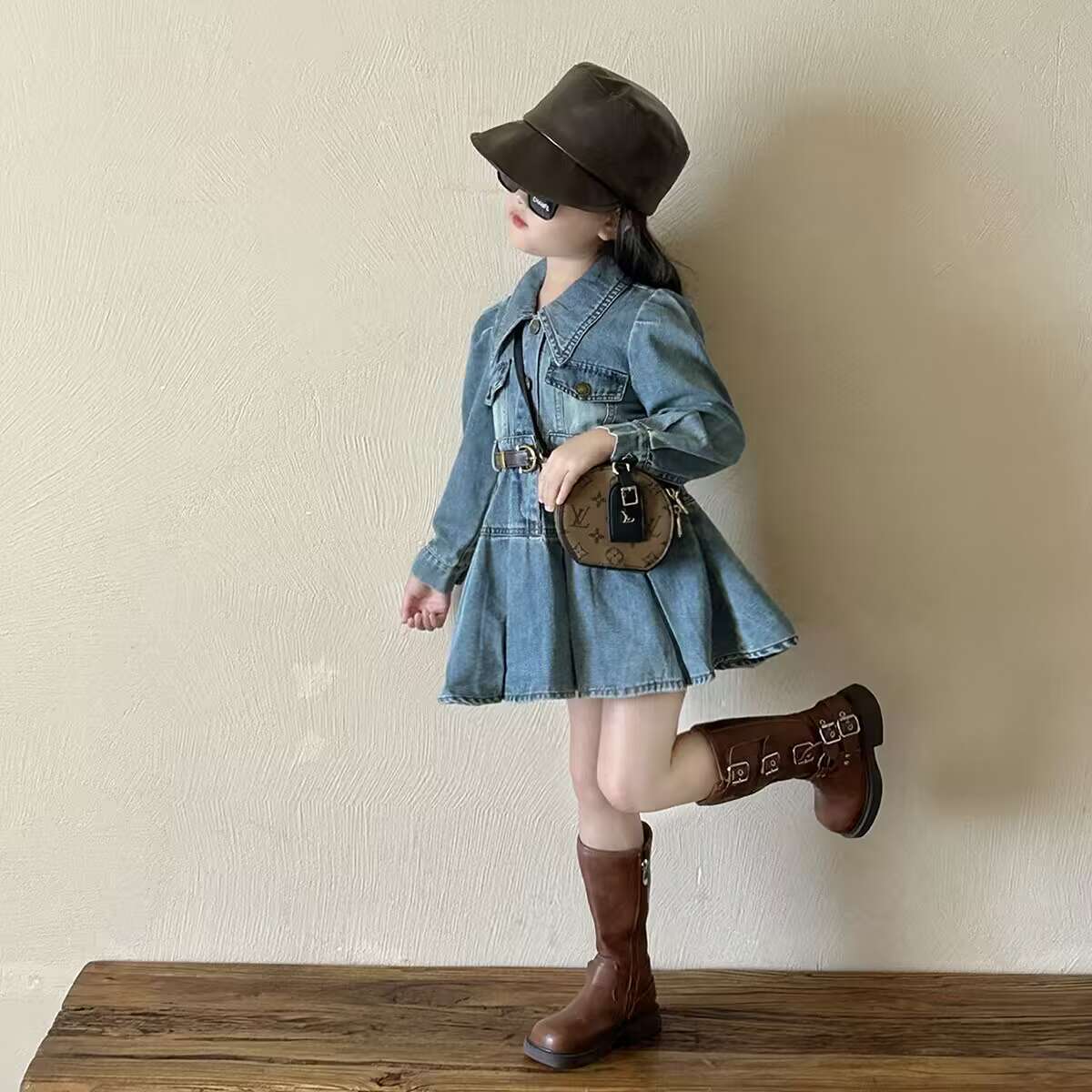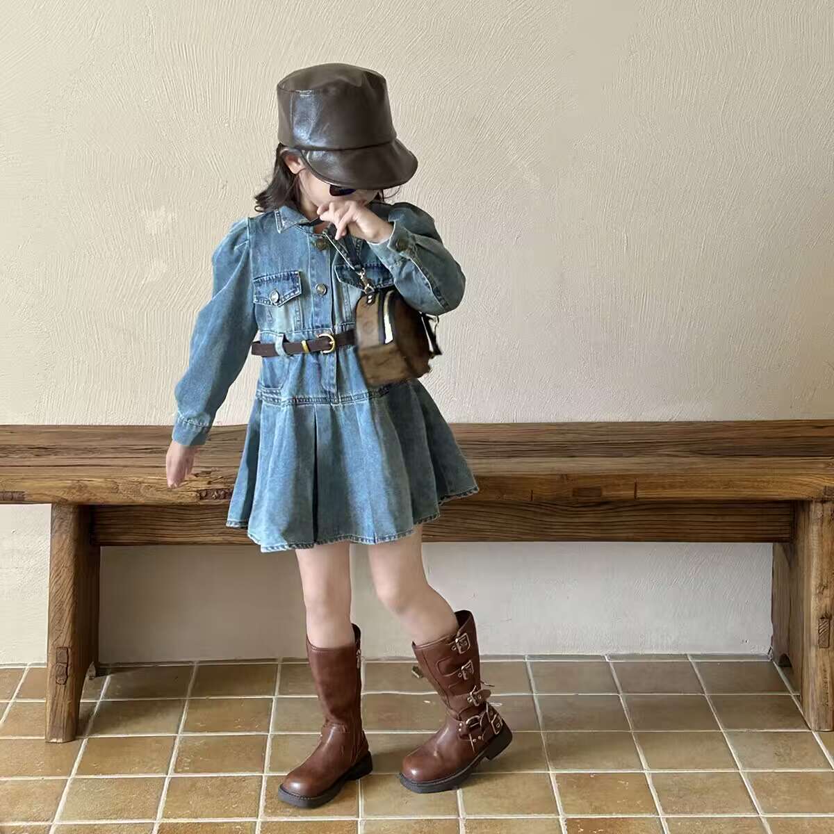 소녀 빈티지 데님 원피스 2024 가을 새 소녀 긴 소매 폴로 칼라 주름 치마 데님 A-라인 스커트스토어 가기
