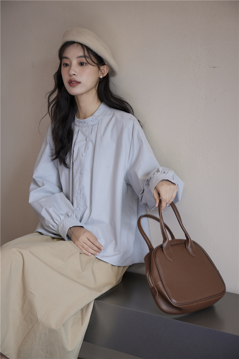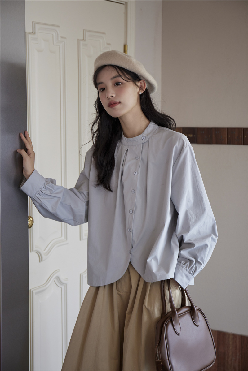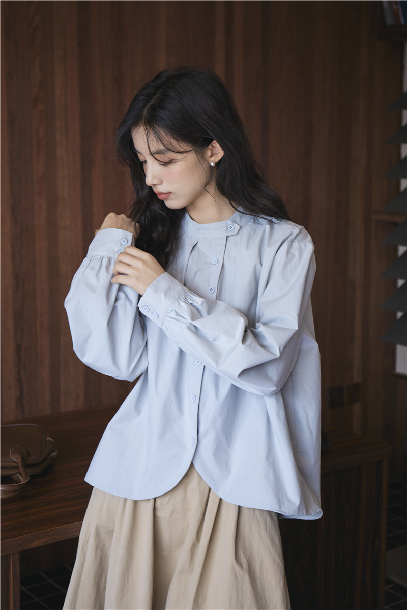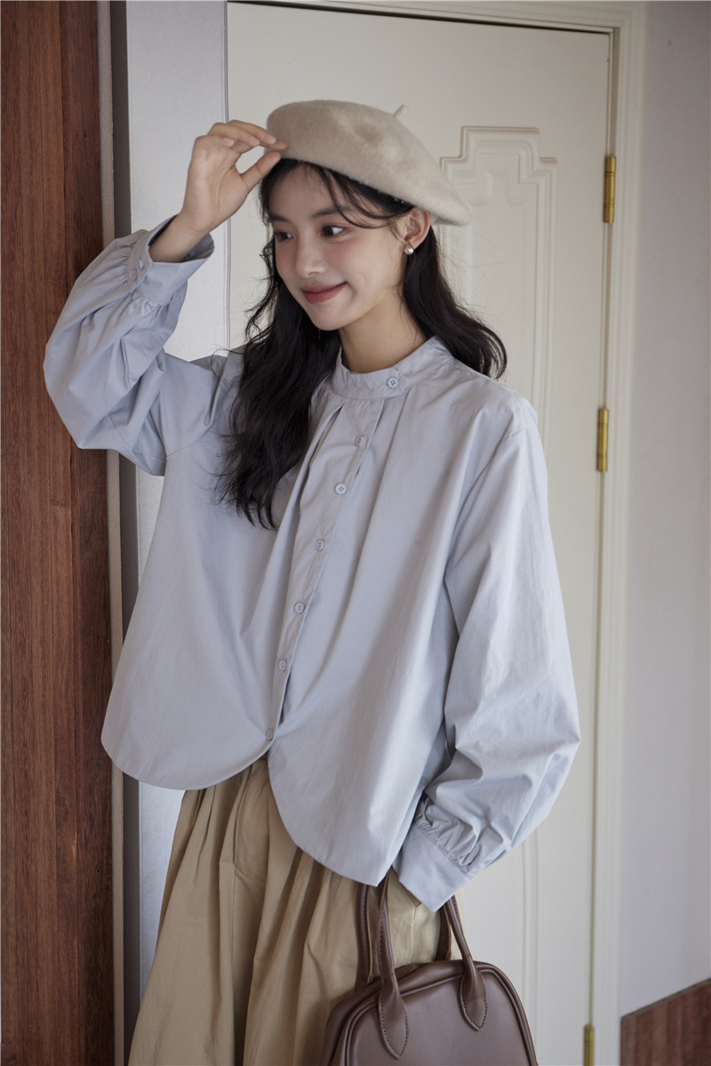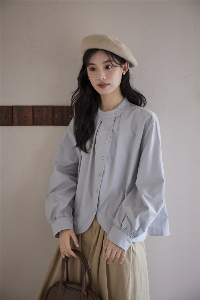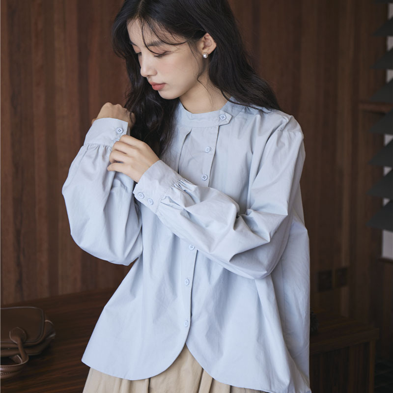 2025 가을 신상 일본식 심플 스탠드 칼라 긴팔 셔츠 불규칙 디자인 솔리드 컬러 셔츠 여성용스토어 가기
