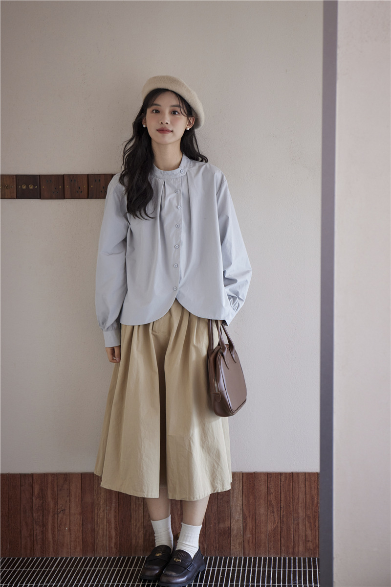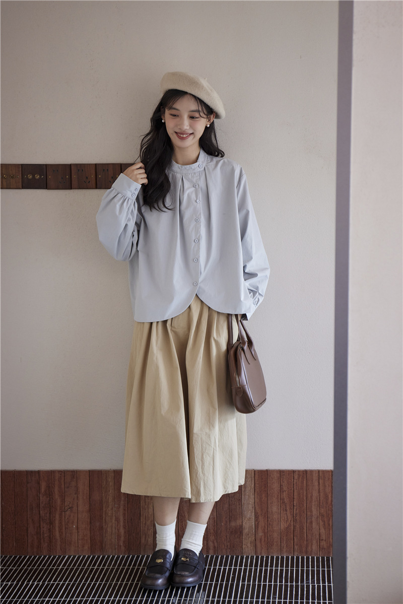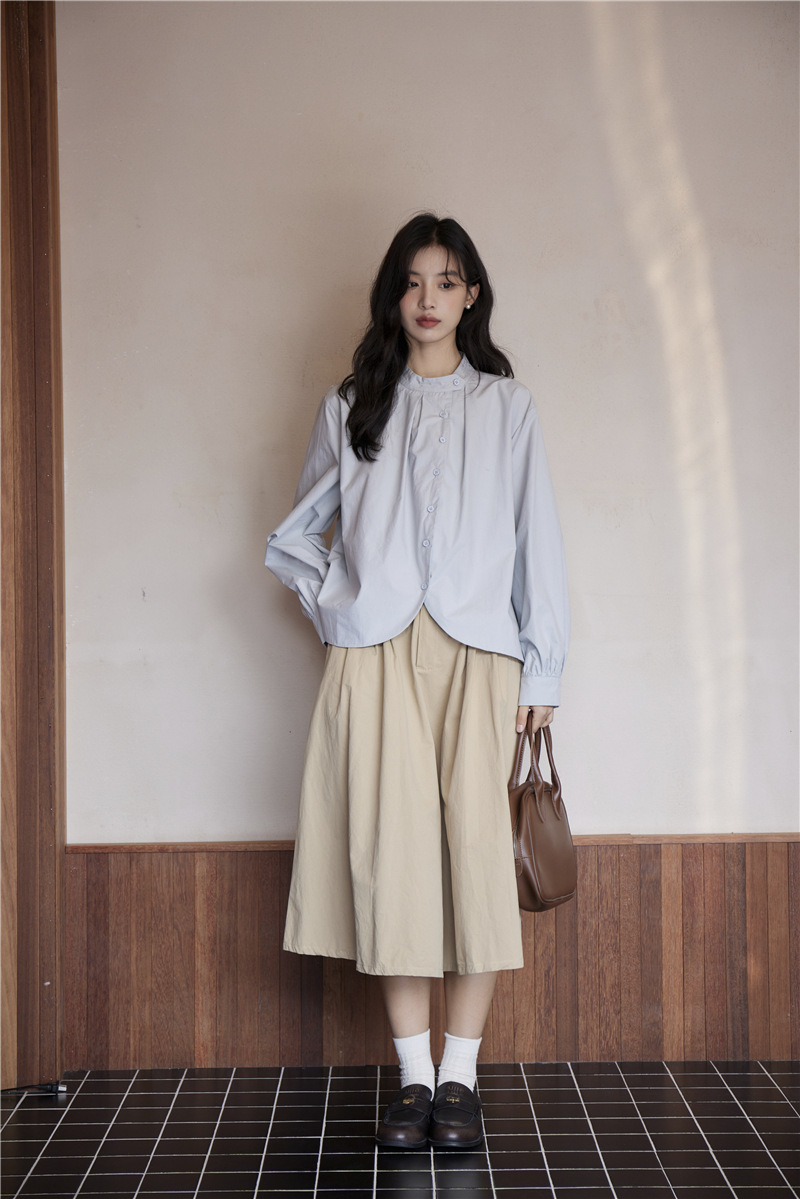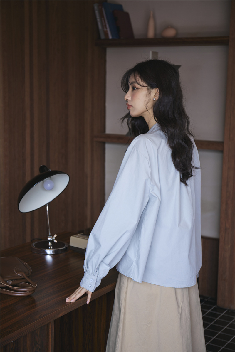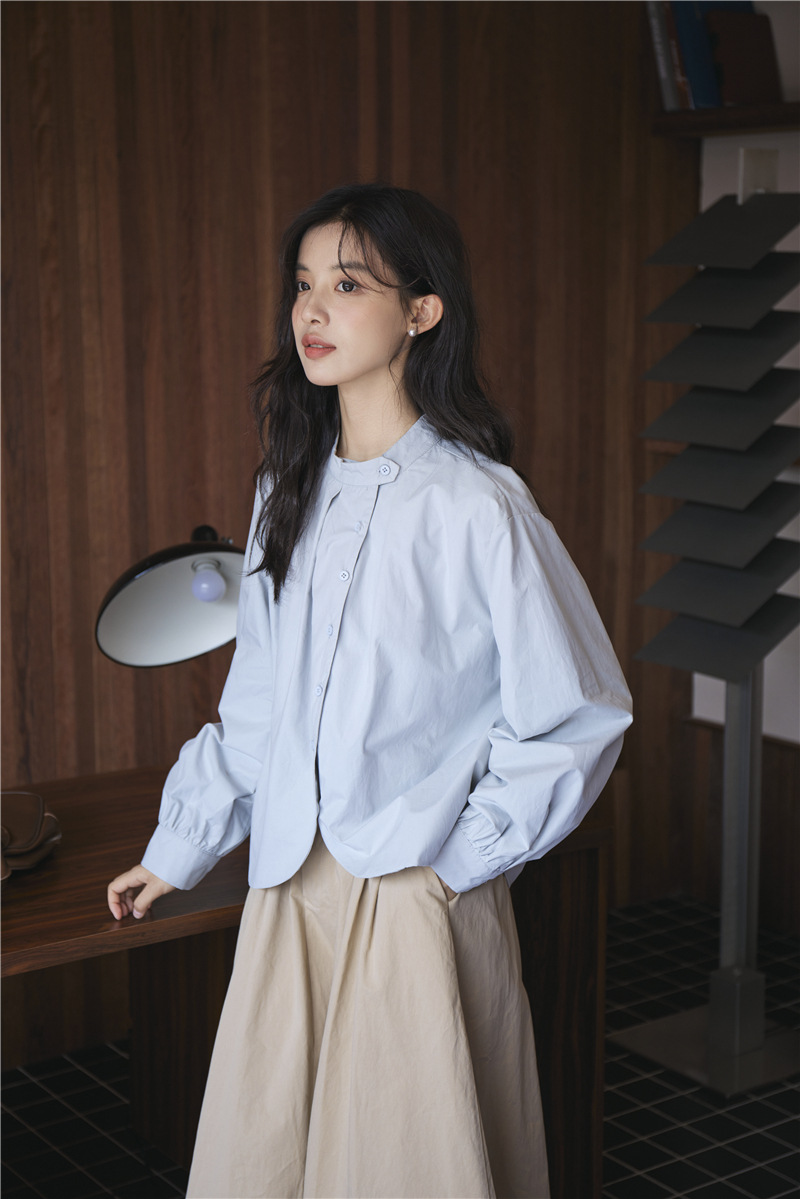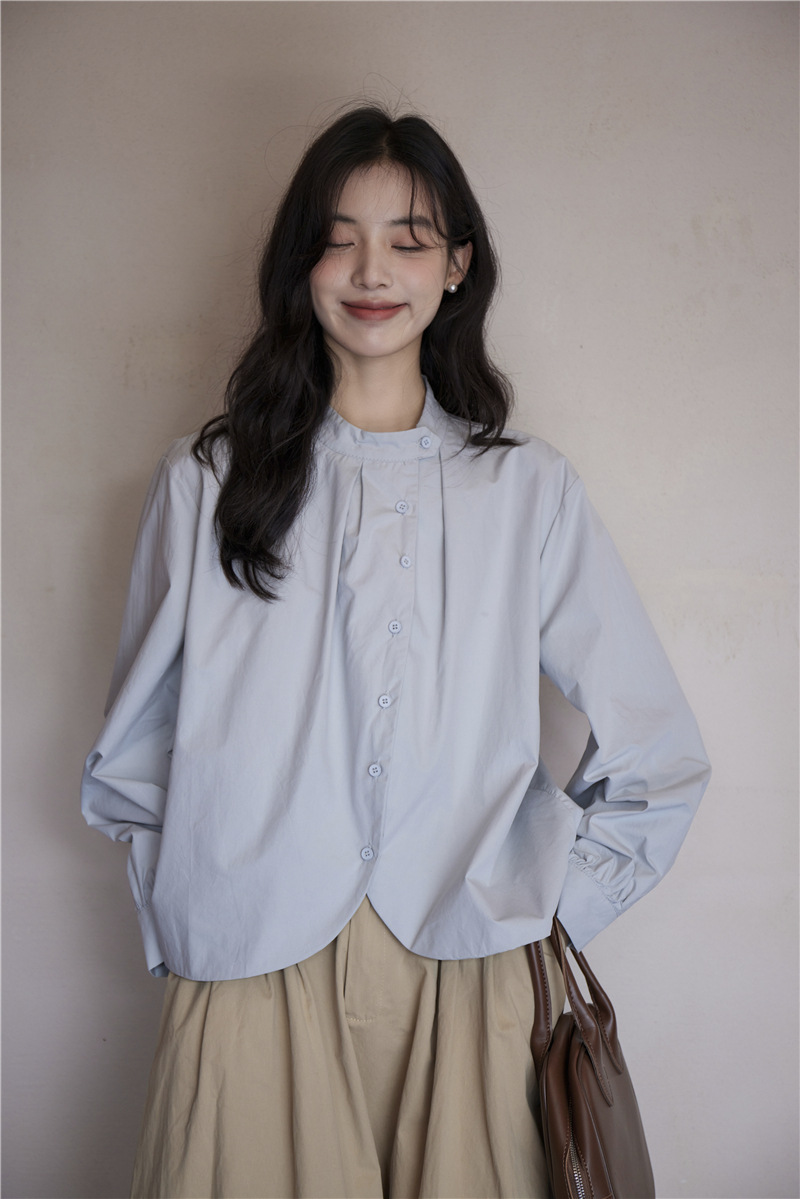 2025 가을 신상 일본식 심플 스탠드 칼라 긴팔 셔츠 불규칙 디자인 솔리드 컬러 셔츠 여성용스토어 가기