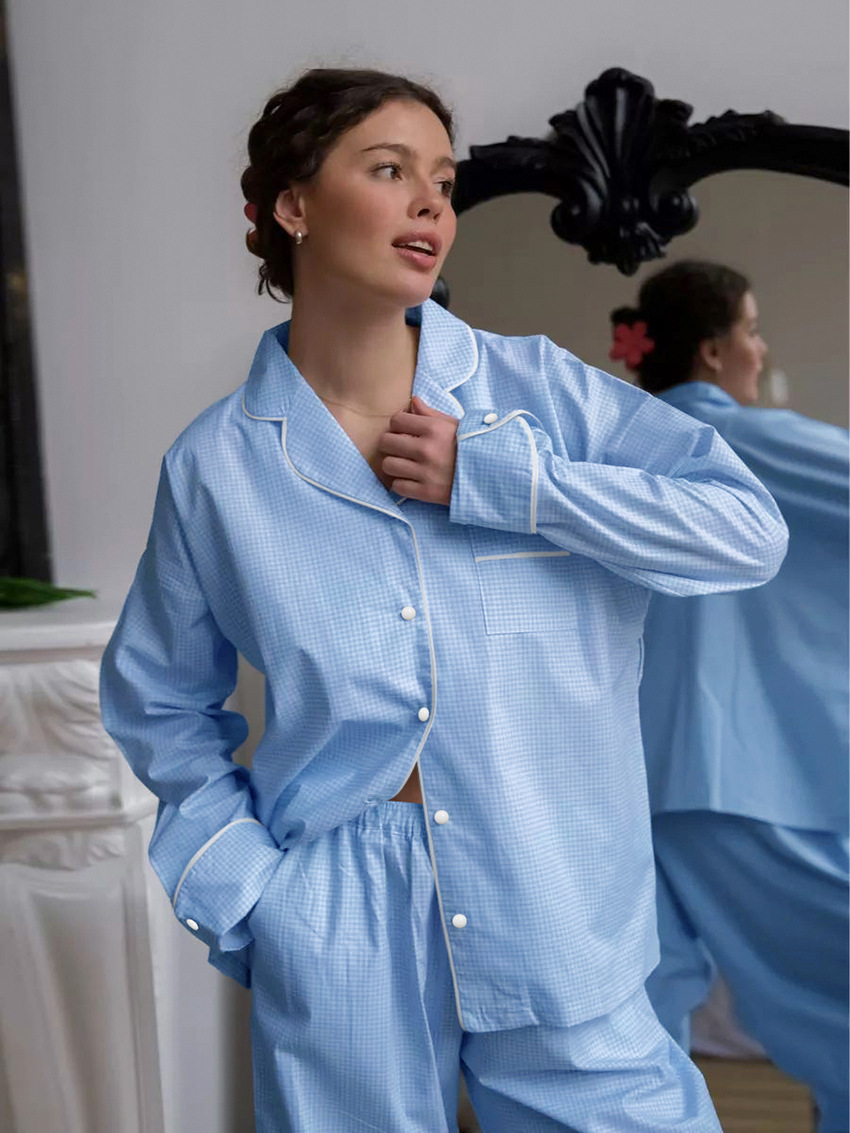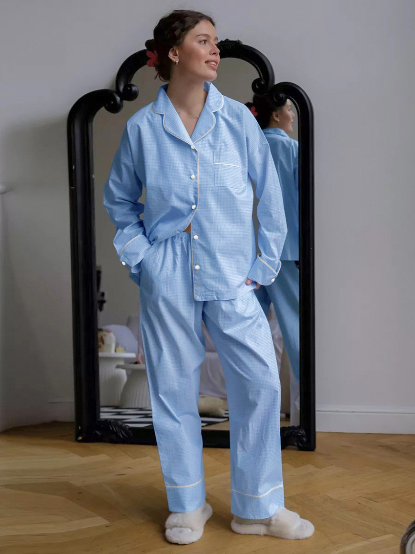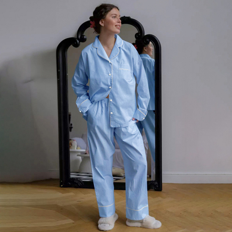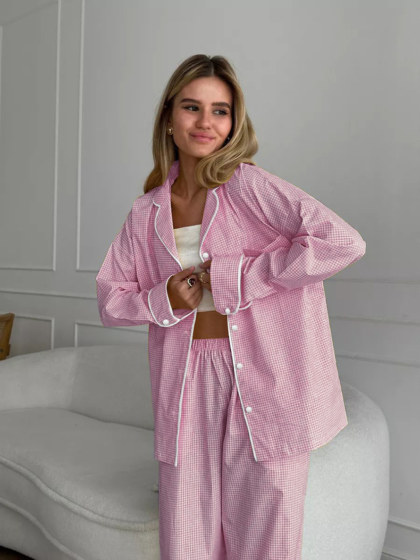 유럽과 미국의 2024 가을 새로운 핑크 격자 무늬 잠옷 2 조각 캐주얼 편안한 바느질 여성용 홈 의류 도매