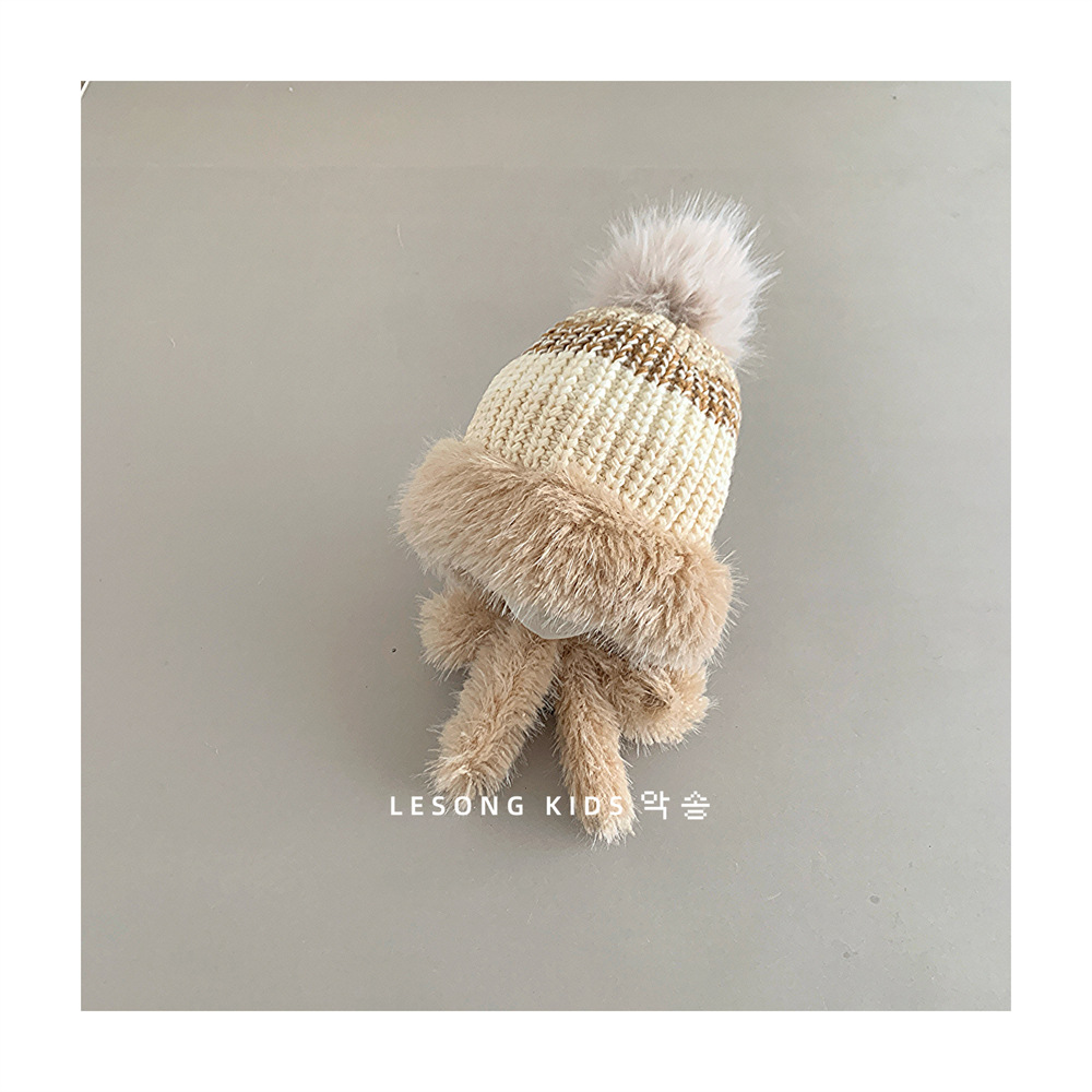 韩系彩虹色儿童毛毛季加厚针织护耳帽