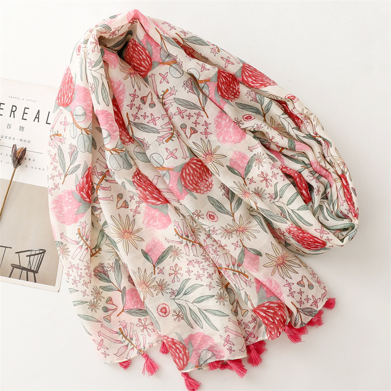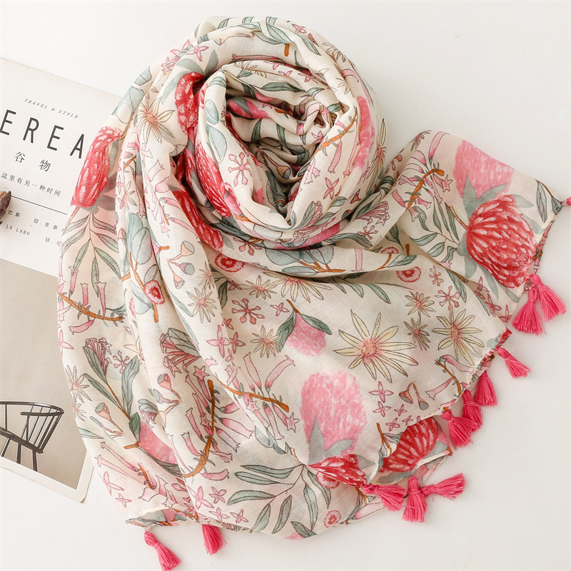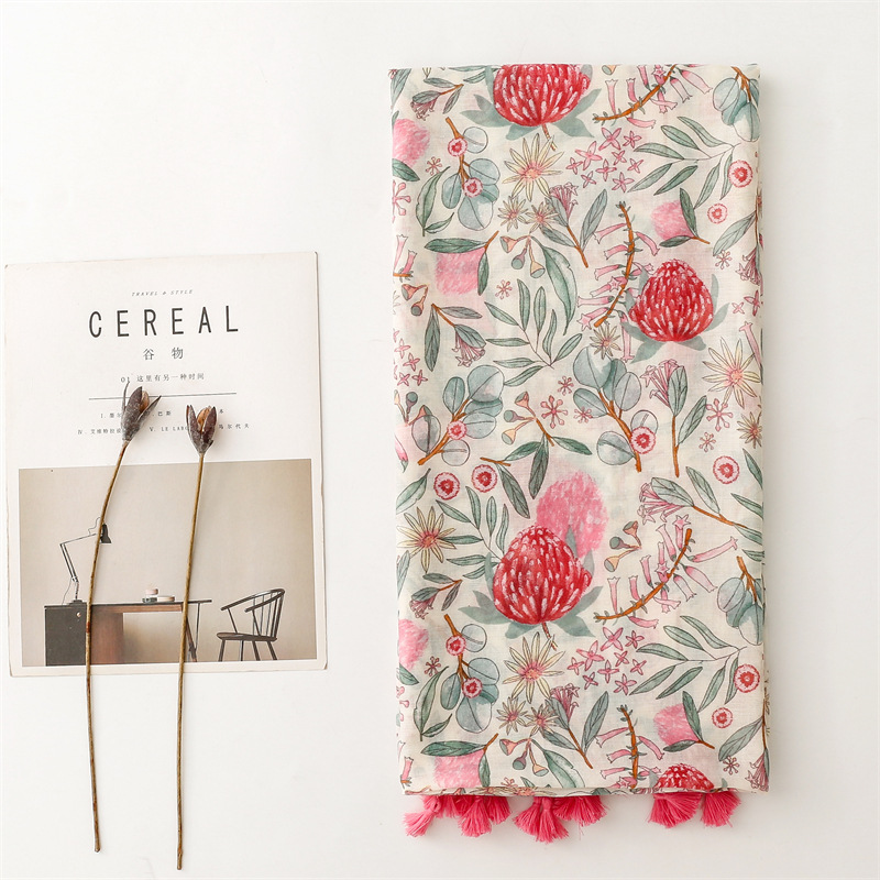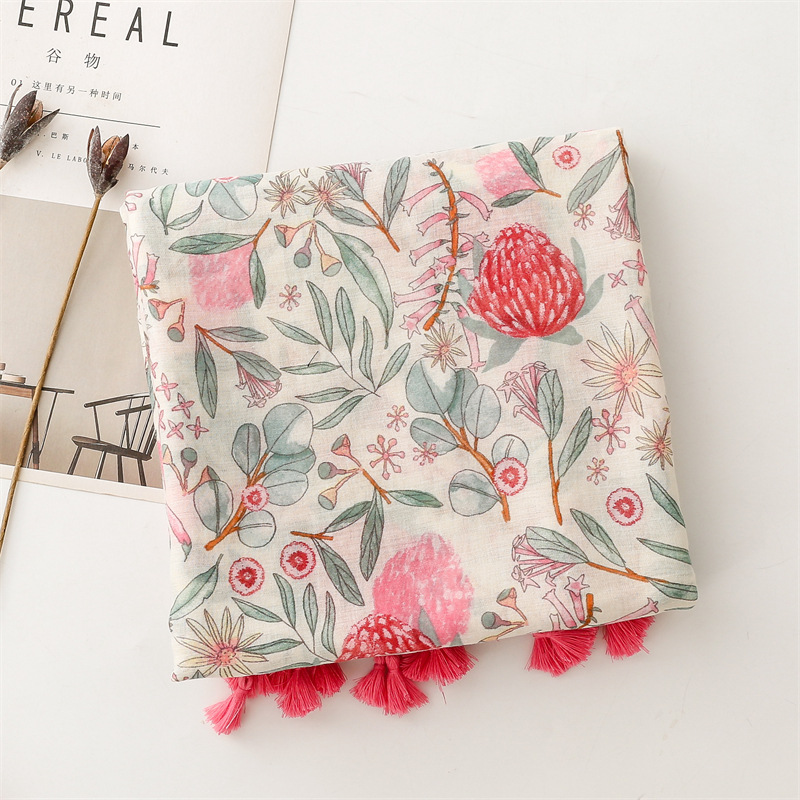 유럽과 미국은 프랑스면 및 린넨 손 스카프 작은 신선한 핑크 식물 꽃 술 스카프 따뜻한 목도리 여성을 수출합니다.스토어 가기