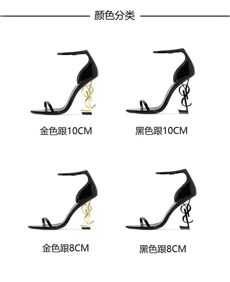 하이힐 샌들 여자 2023 년 여름 새로운 올 매치 골드 블랙 레터 힐 블랙 특허 가죽 조각 버클이 달린 하이힐 신발스토어 가기
