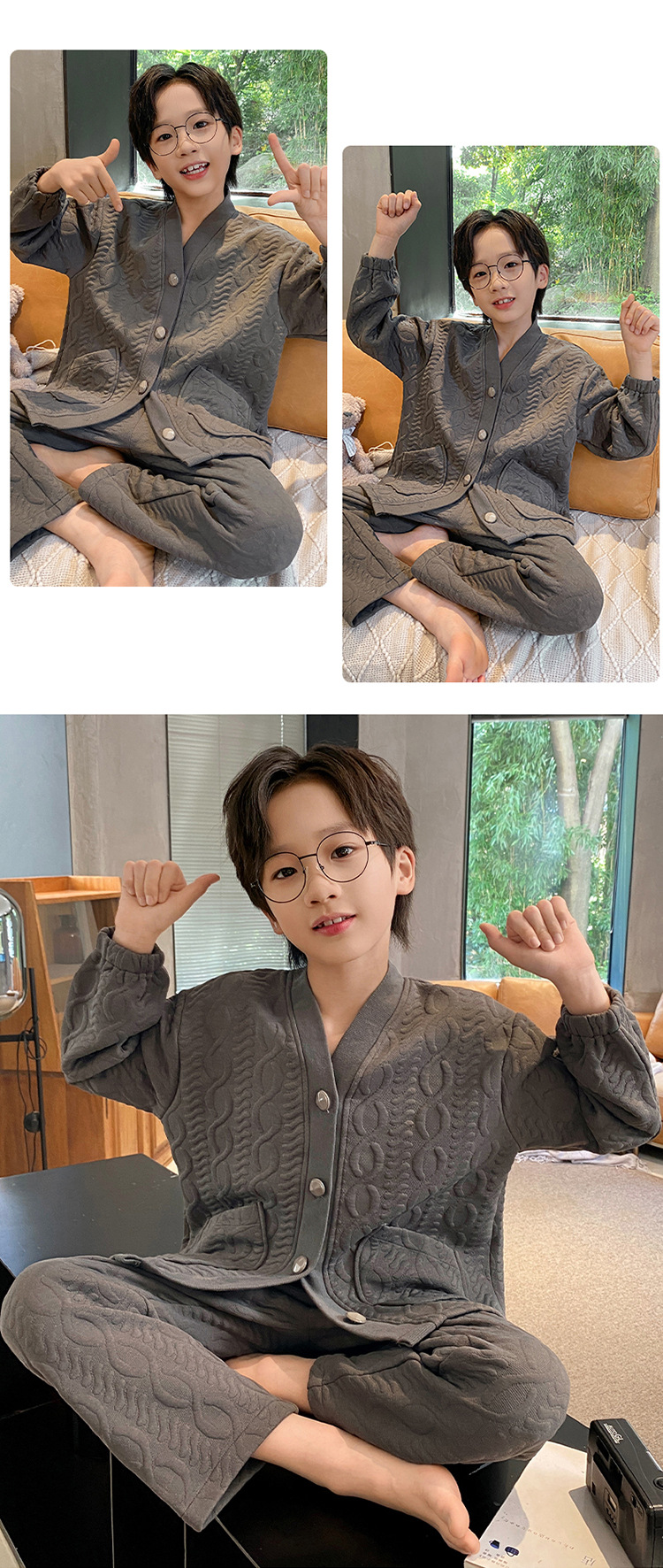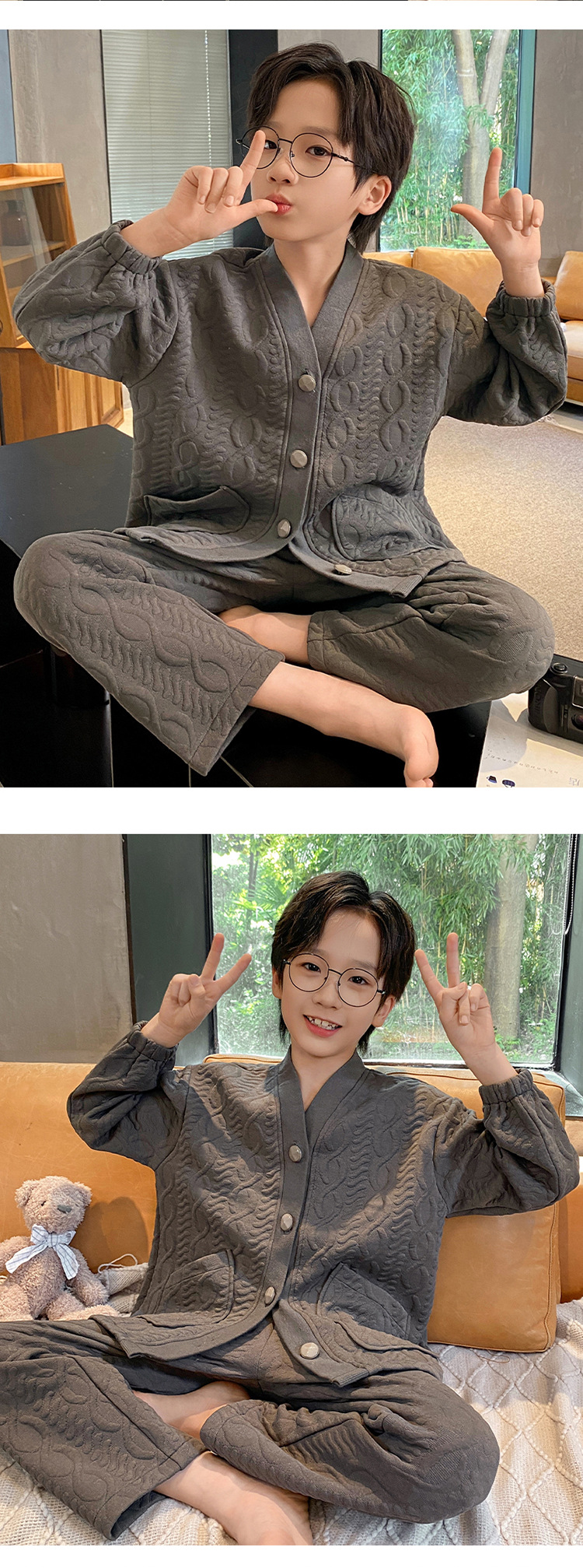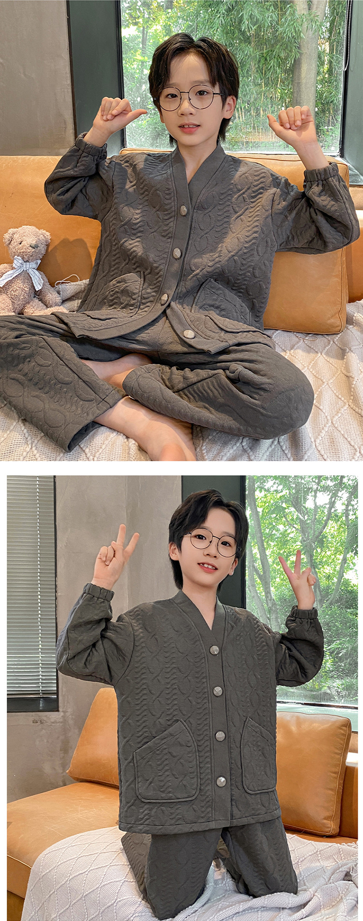 2024 겨울 새 시즌 소년 잠옷 봄 가을과 겨울 공기 면 긴 소매 소년의 홈 의류 세트 단색 캐주얼