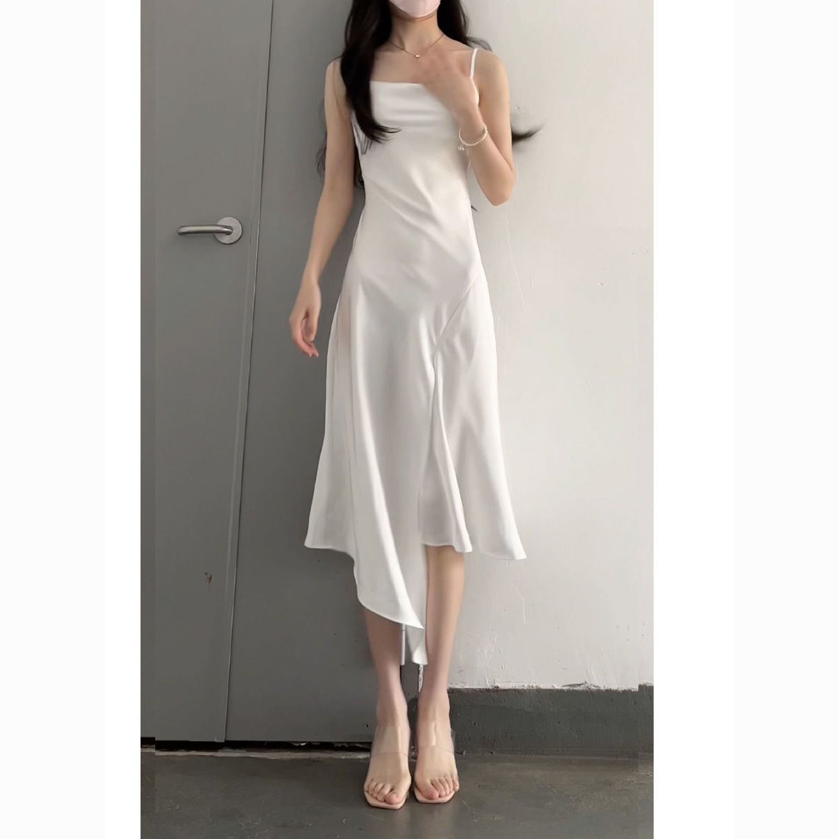 슬링 원피스 여성의 여름 화이트 새틴 우아한 분할 디자인 불규칙한 중간 길이 Jiatai