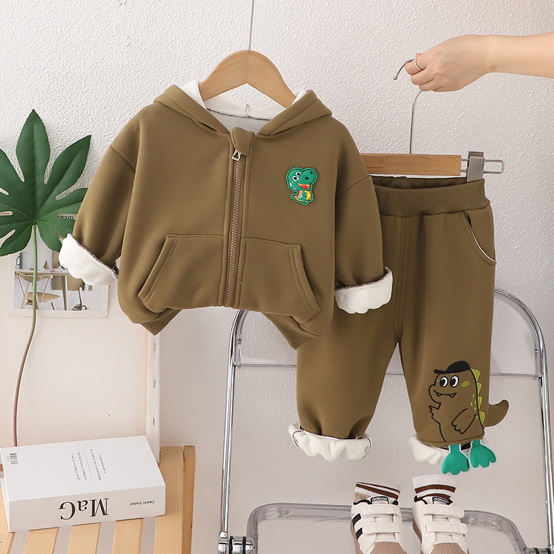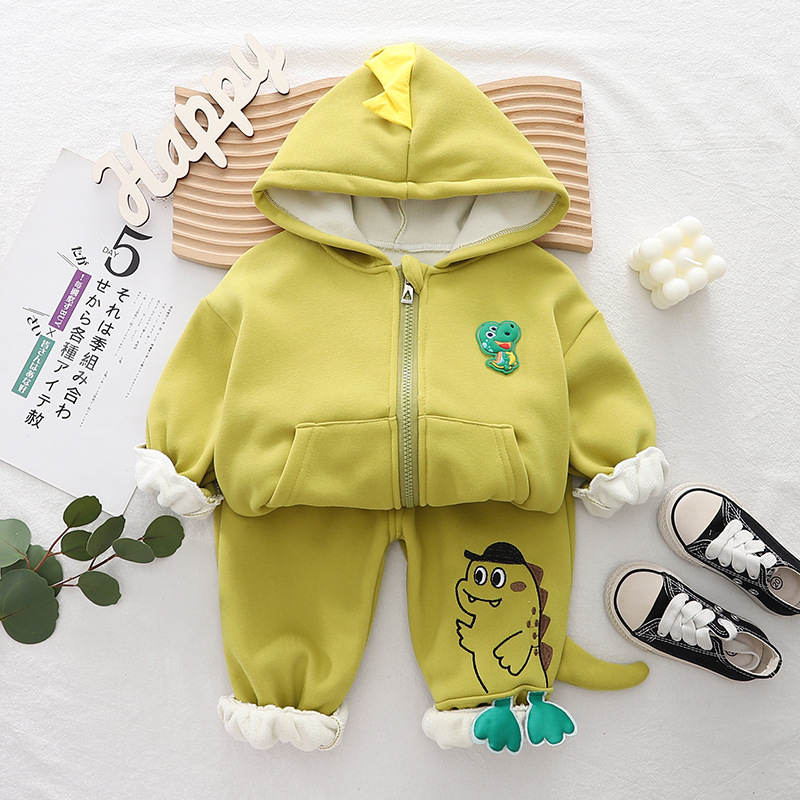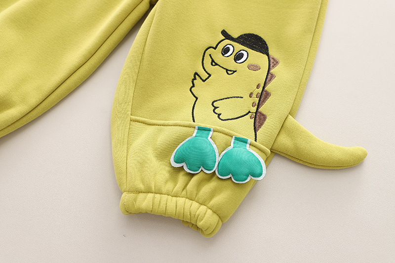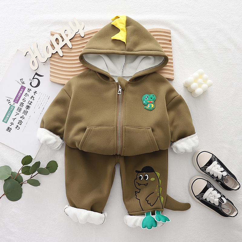 소년의 가을과 겨울 벨벳 세트 새로운 만화 캐주얼 어린이 공룡 후드 투피스 세트