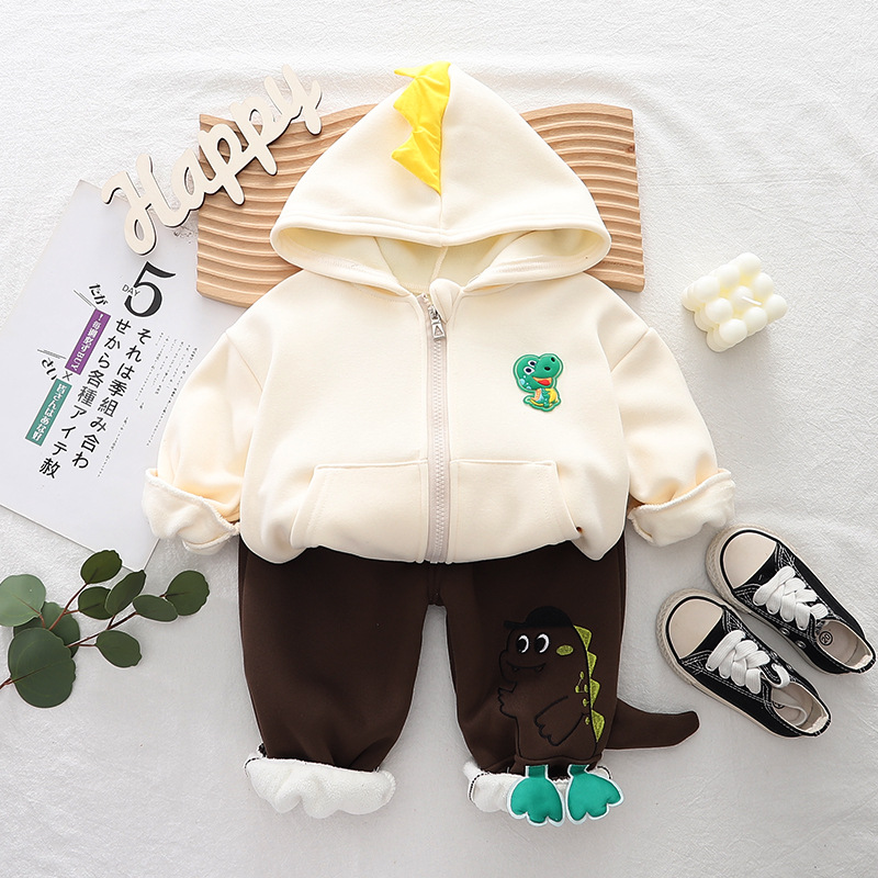 소년의 가을과 겨울 벨벳 세트 새로운 만화 캐주얼 어린이 공룡 후드 투피스 세트스토어 가기