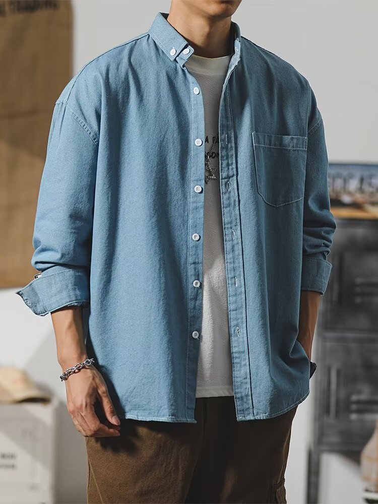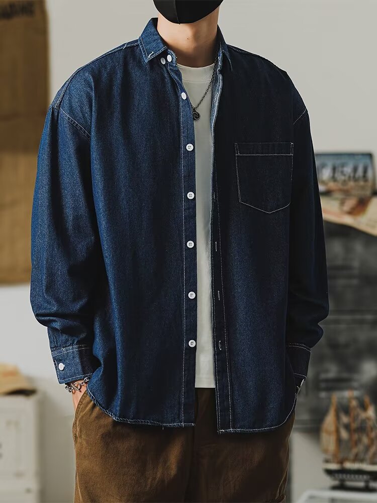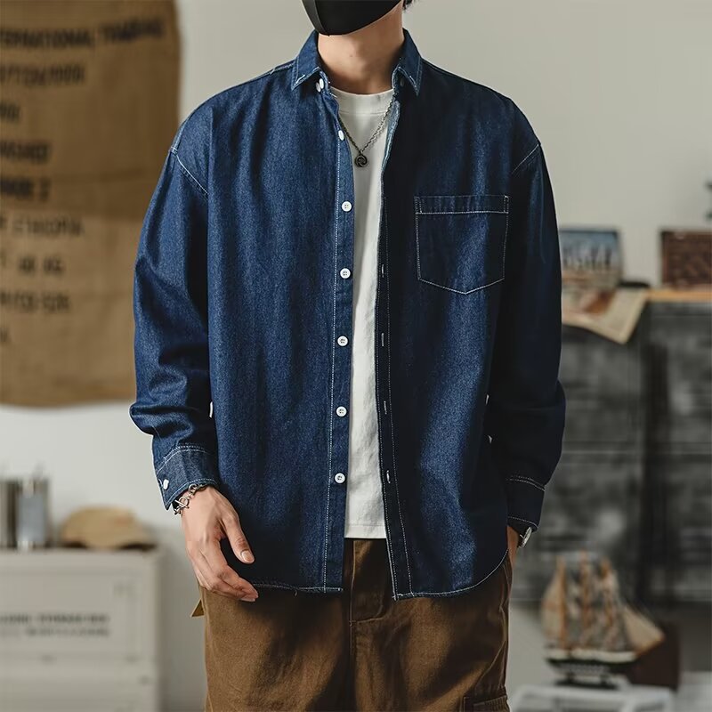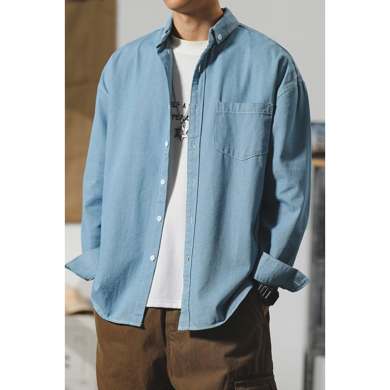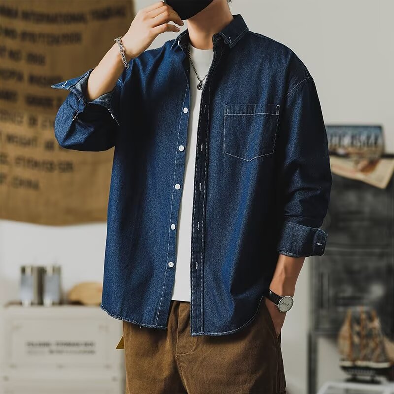 데님 셔츠 남자 유행 느슨한 핸섬 올 매치 긴팔 원피스 셔츠 홍콩 스타일 데님 코트 봄과 가을