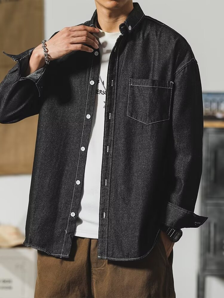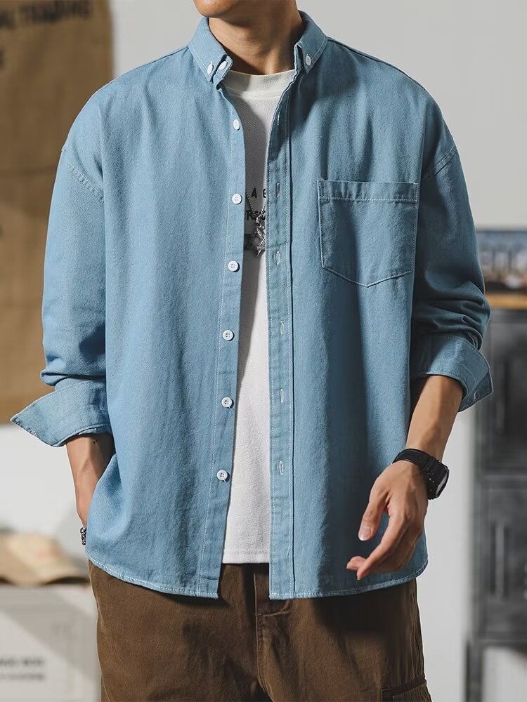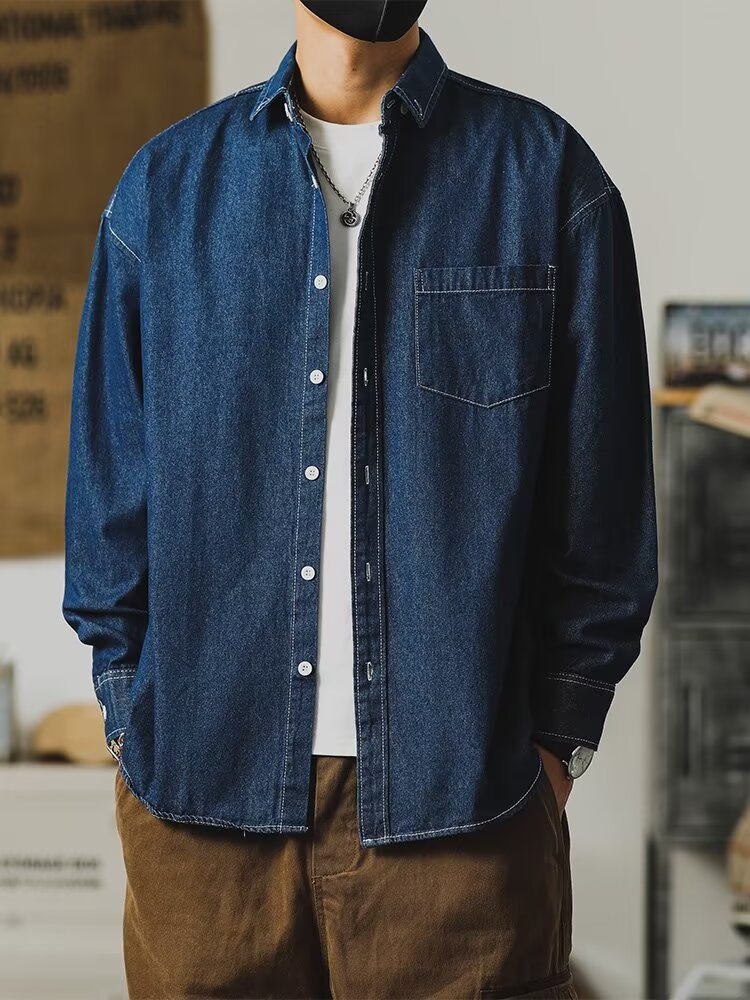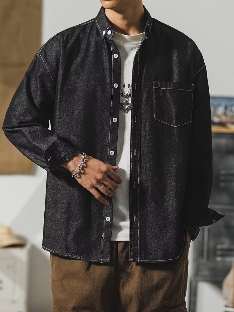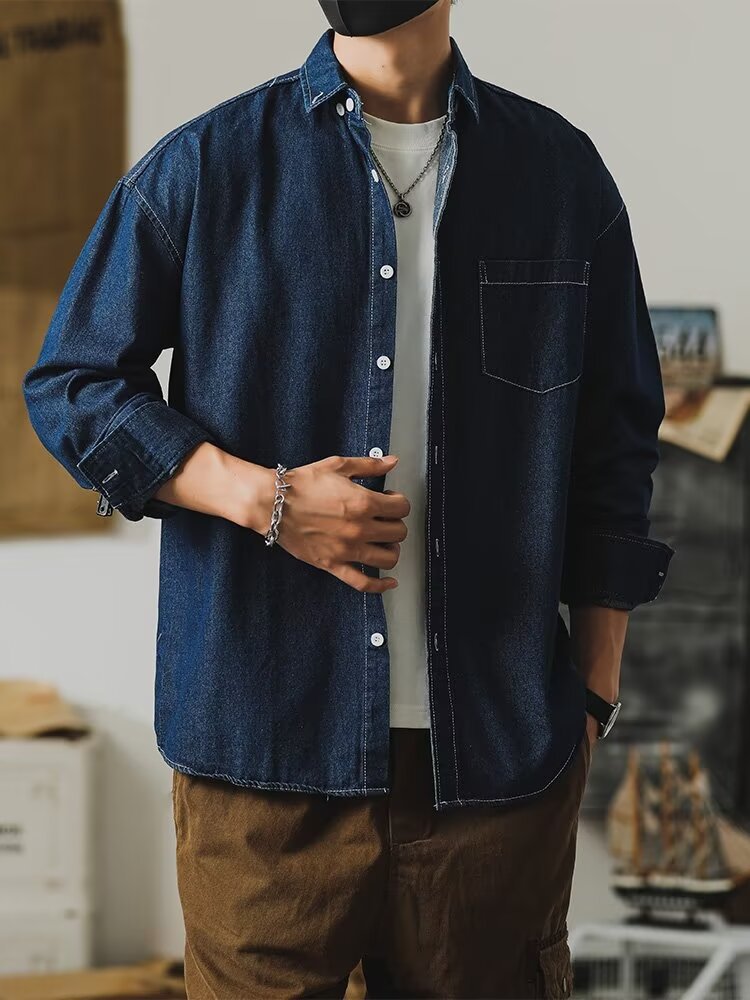 데님 셔츠 남자 유행 느슨한 핸섬 올 매치 긴팔 원피스 셔츠 홍콩 스타일 데님 코트 봄과 가을