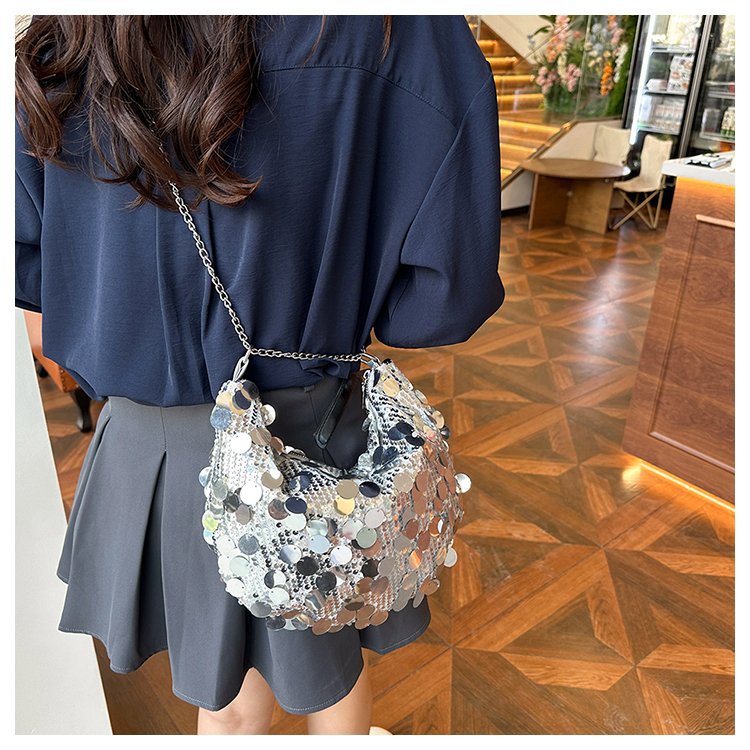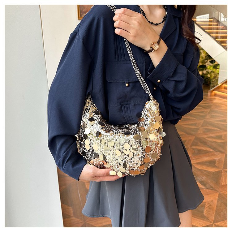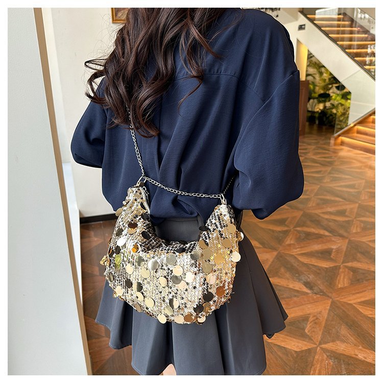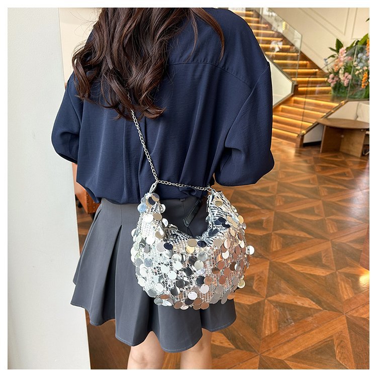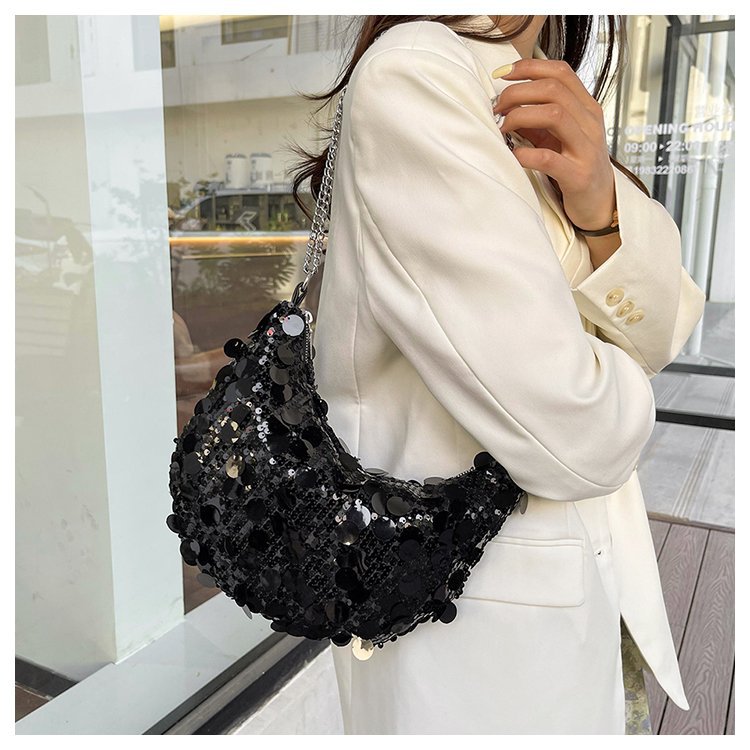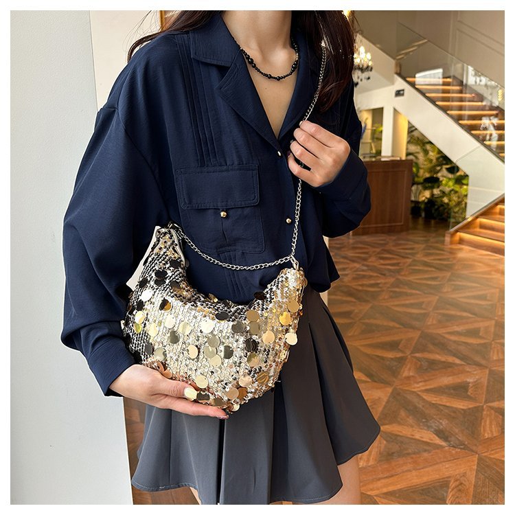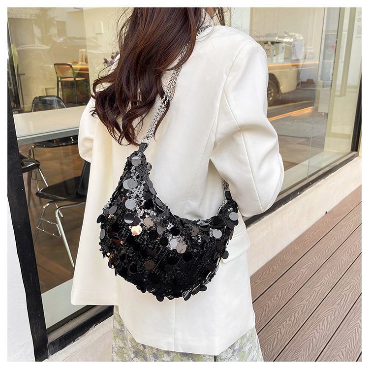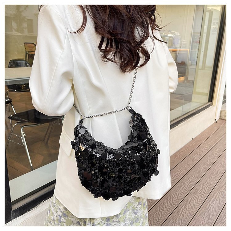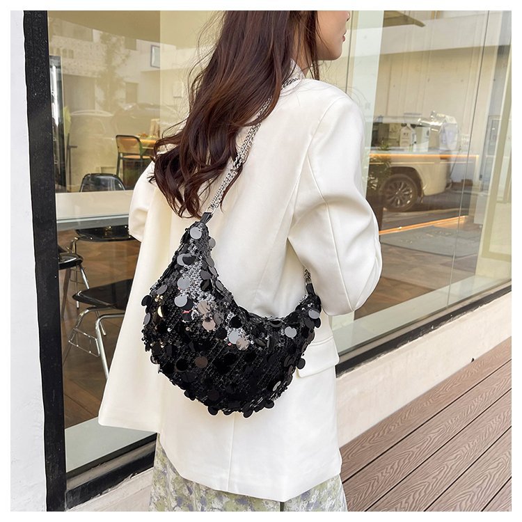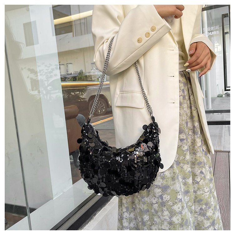 Sequin Bag 여성의 2024 봄 새로운 패션 간단한 체인 크로스 바디 백 캐주얼 크레센트 백 캐주얼 만두 백스토어 가기