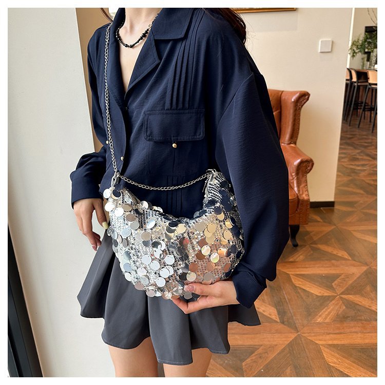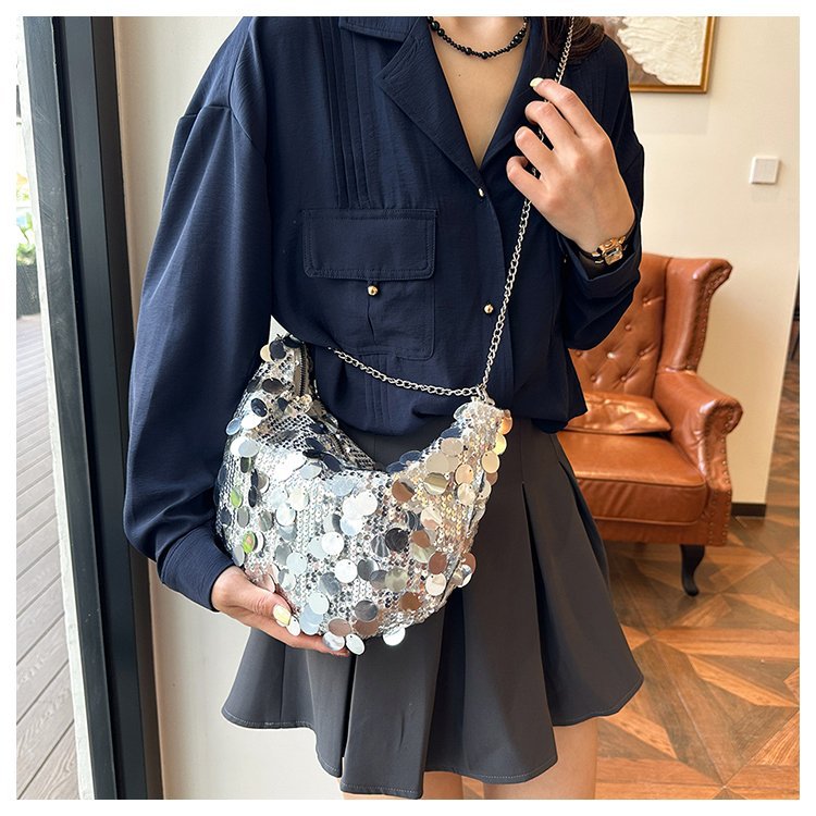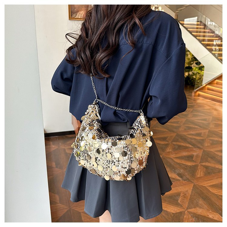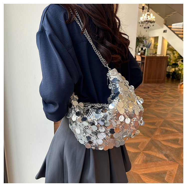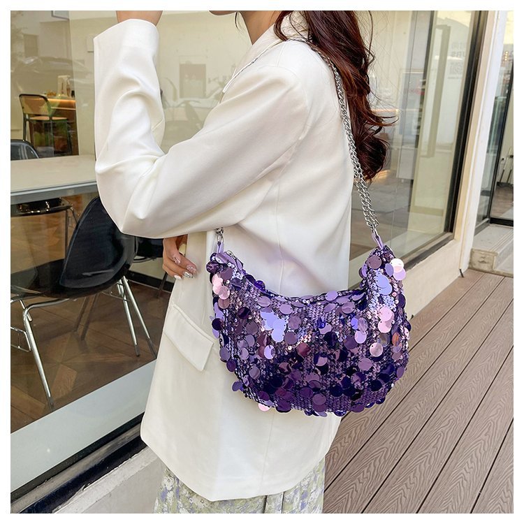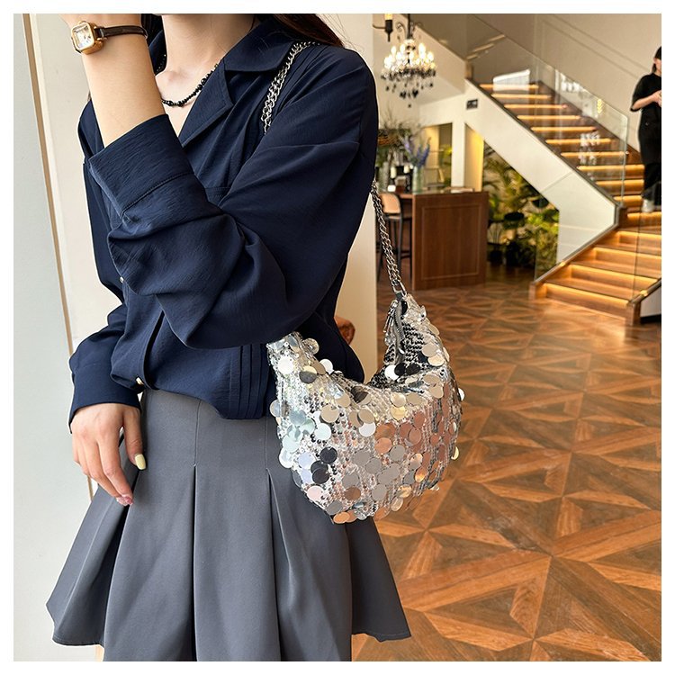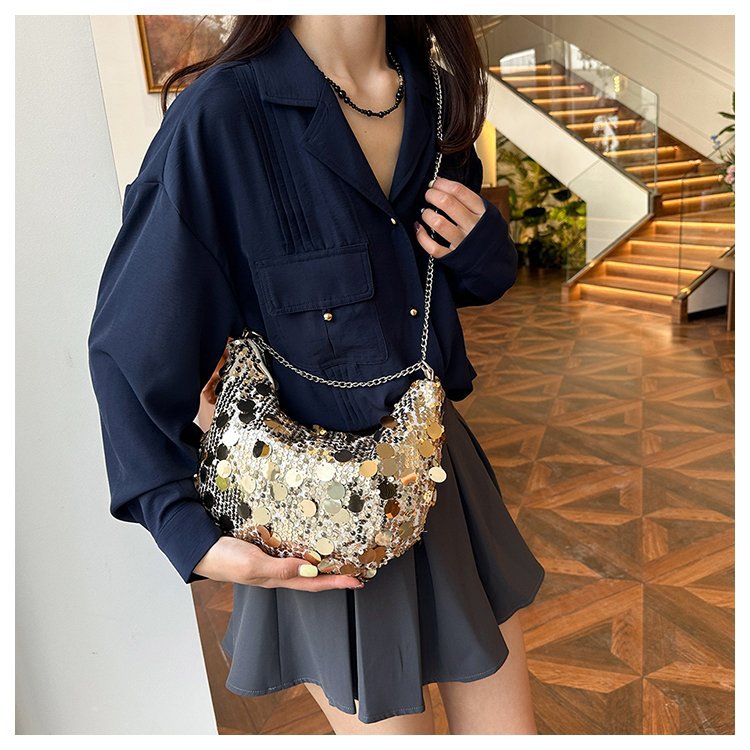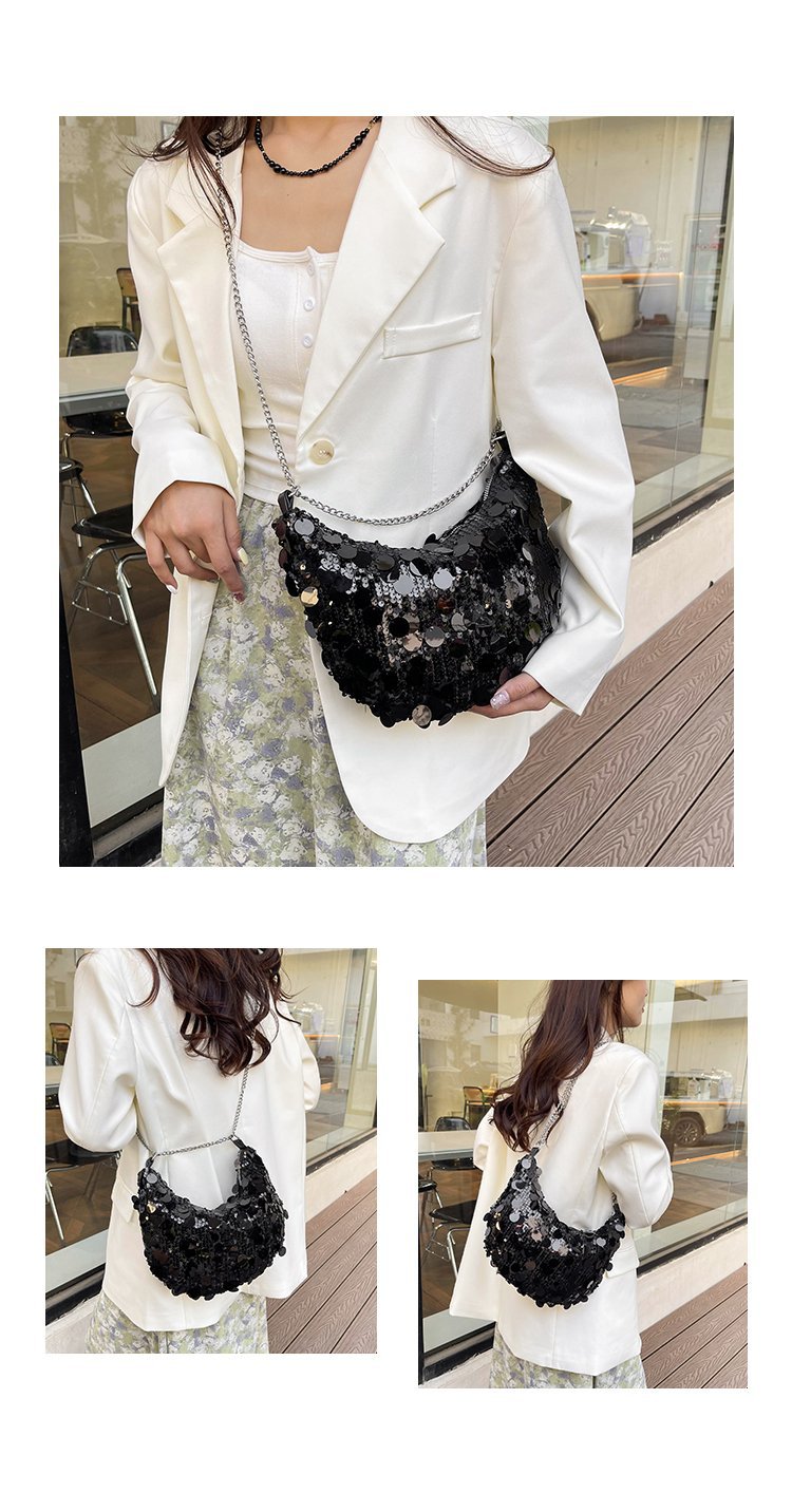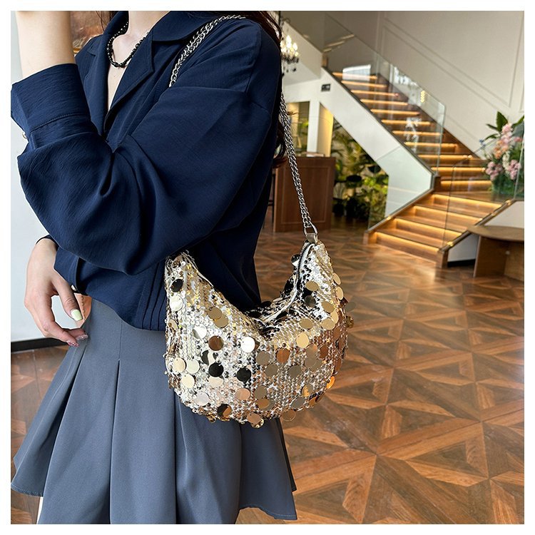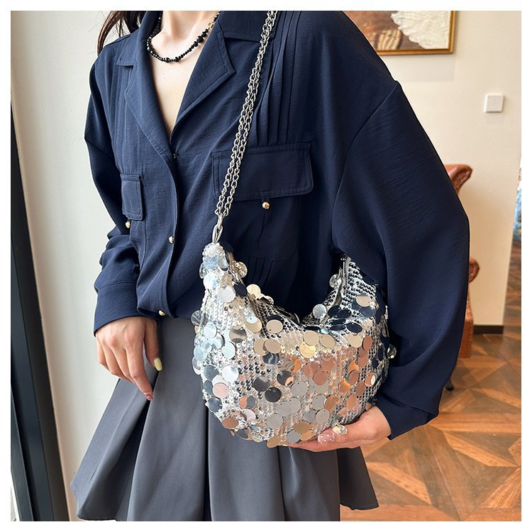 Sequin Bag 여성의 2024 봄 새로운 패션 간단한 체인 크로스 바디 백 캐주얼 크레센트 백 캐주얼 만두 백스토어 가기