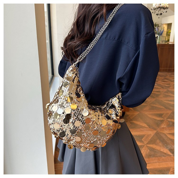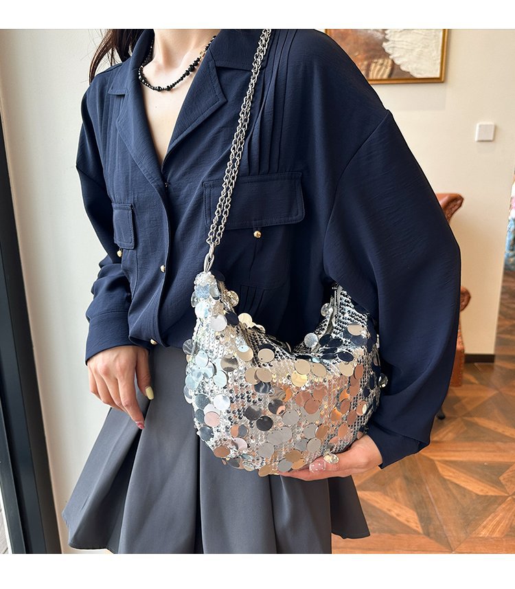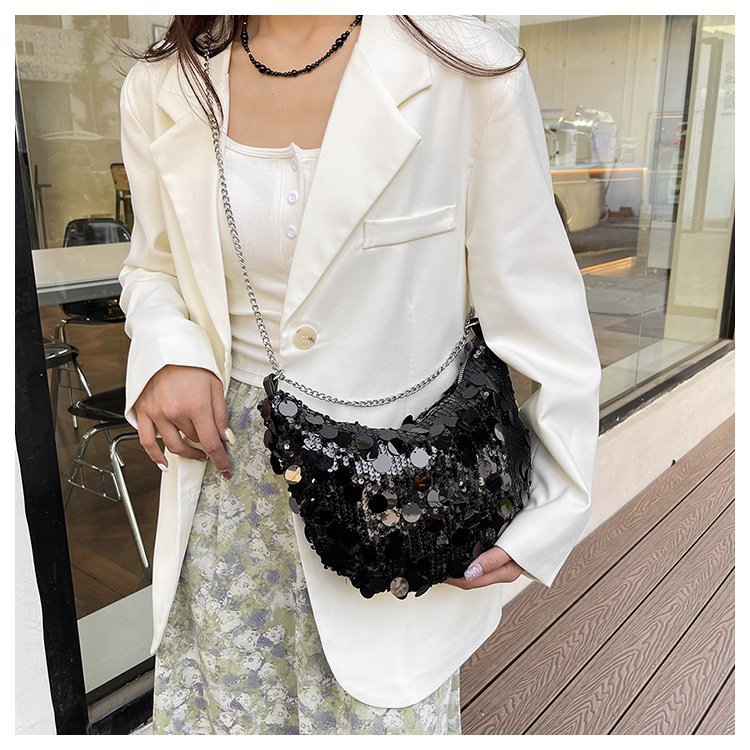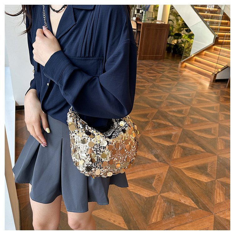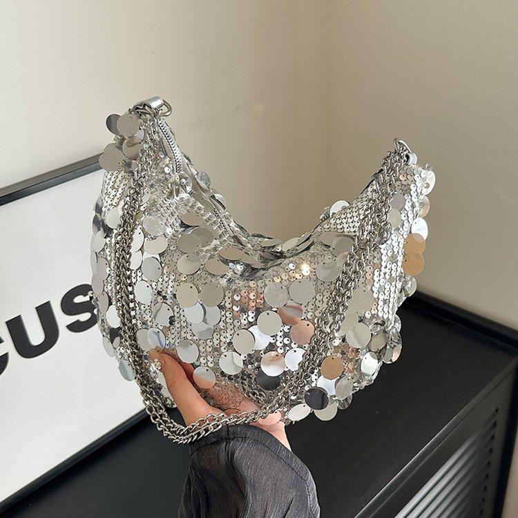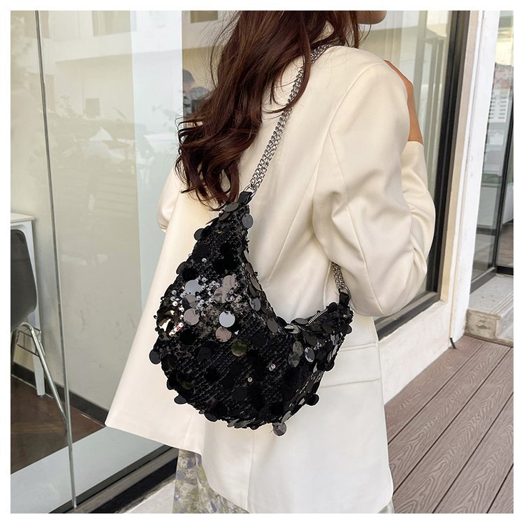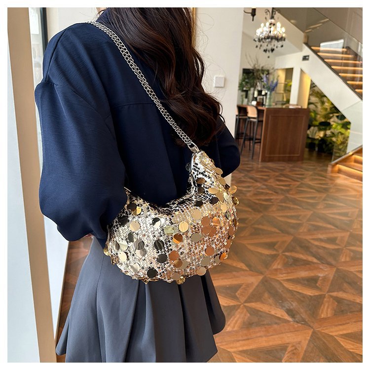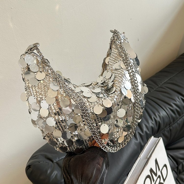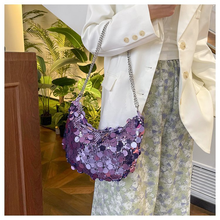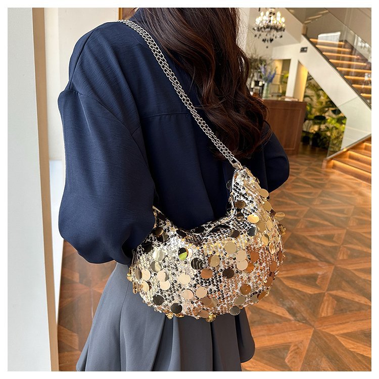 Sequin Bag 여성의 2024 봄 새로운 패션 간단한 체인 크로스 바디 백 캐주얼 크레센트 백 캐주얼 만두 백스토어 가기