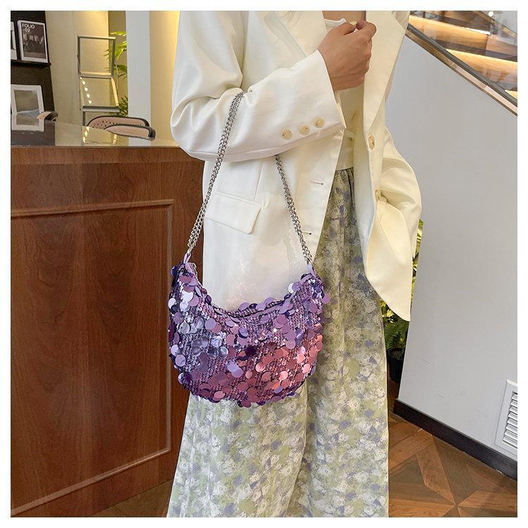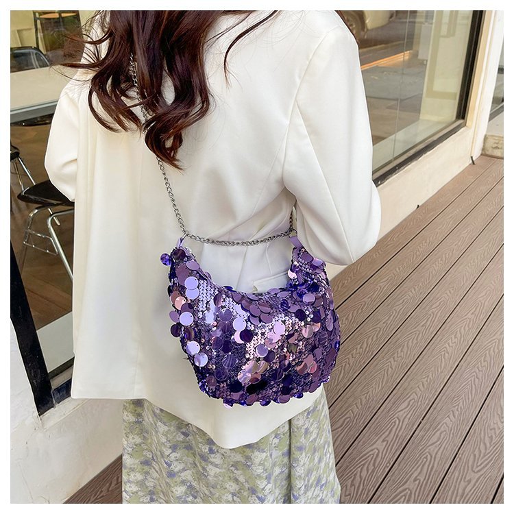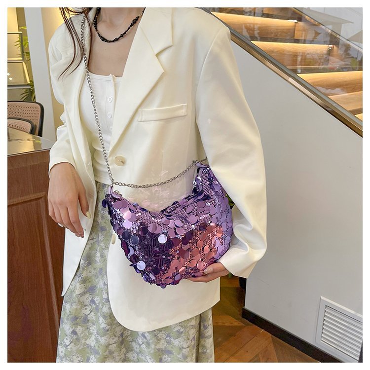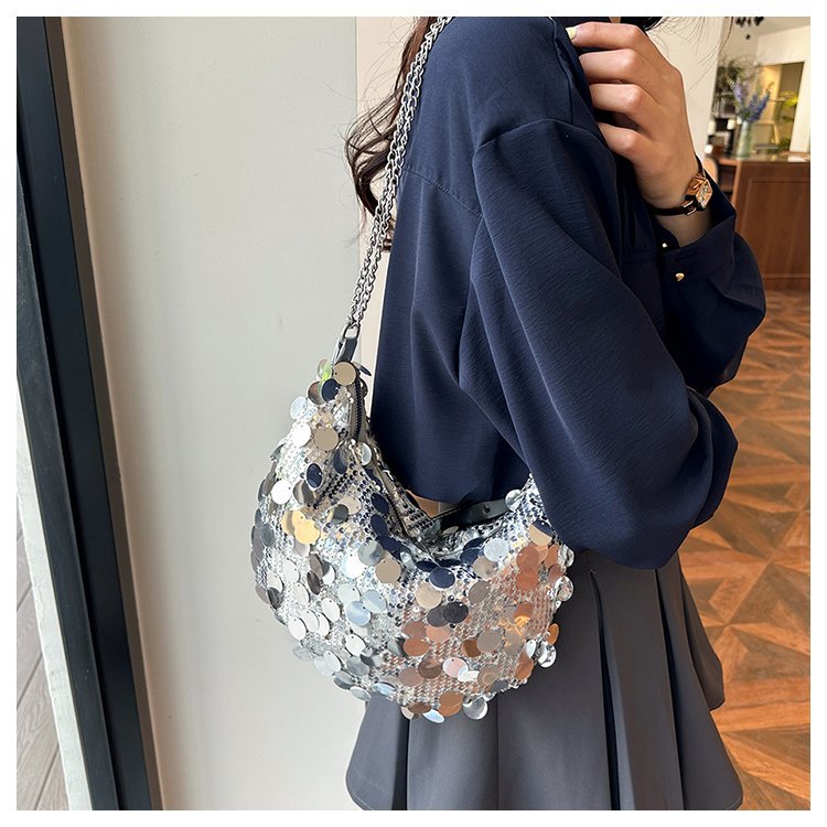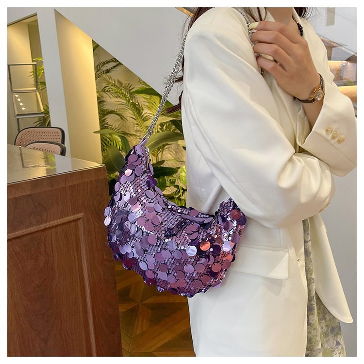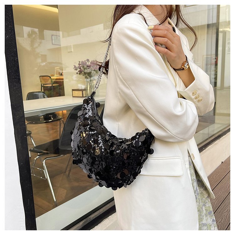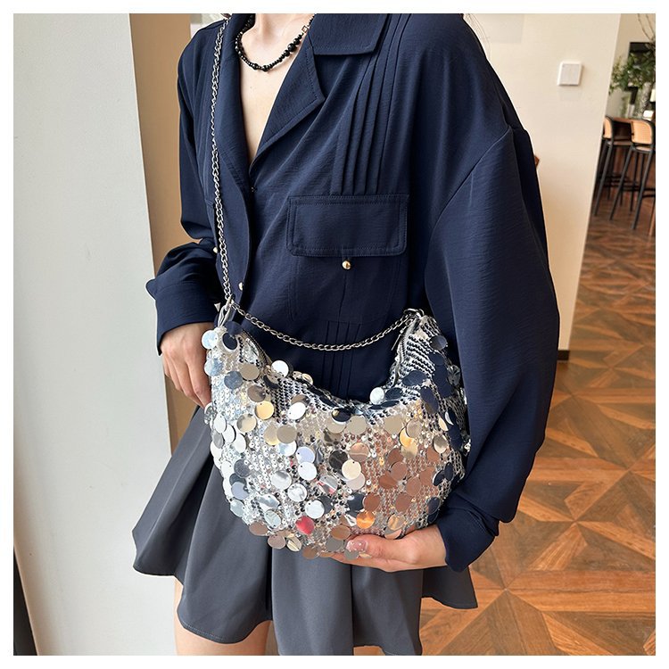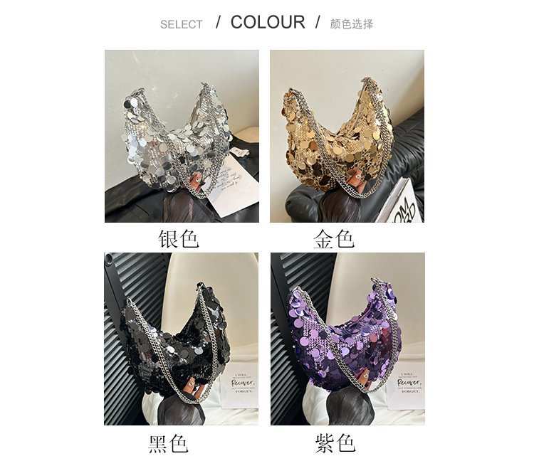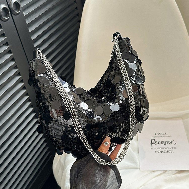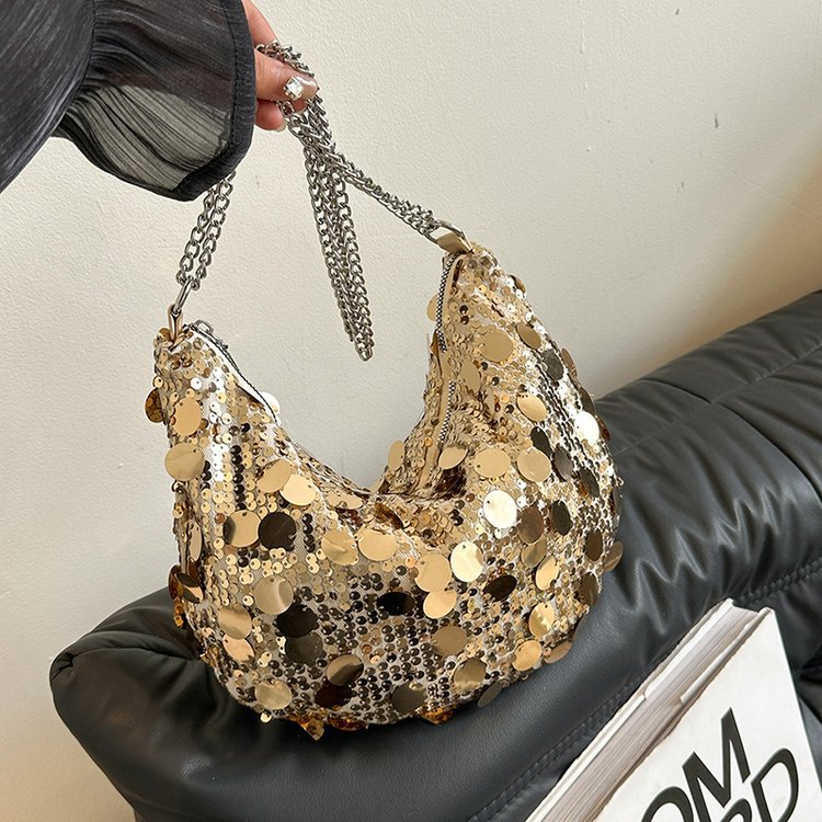 Sequin Bag 여성의 2024 봄 새로운 패션 간단한 체인 크로스 바디 백 캐주얼 크레센트 백 캐주얼 만두 백스토어 가기