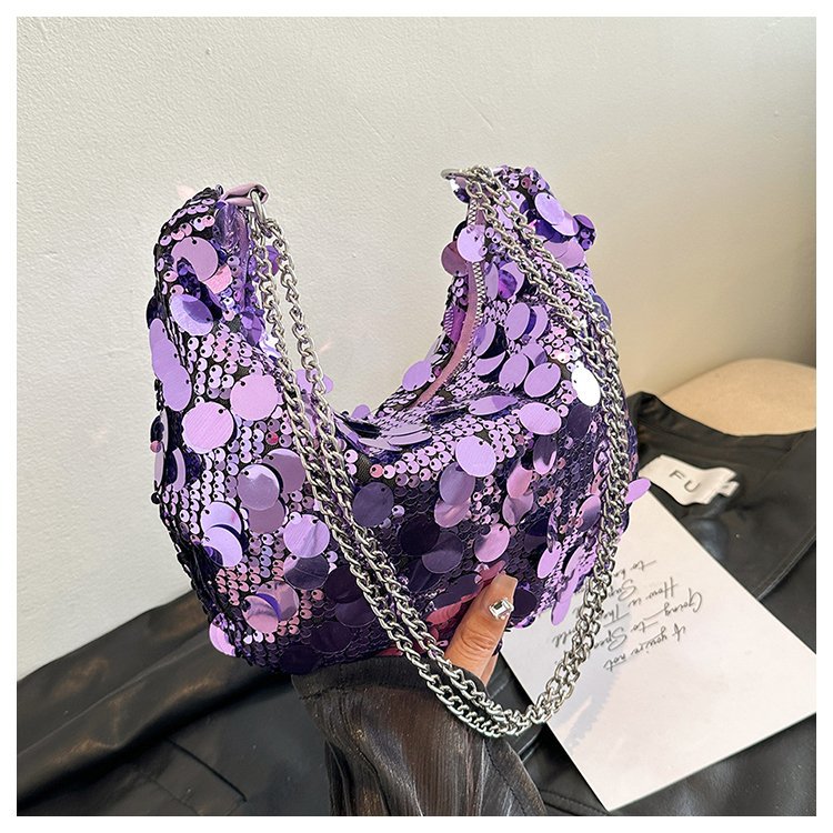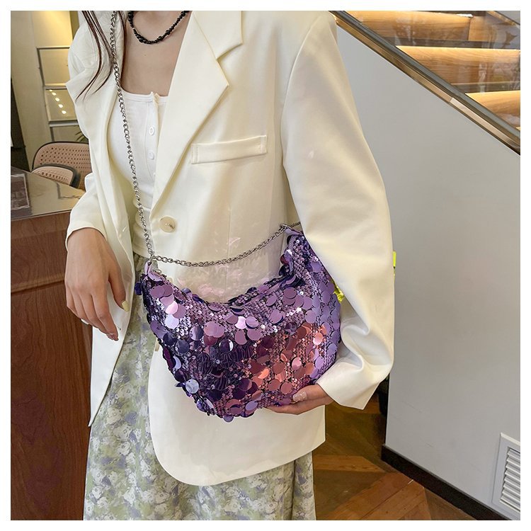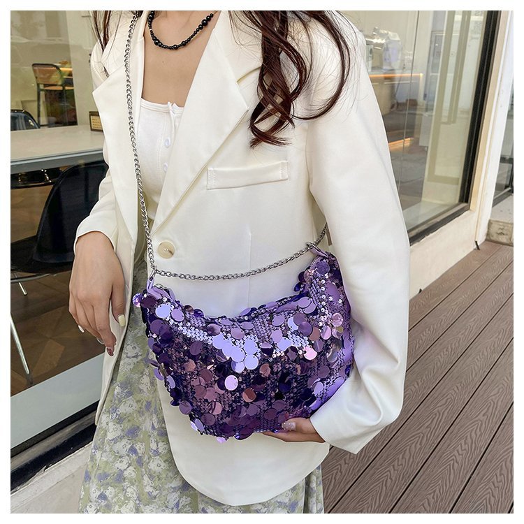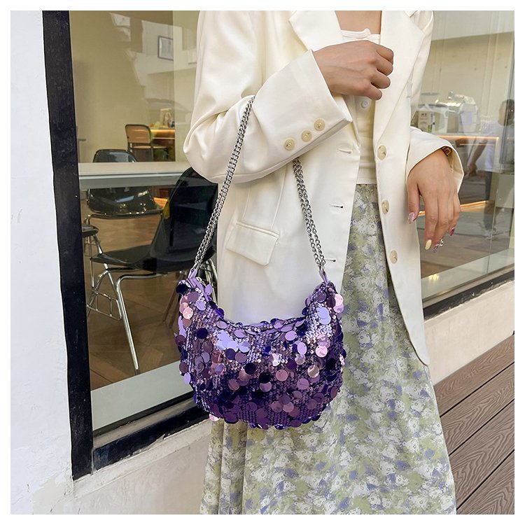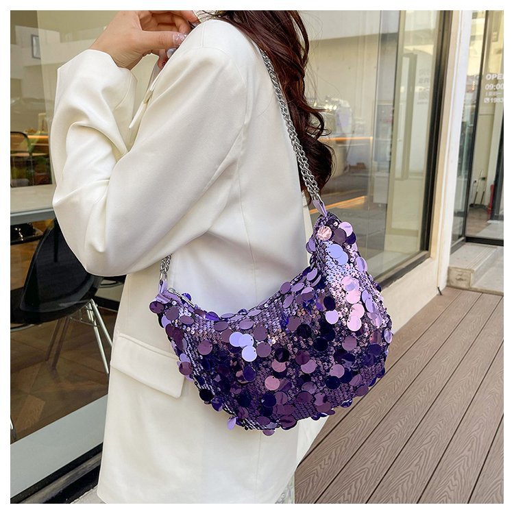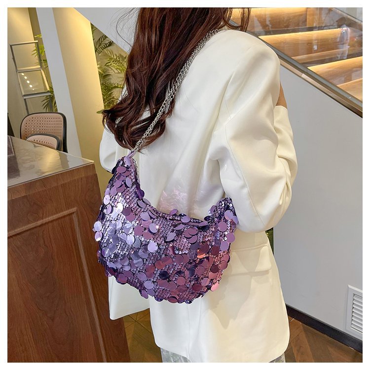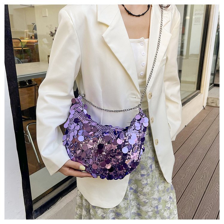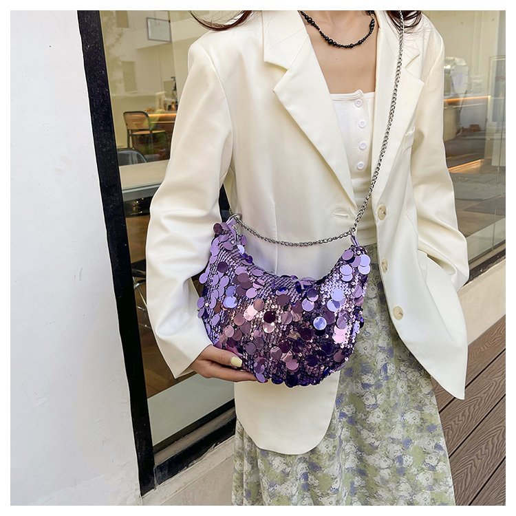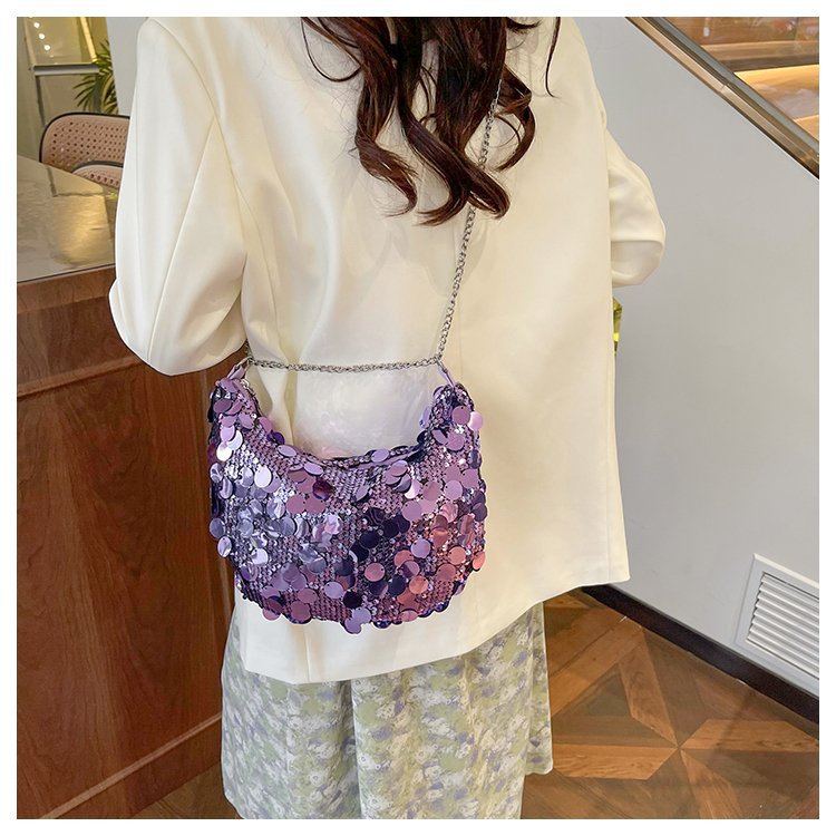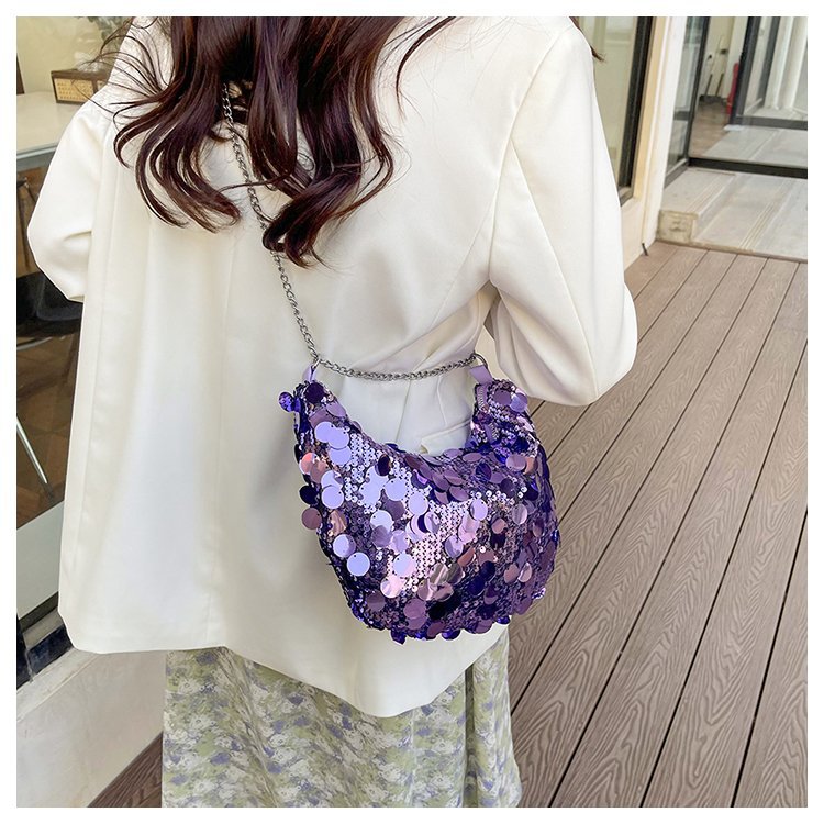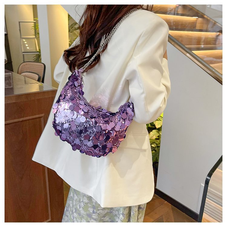 Sequin Bag 여성의 2024 봄 새로운 패션 간단한 체인 크로스 바디 백 캐주얼 크레센트 백 캐주얼 만두 백스토어 가기