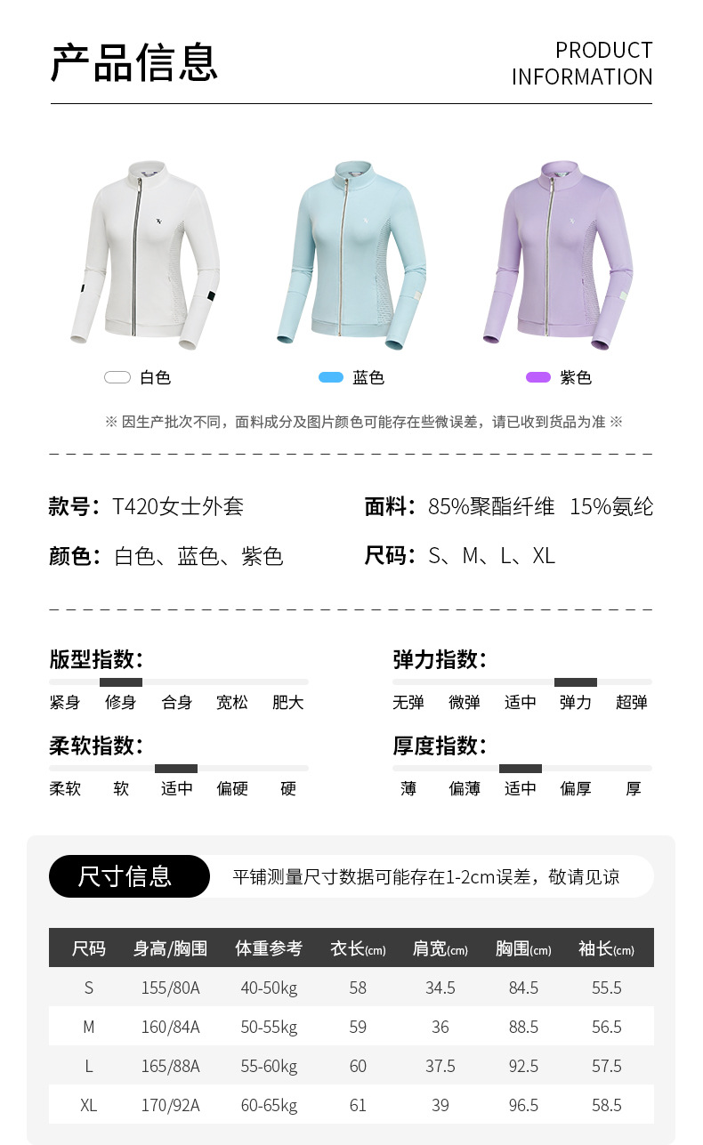 TTYGJ 골프 의류 여성 가을 겨울 야외 스포츠 재킷 싱글 레이어 방풍 칼라 골프 저지