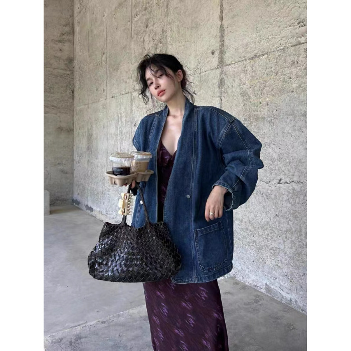 공식 그림 2024 이른 가을 새로운 복고풍 느슨한 디자인 센스 더블 브레스트 어깨 패드 데님 코트 여성용 재킷 탑스토어 가기