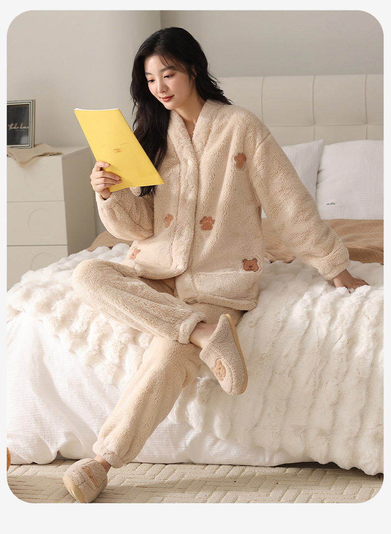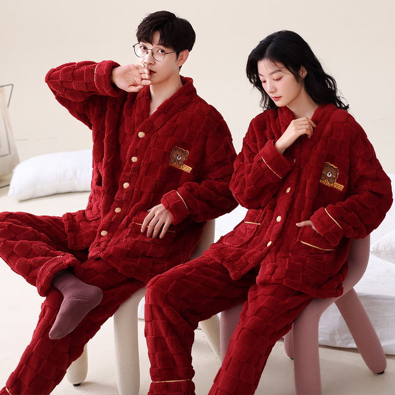 산호 양털 커플 잠옷 겨울 긴 소매 일본 기모노 플란넬 귀여운 만화 남성 홈 의류 세트스토어 가기