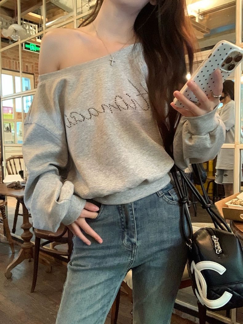 아메리칸 스타일 레트로 핫 라인스톤 한 캐릭터 칼라 땀 여성의 이른 가을 새로운 디자인 센스 틈새 짧은 긴 소매 탑