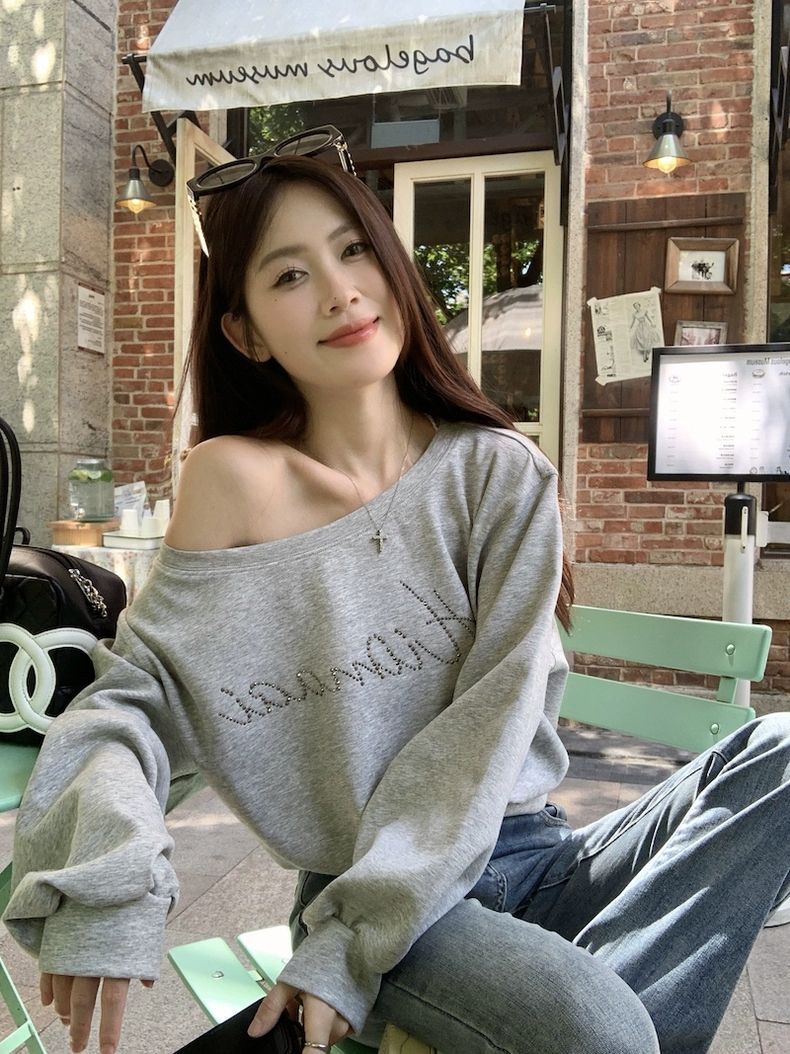 아메리칸 스타일 레트로 핫 라인스톤 한 캐릭터 칼라 땀 여성의 이른 가을 새로운 디자인 센스 틈새 짧은 긴 소매 탑스토어 가기