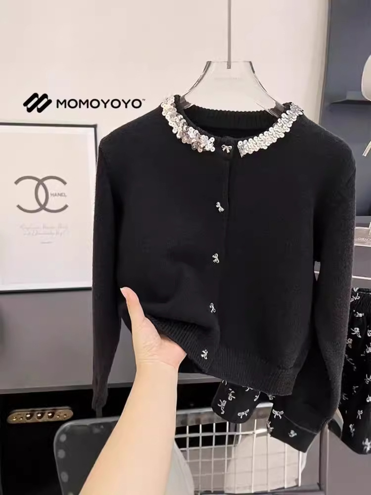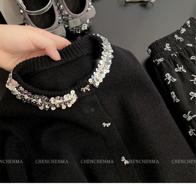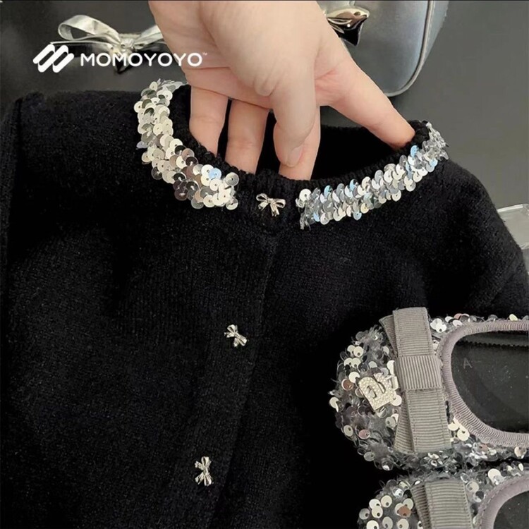 소녀 새로운 2024 샤넬 스타일 긴 소매 니트 스웨터 소녀 짧은 블랙 니트 카디건 코트 탑스토어 가기