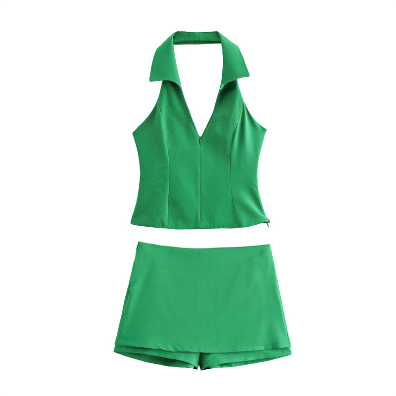 대외 무역 2024 여름 새로운 여성 V-목 섹시 리키 등 목 작은 탑 라미네이션 스커트 세트 2796777