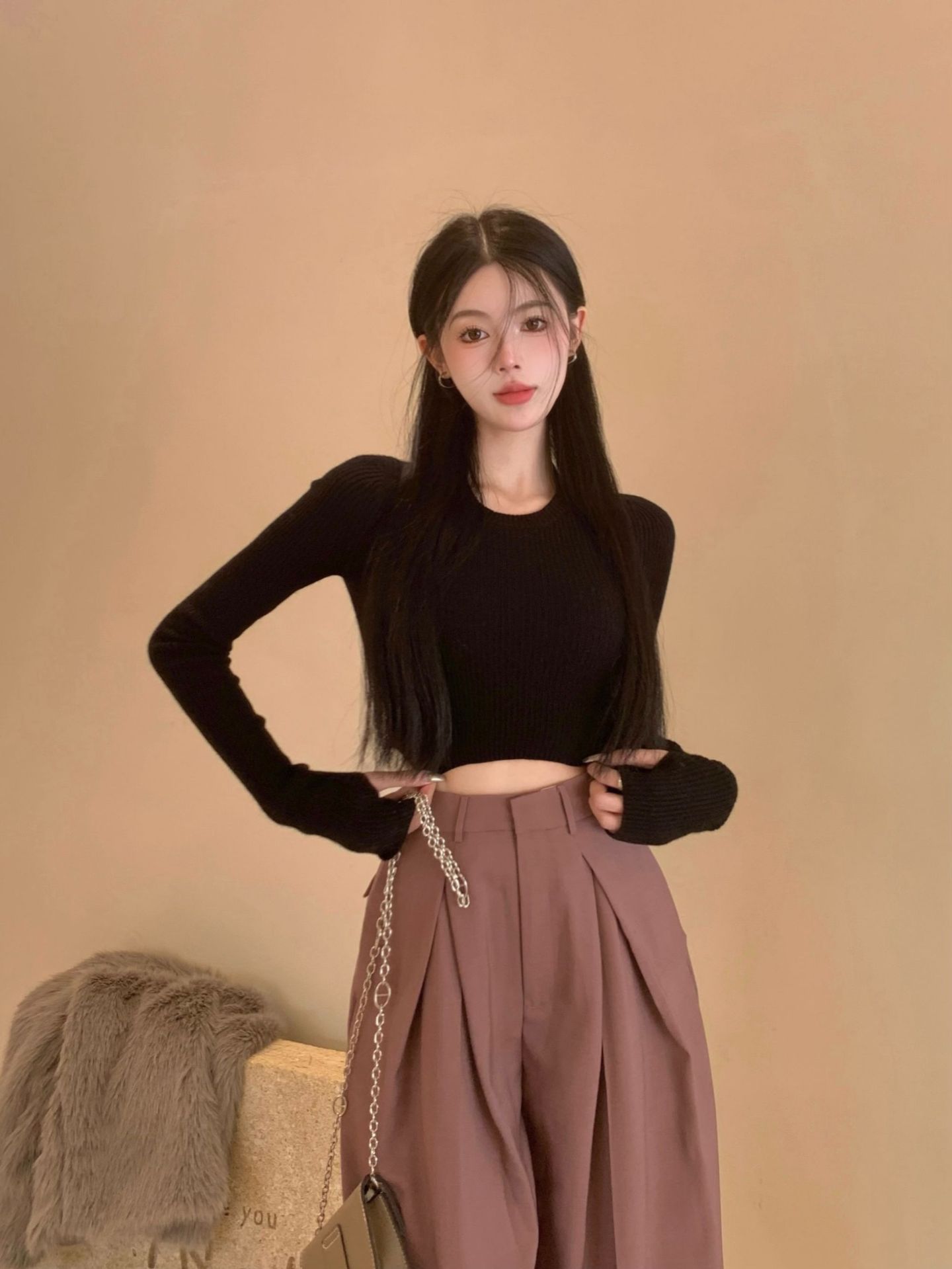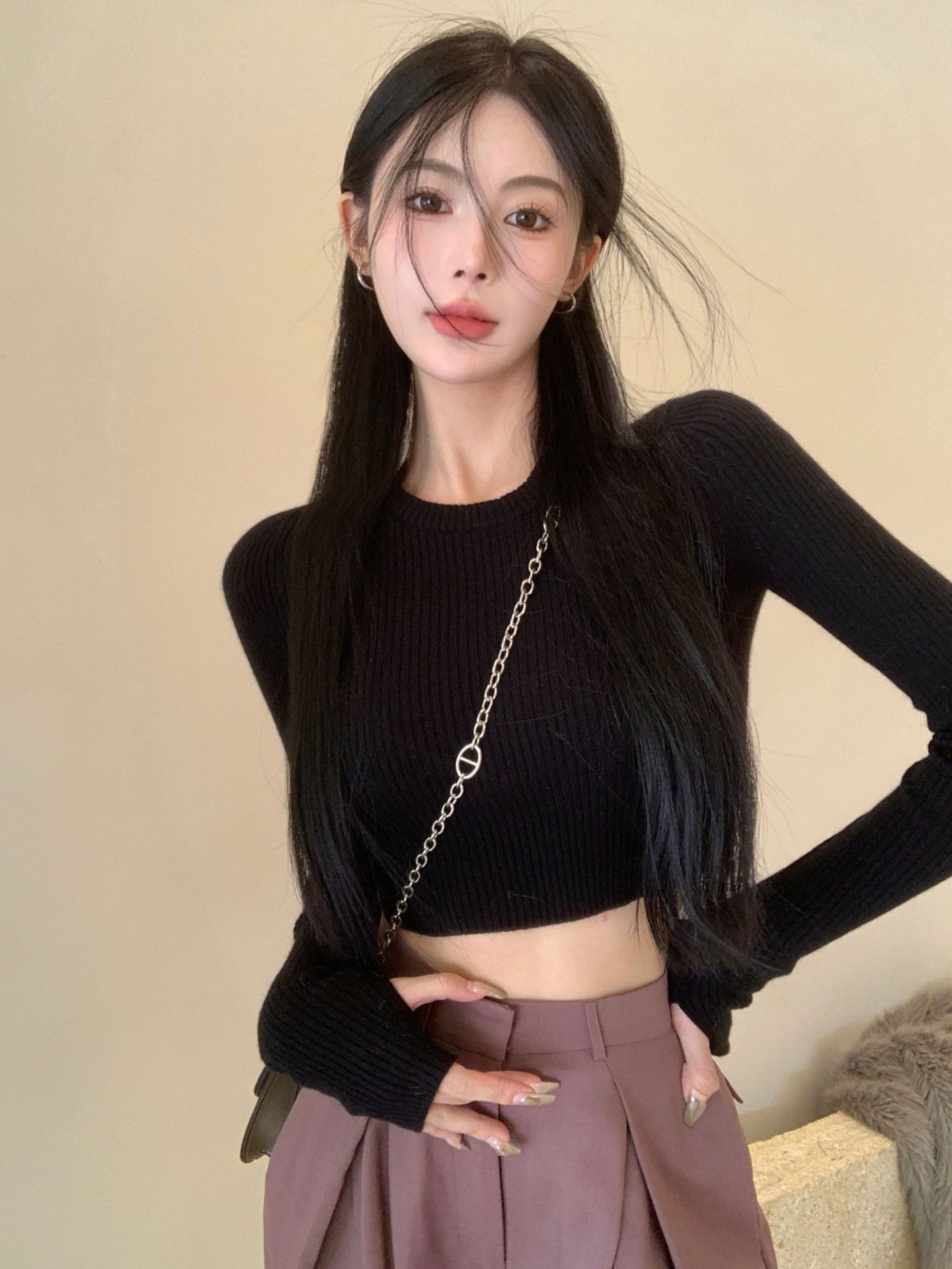 여성용 긴팔 니트베이스 셔츠 2024 여성용 슬림핏 슬리밍 쇼트 탑이있는 새로운 소프트 왁스 스웨터