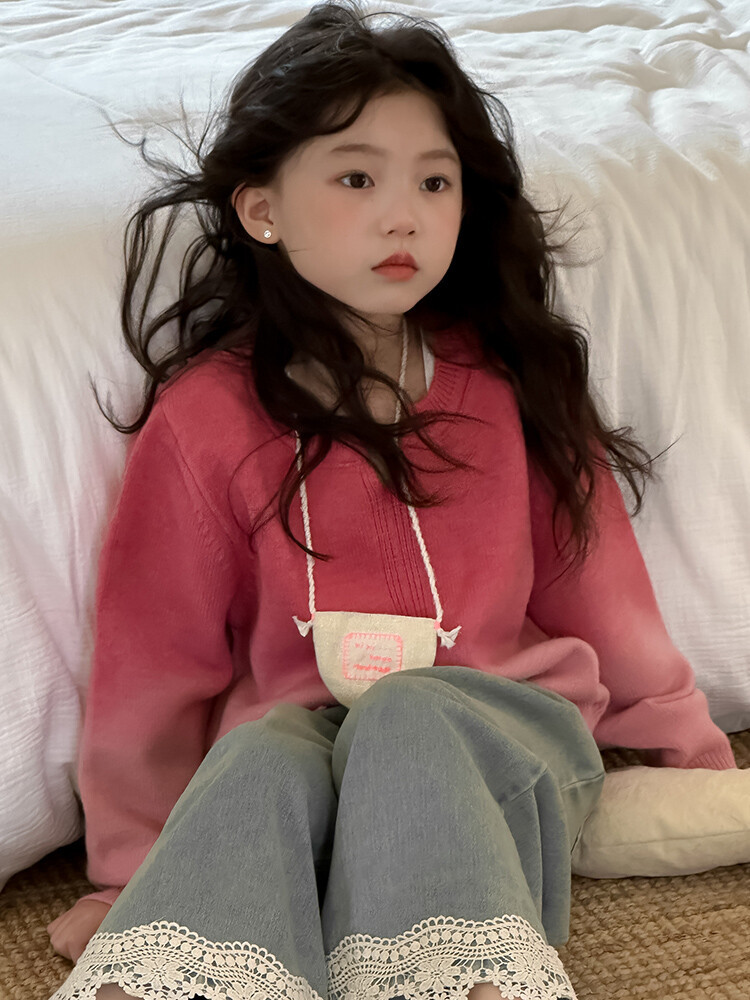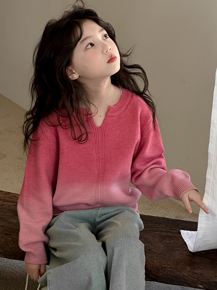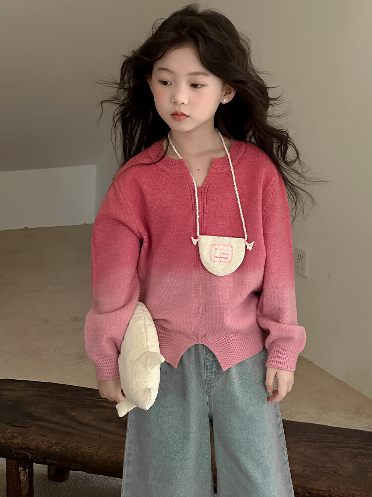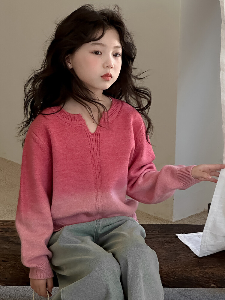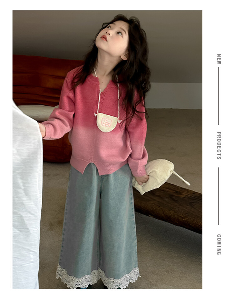 2024 년 가을과 겨울을위한 소녀 그라디언트 니트 스웨터 청바지 2 피스 세트 어린이 유행 서양식 탑 세트