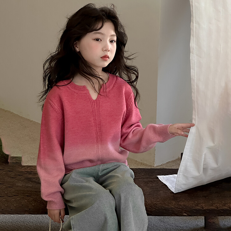 2024 년 가을과 겨울을위한 소녀 그라디언트 니트 스웨터 청바지 2 피스 세트 어린이 유행 서양식 탑 세트스토어 가기