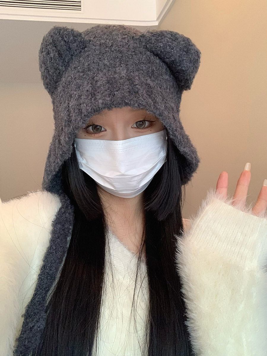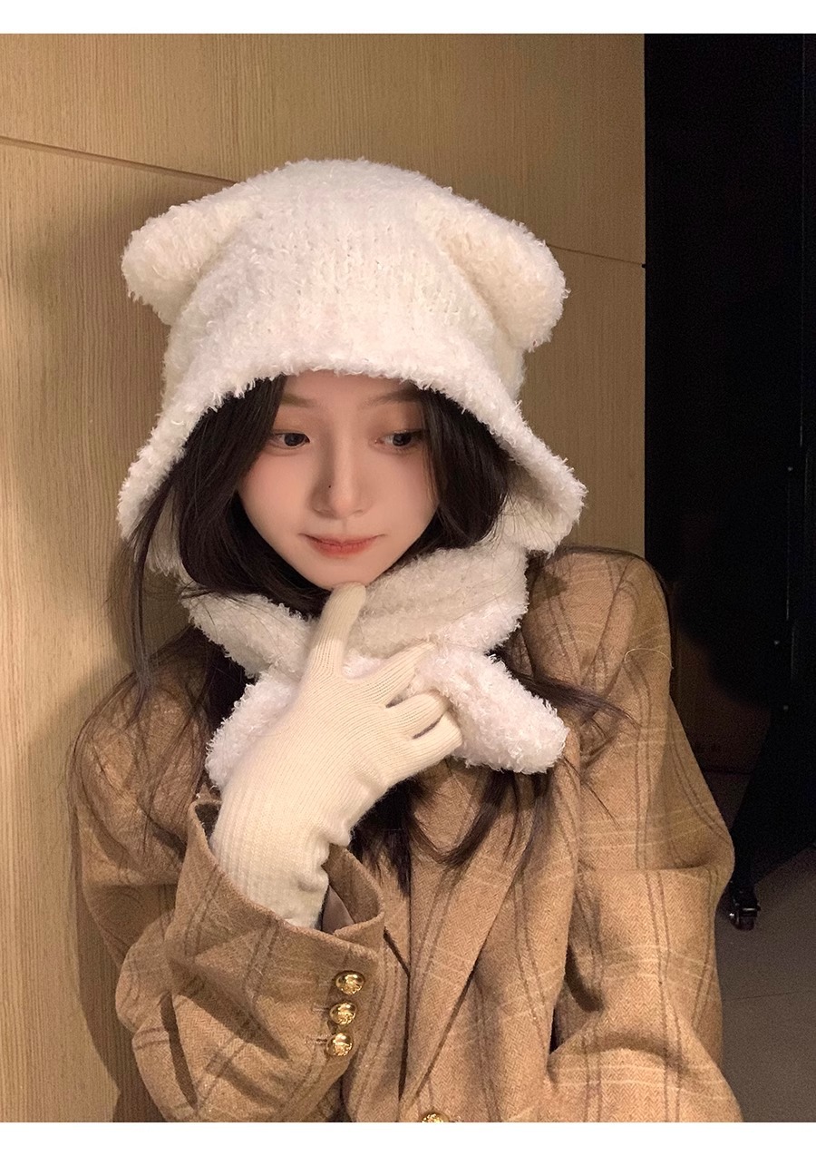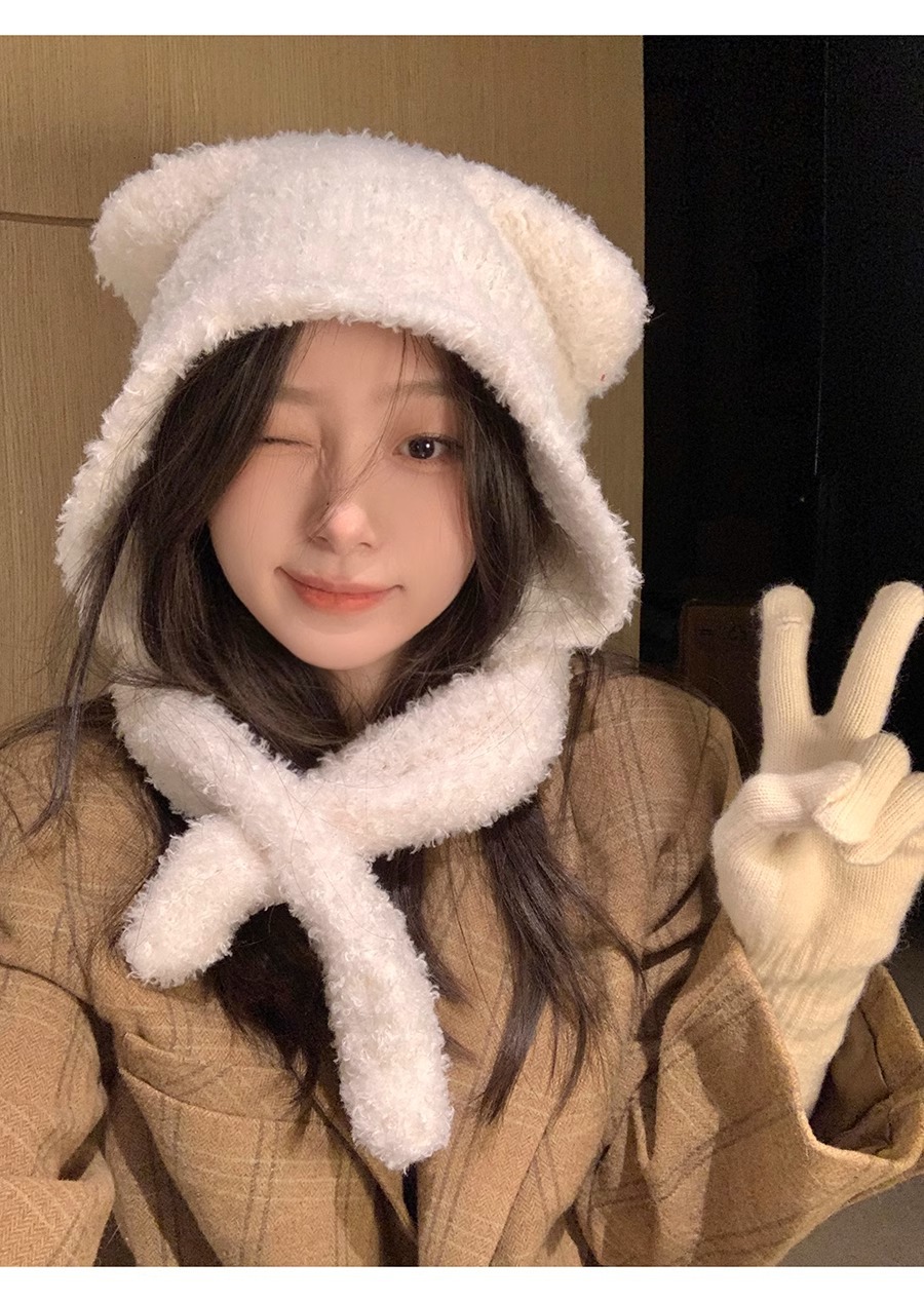 Waxy Jiji Bear Ear Fluffy Hat 여성의 겨울 방한 귀 보호 모자 스카프 원피스 귀여운 올 매치 레이 펑 모자