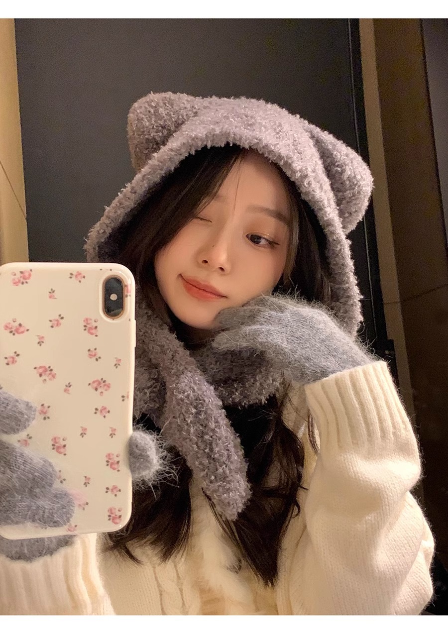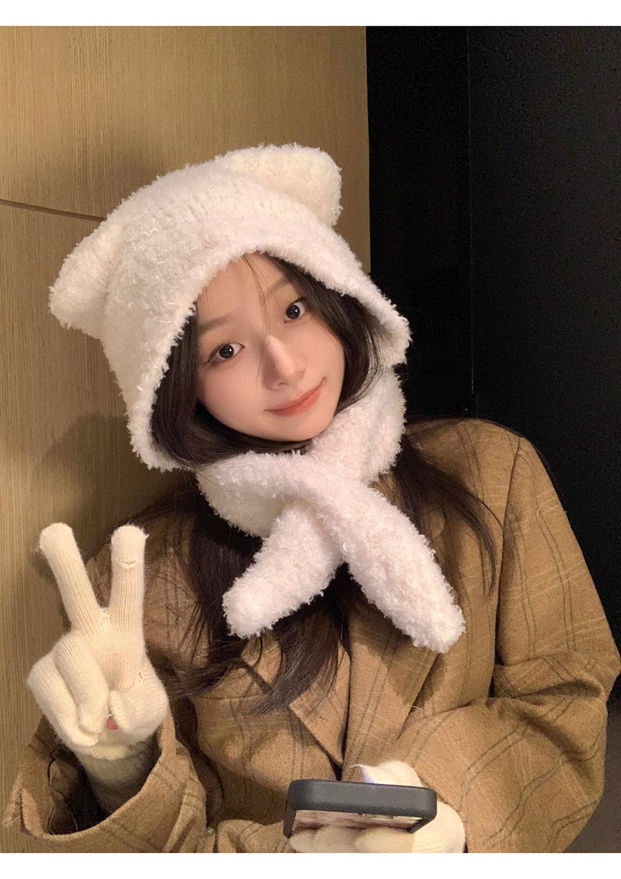 Waxy Jiji Bear Ear Fluffy Hat 여성의 겨울 방한 귀 보호 모자 스카프 원피스 귀여운 올 매치 레이 펑 모자스토어 가기