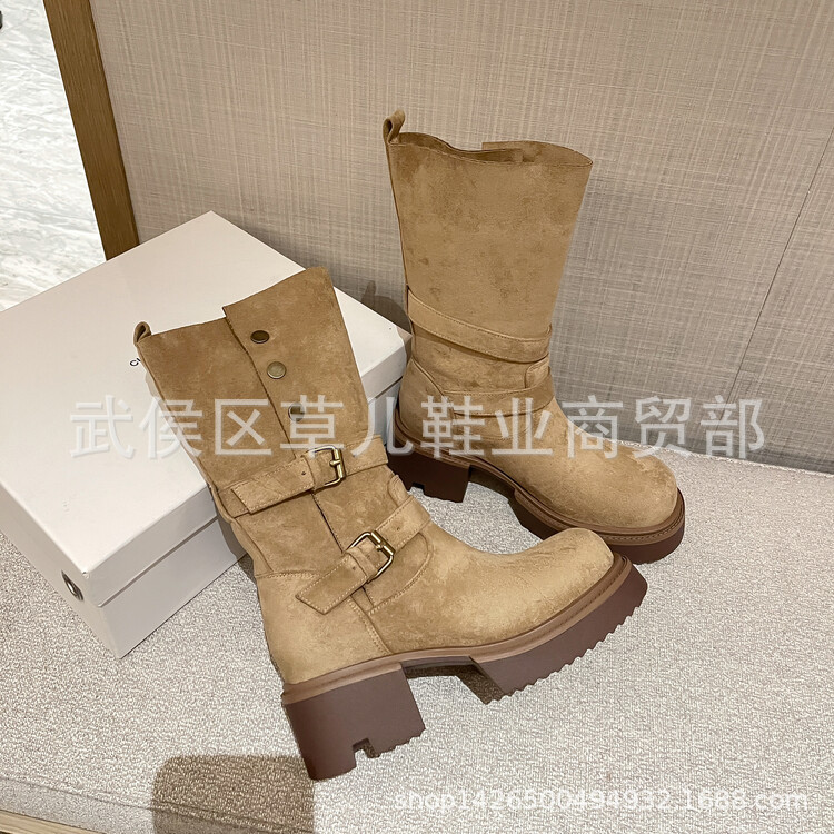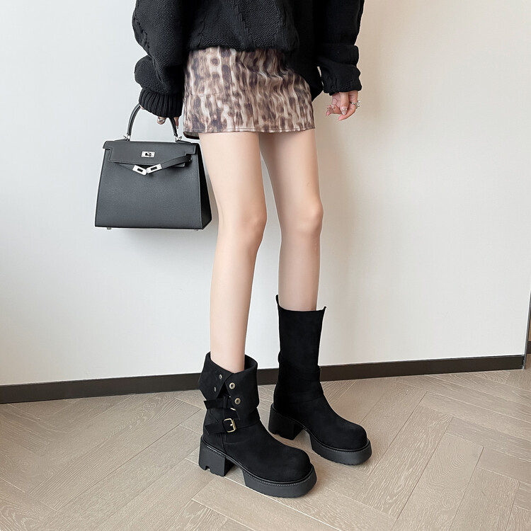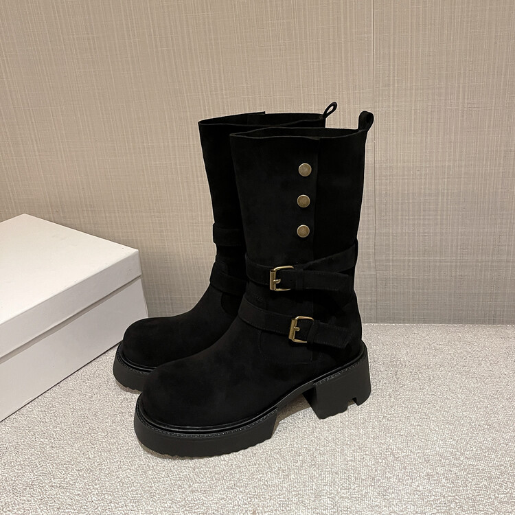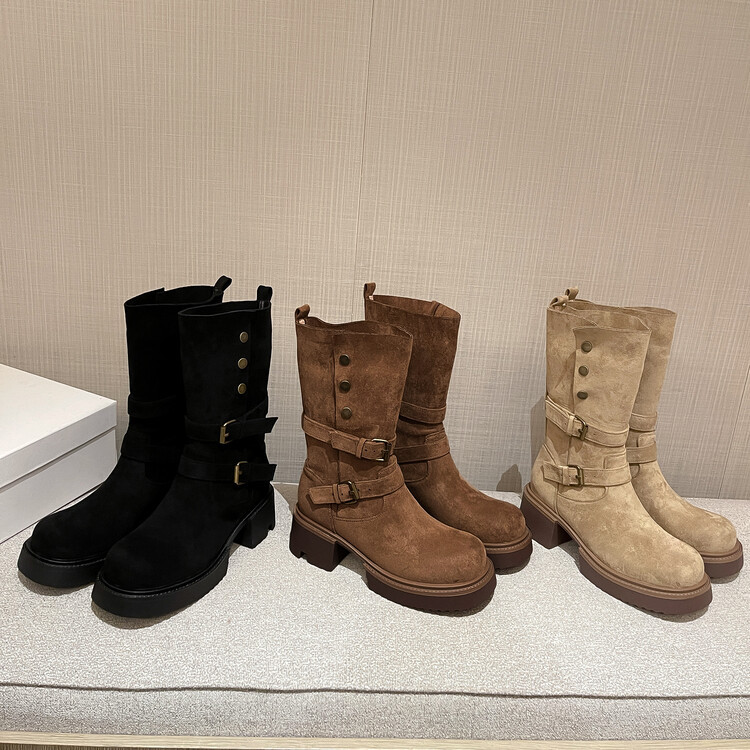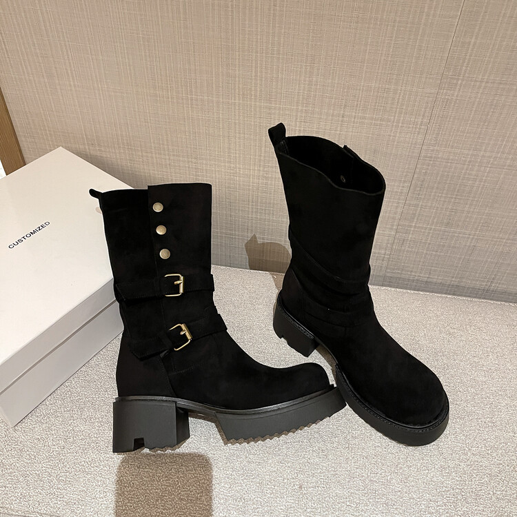 스웨이드 버클 미들 부츠 여성 캐주얼 투웨어 싱글 부츠 가을 및 겨울 뉴 라운드 발가락 두꺼운 미들 힐 여성용 미들 부츠 말 부츠스토어 가기