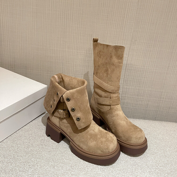 스웨이드 버클 미들 부츠 여성 캐주얼 투웨어 싱글 부츠 가을 및 겨울 뉴 라운드 발가락 두꺼운 미들 힐 여성용 미들 부츠 말 부츠