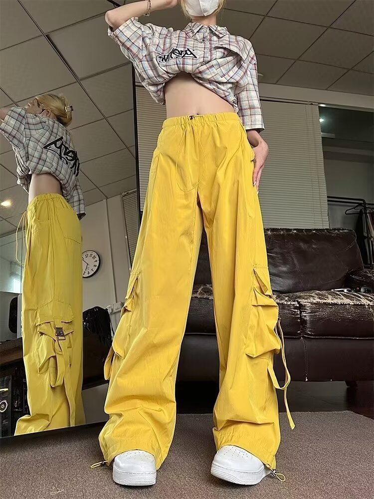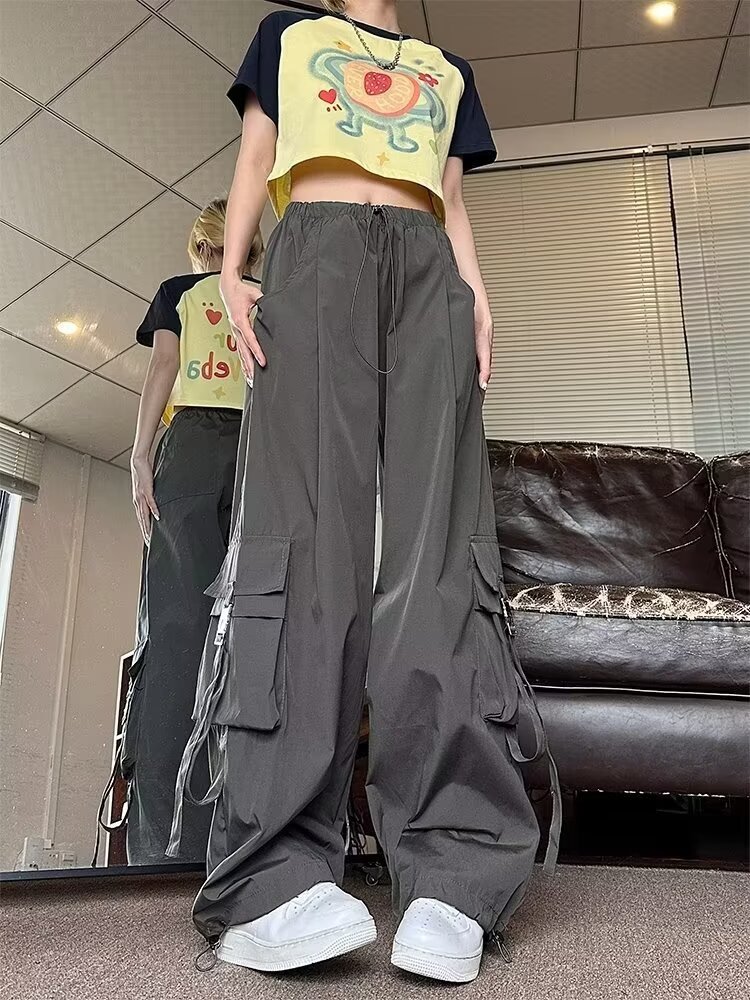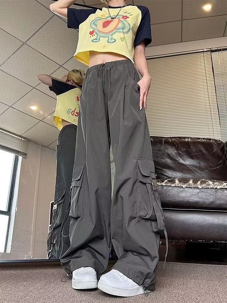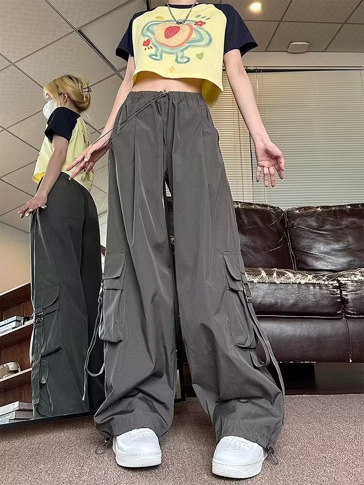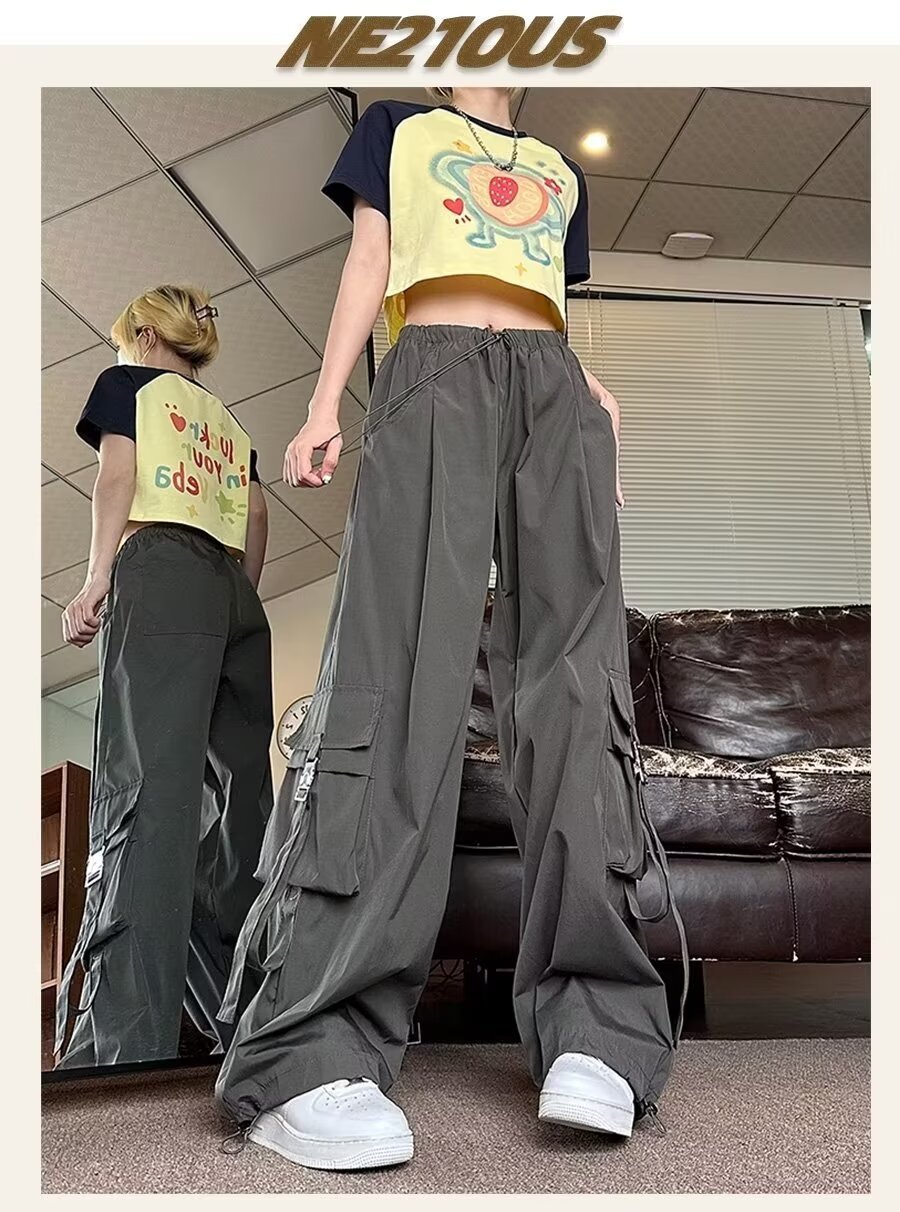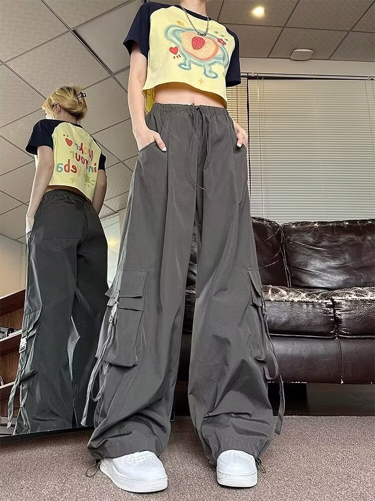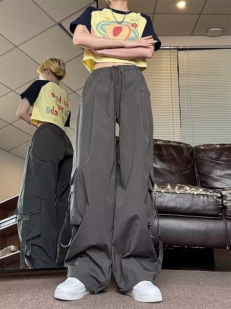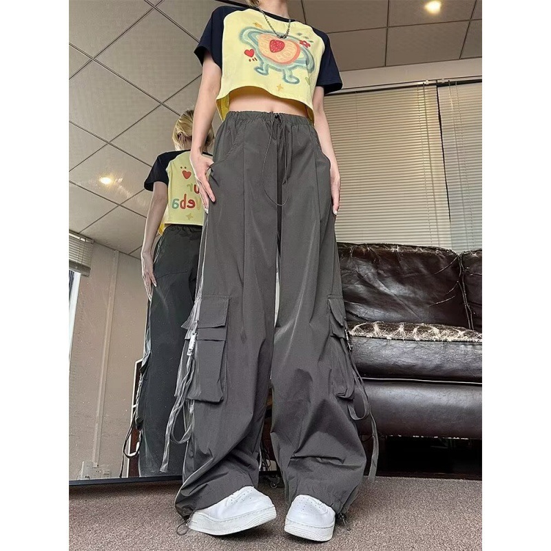 봄 여름 여성용 미국식 와이드 레그 낙하산병 루즈한 작업복, 얇고 속건성, 복고풍, 약간 플레어되는 캐주얼 바지스토어 가기