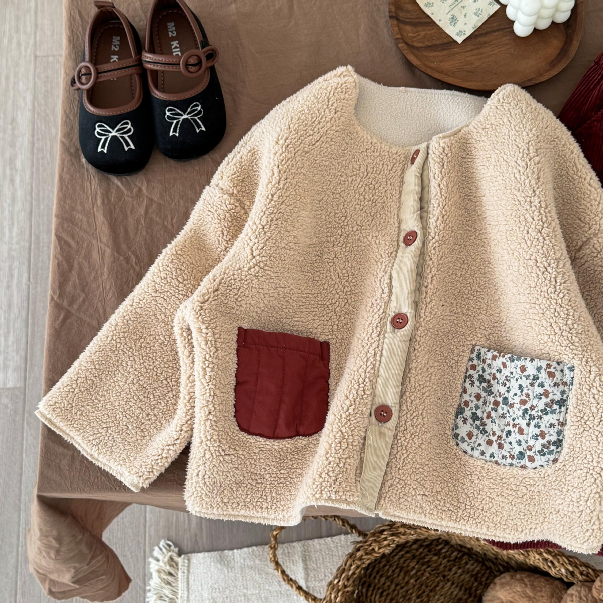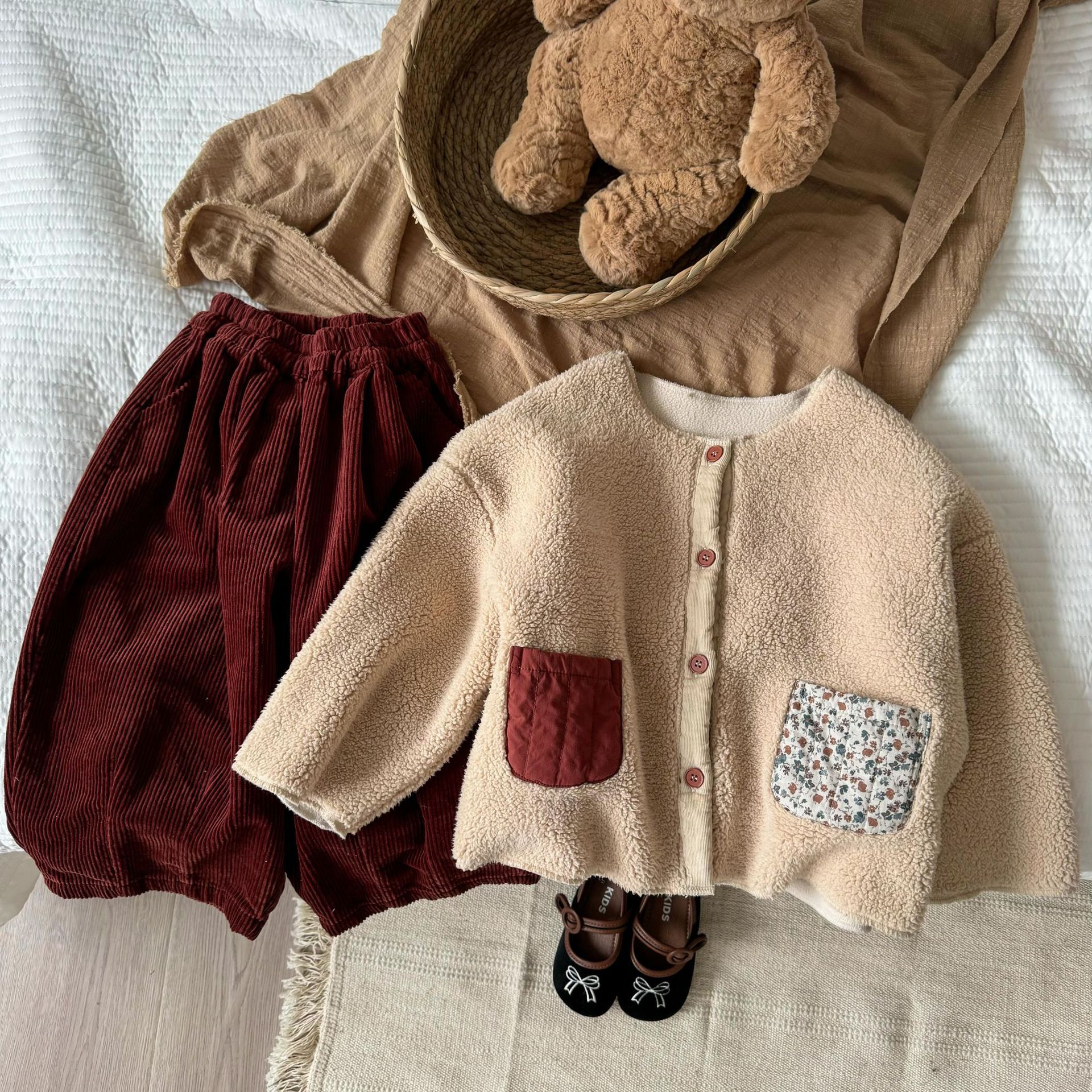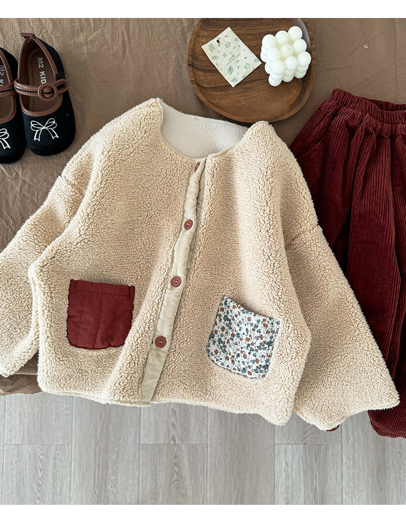 Yimai 가을 및 겨울 새로운 아동복 한국 스타일 소녀 양고기 벨벳 모피 재킷 어린이 컬러 블록 플로랄 포켓 벨벳 코튼 패딩 의류