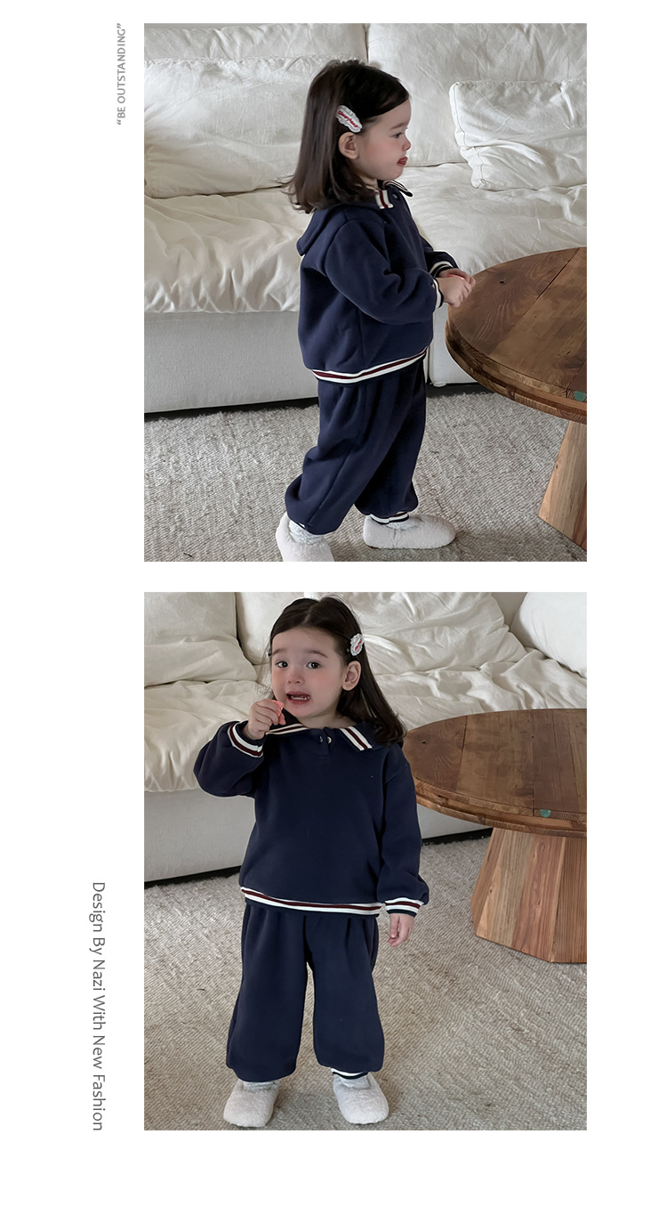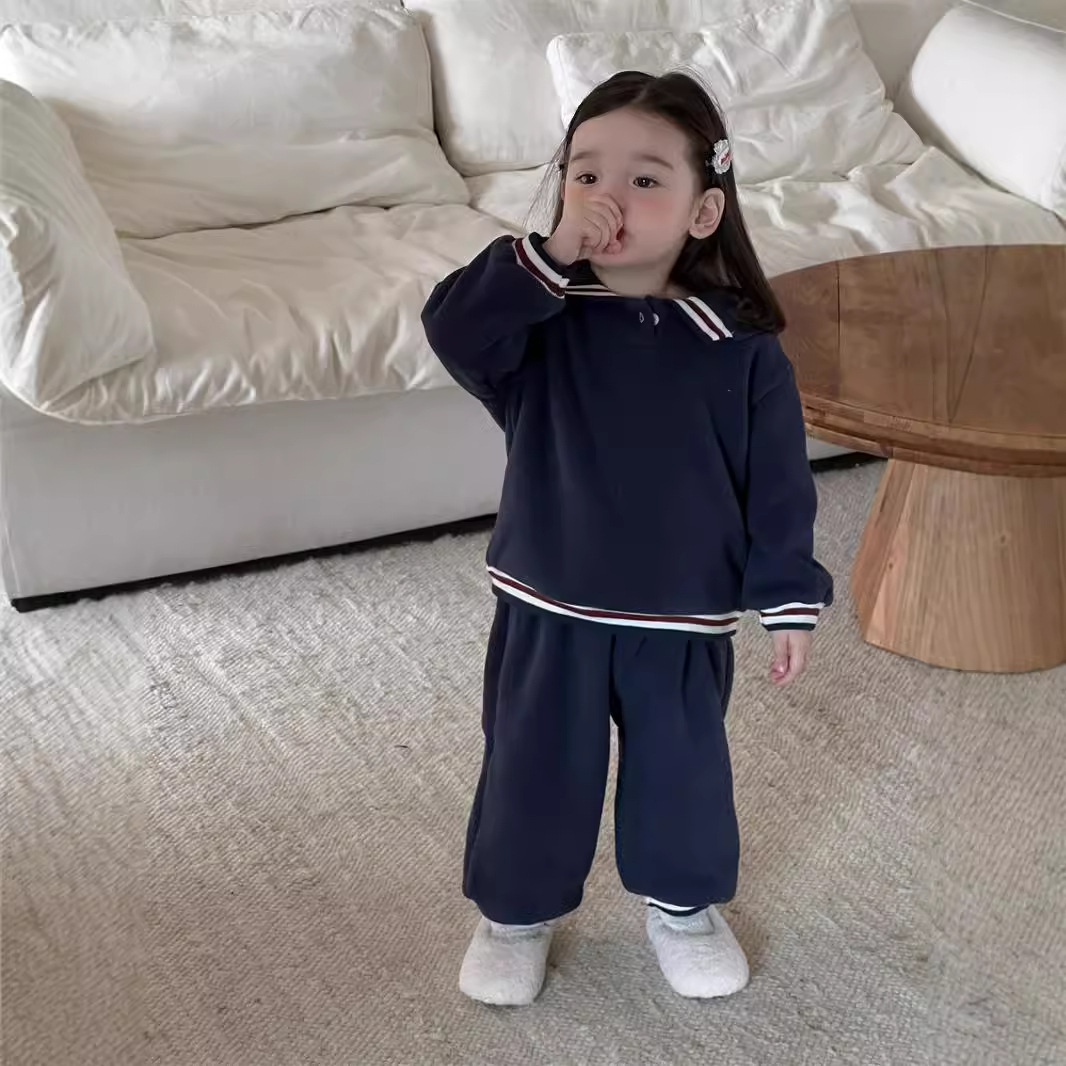 어린이 가을 겨울 두껍게 세트 한국 아동복 2024 새로운 아기 두꺼운 옷 소녀의 해군 칼라 양털 세트