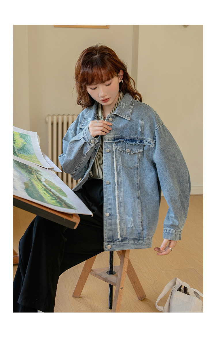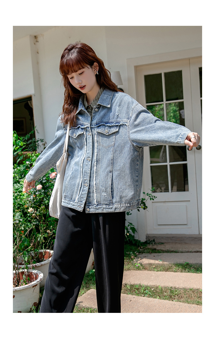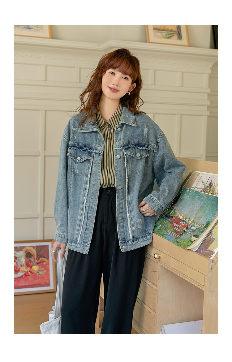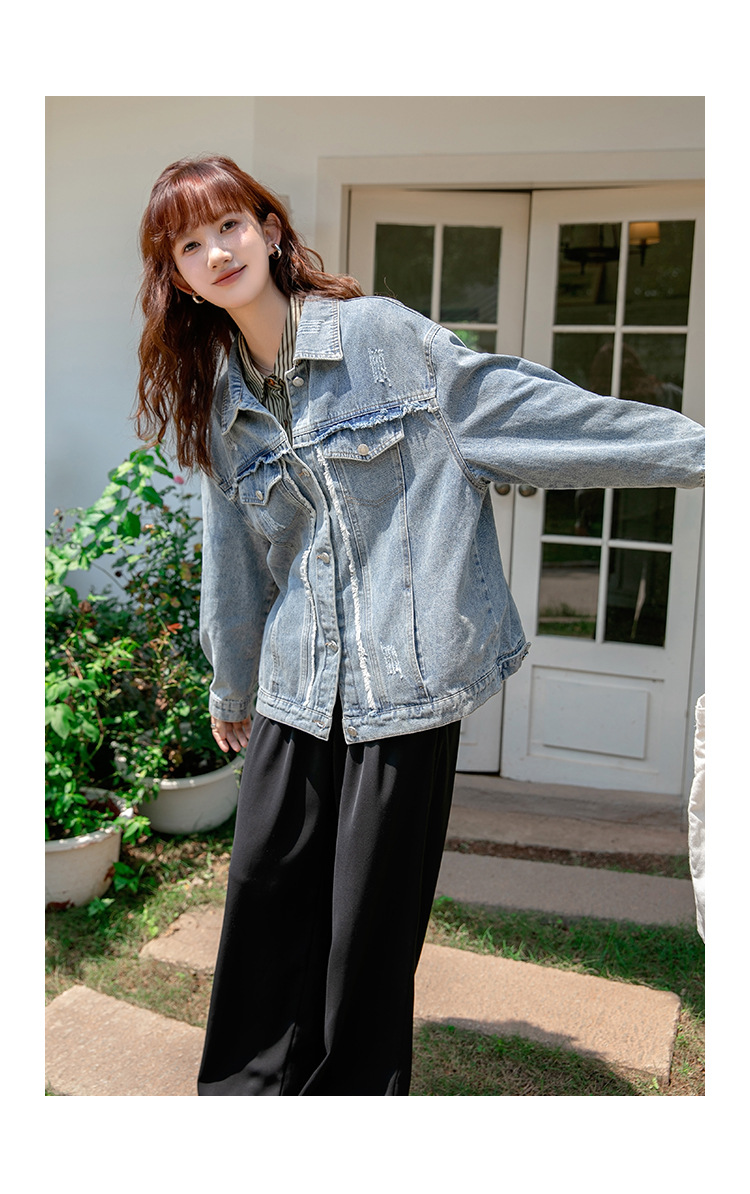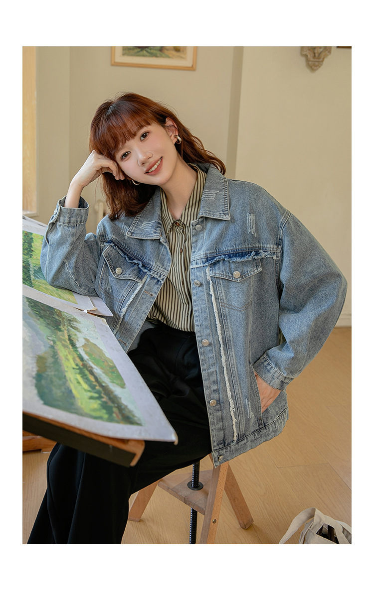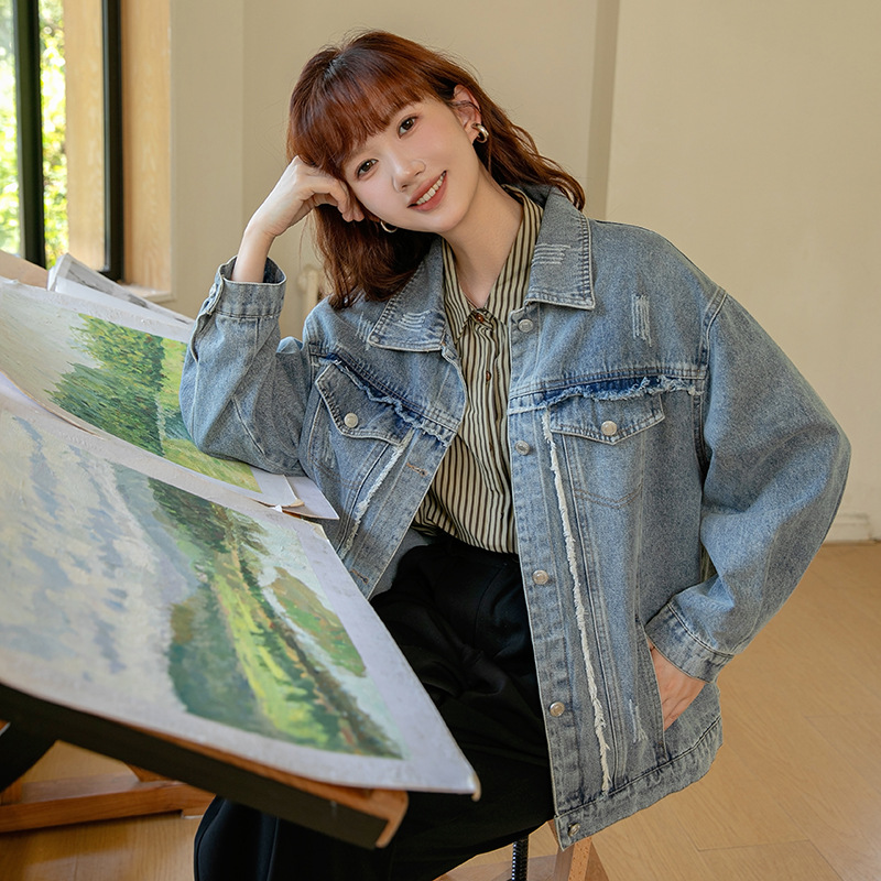 2024 가을과 겨울 새로운 한국어 버전의 복고풍 거친 가장자리 오래된 낡은 느슨한 디자인 데님 코트 여성스토어 가기