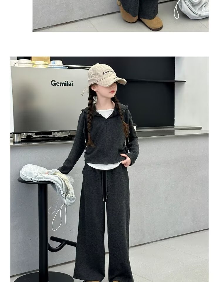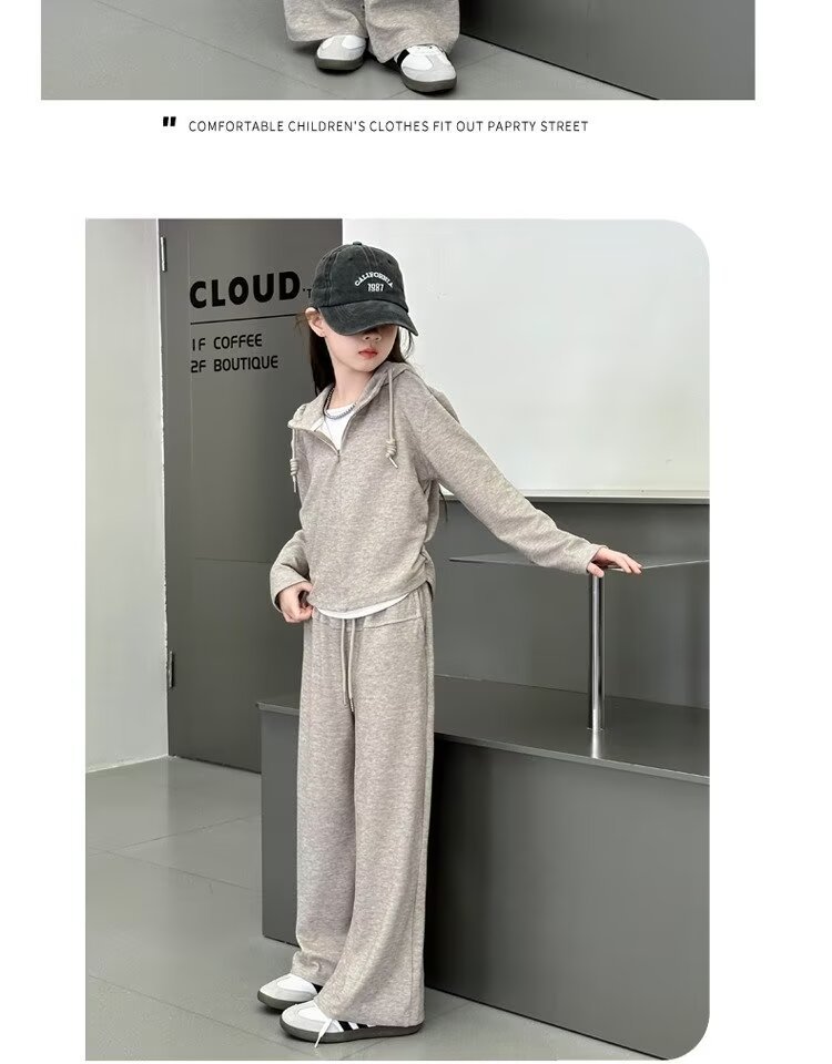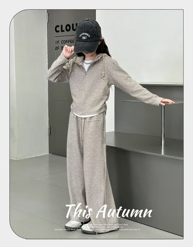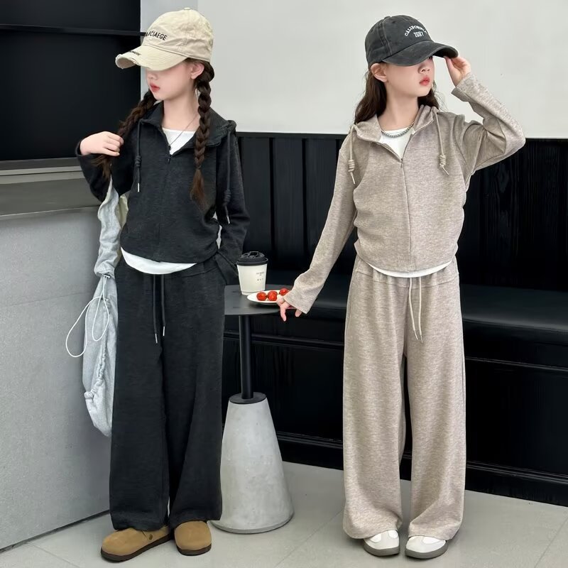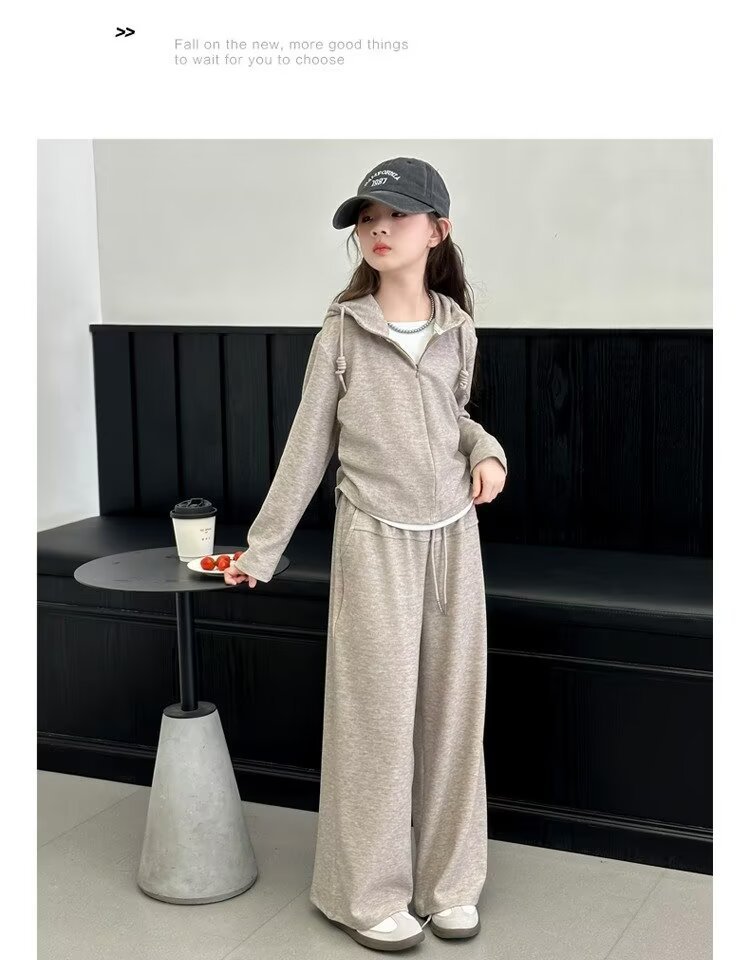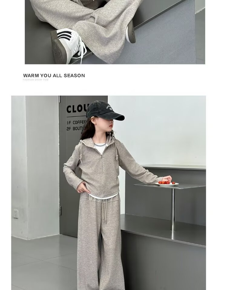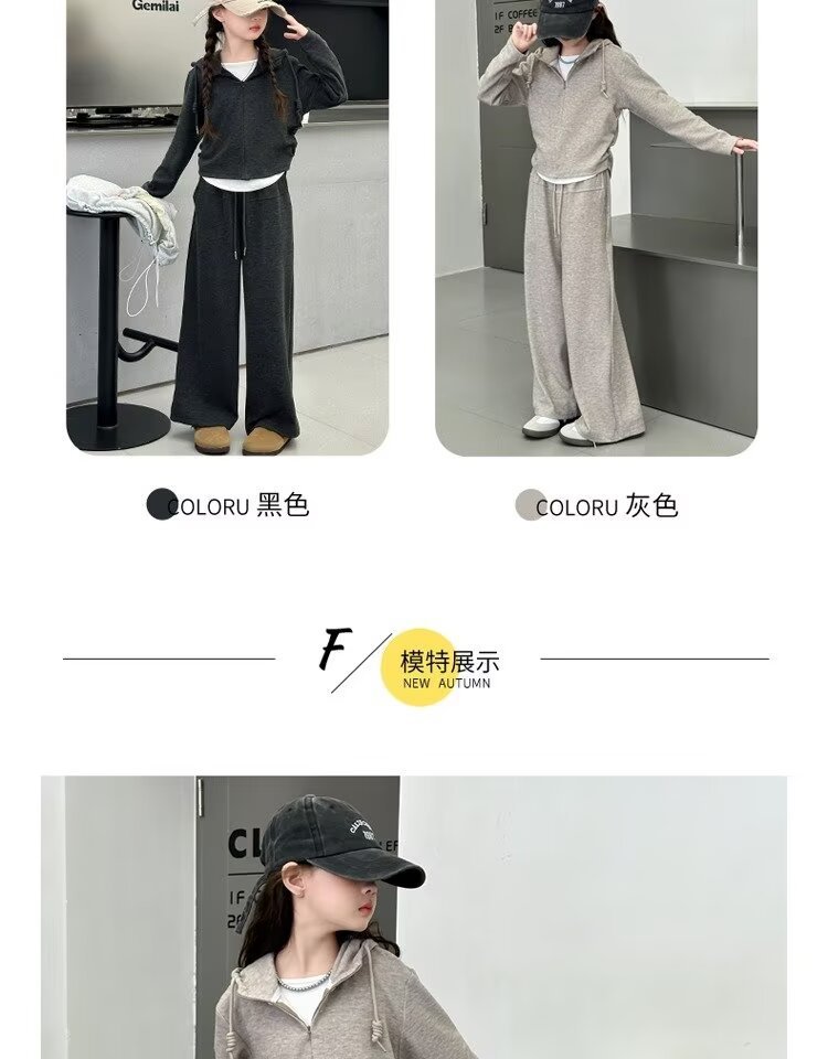 여성 아동복 봄과 가을 유행 외국식 세트 어린이 소녀의 단색 지퍼 후디 와이드 레그 바지 투피스 세트스토어 가기