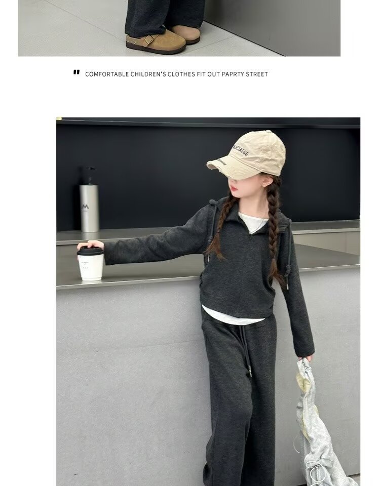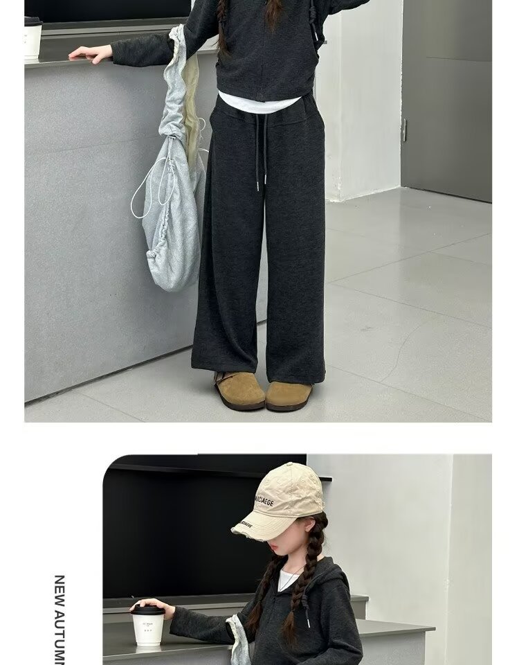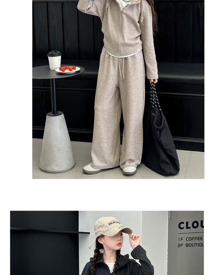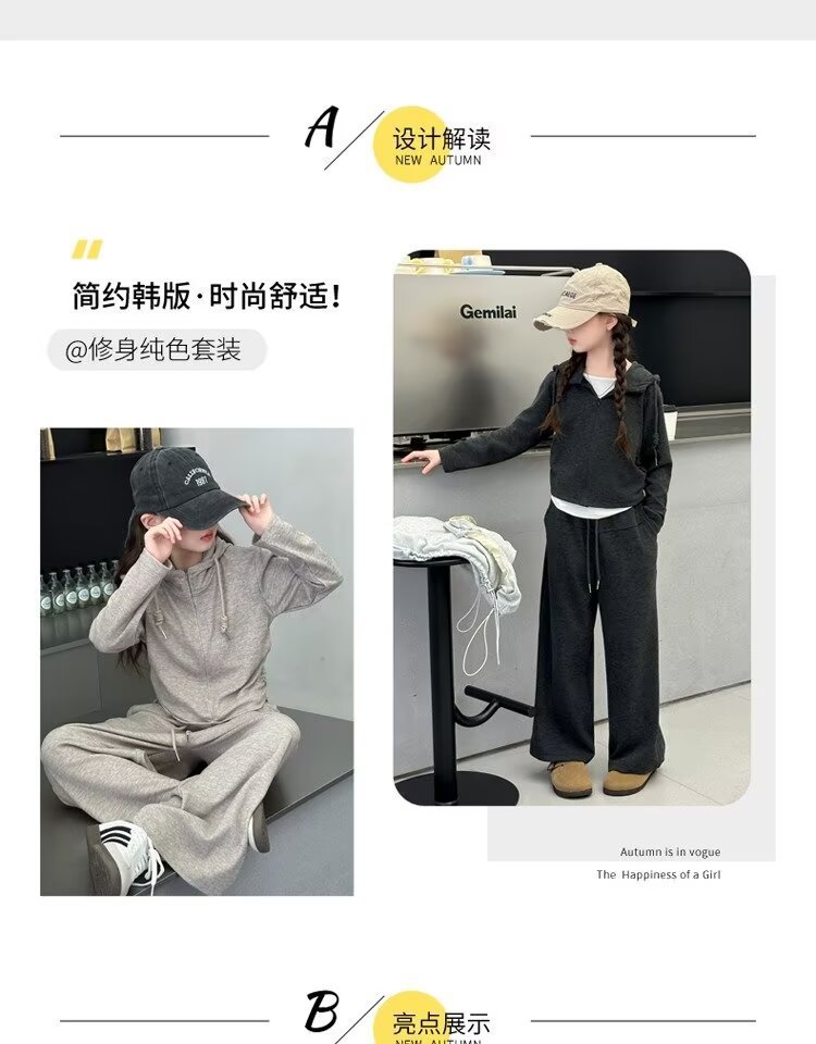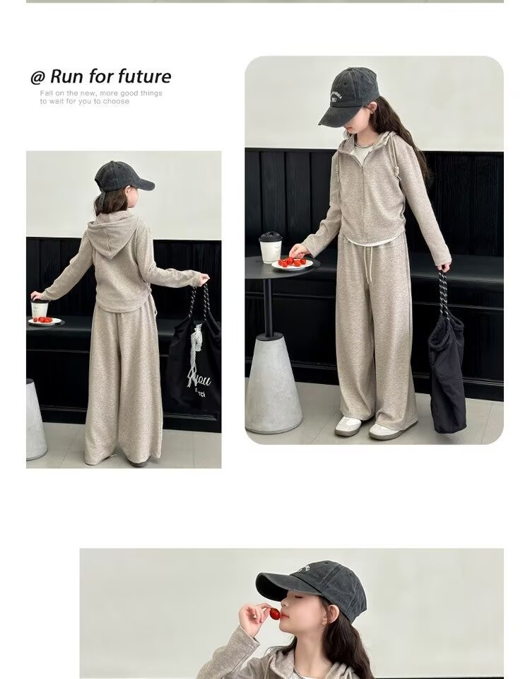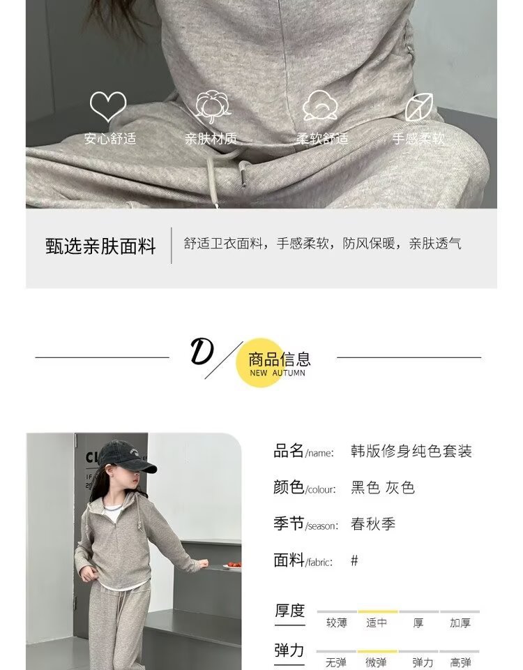 여성 아동복 봄과 가을 유행 외국식 세트 어린이 소녀의 단색 지퍼 후디 와이드 레그 바지 투피스 세트스토어 가기