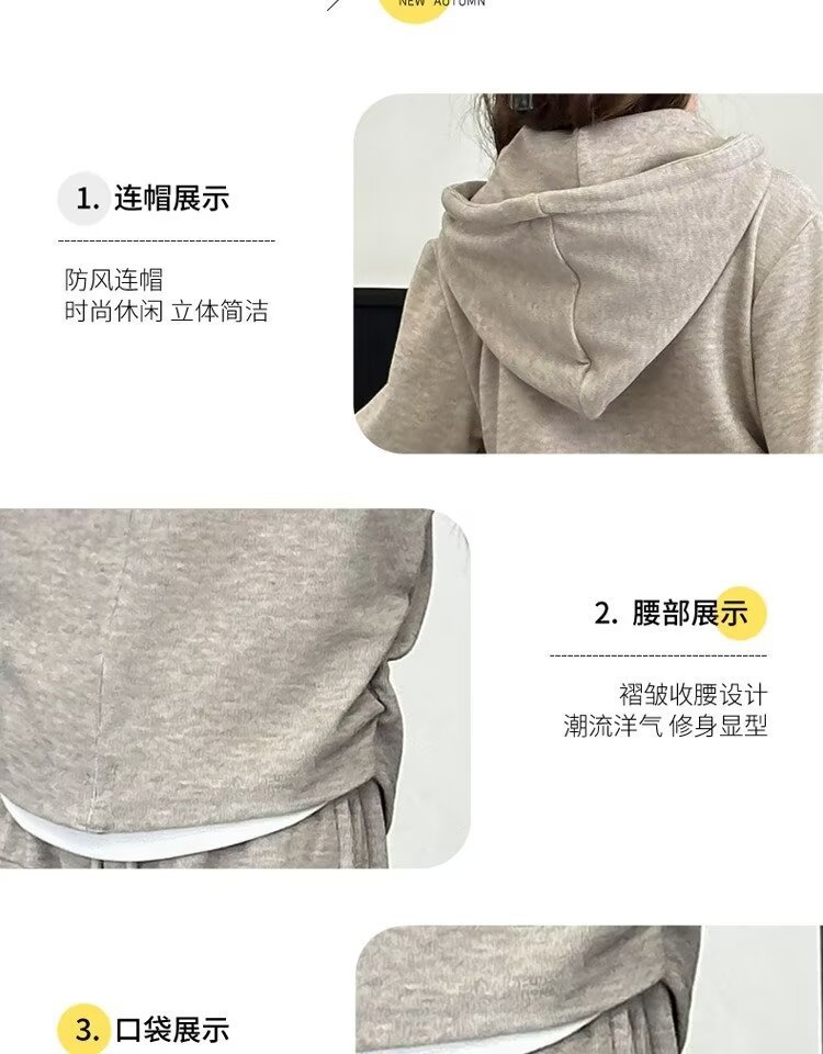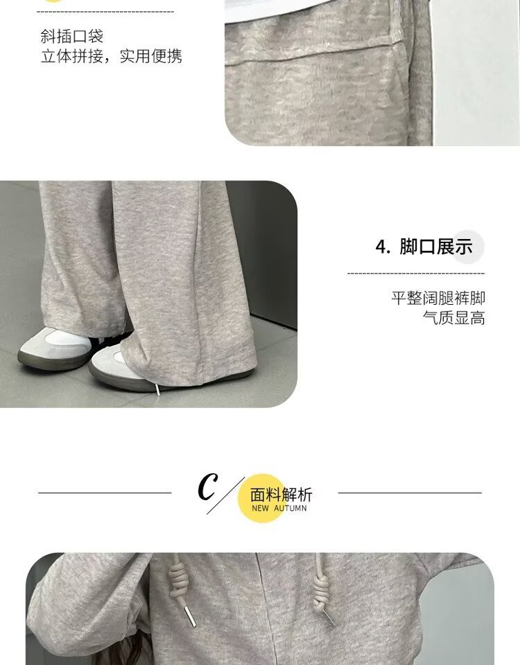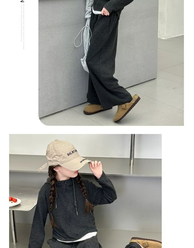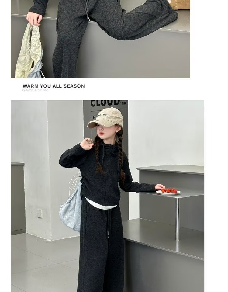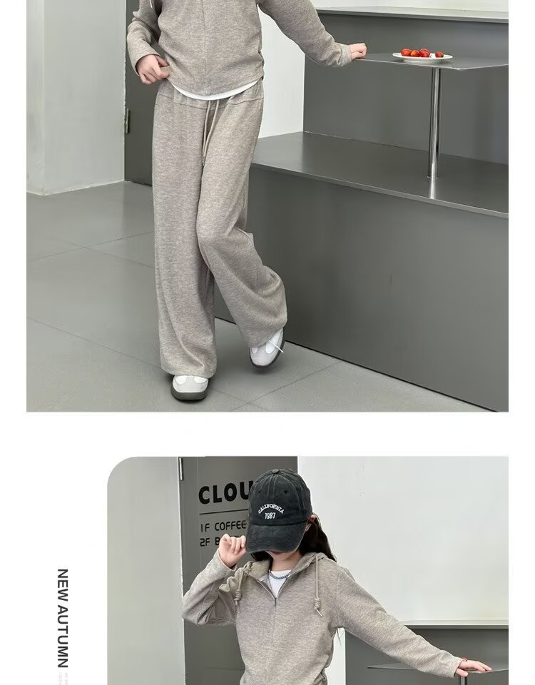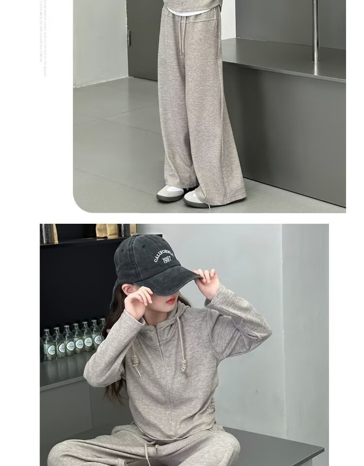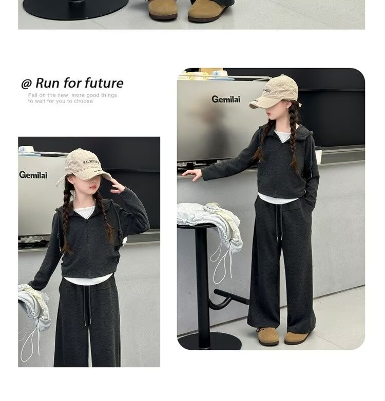 여성 아동복 봄과 가을 유행 외국식 세트 어린이 소녀의 단색 지퍼 후디 와이드 레그 바지 투피스 세트스토어 가기