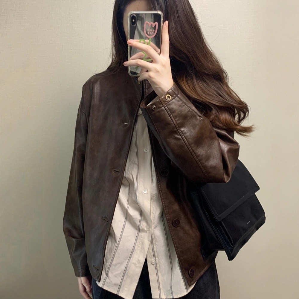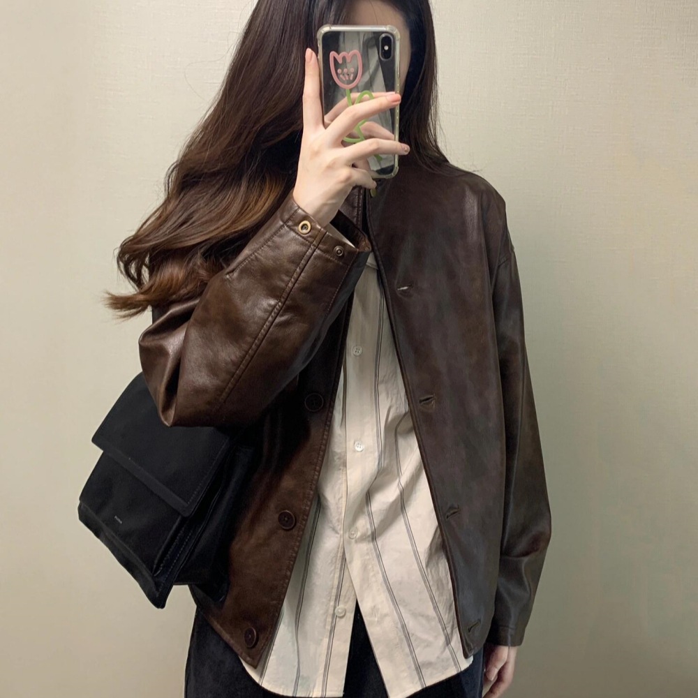 가을 미국 스타일 다크 브라운 가죽 자켓 여성의 봄과 가을 새로운 복고풍 수직 칼라 짧은 오토바이 PU 가죽 자켓스토어 가기
