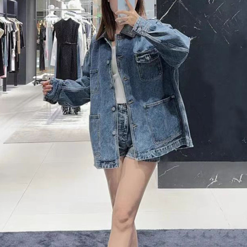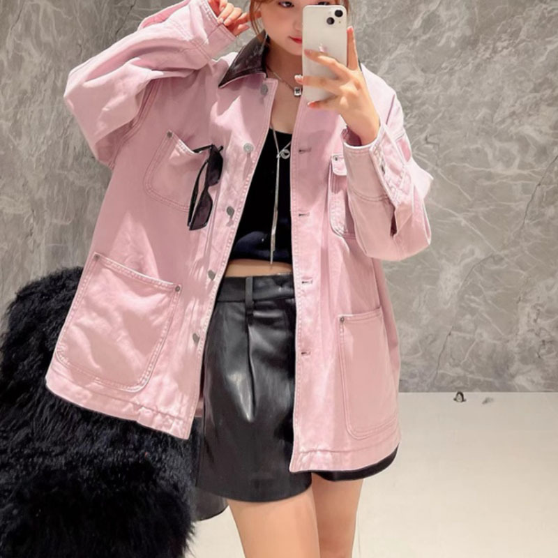 2024 겨울 새로운 PU 가죽 바느질 옷깃 상자 재킷 무거운 산업 워시 느슨한 데님 재킷 여성 4JKT006스토어 가기