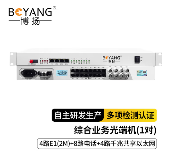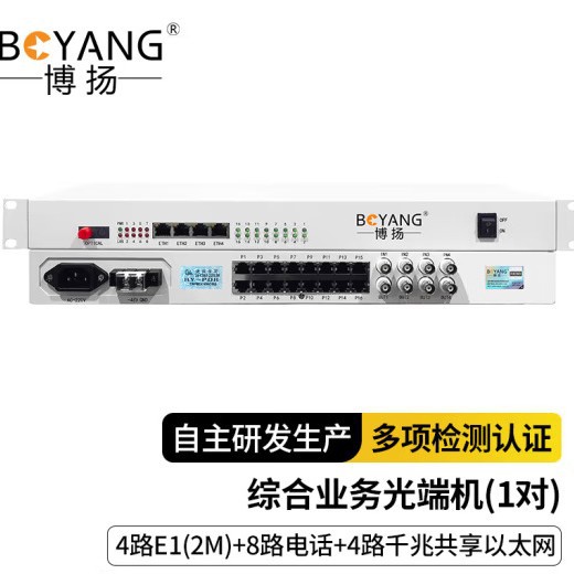 博扬 多功能综合业务电话光端机 4路E1+8路电话+4路千兆以太网 单纤60km 机架式双电源 1对价 BY-8P4E4GE*1*合格证*保修卡