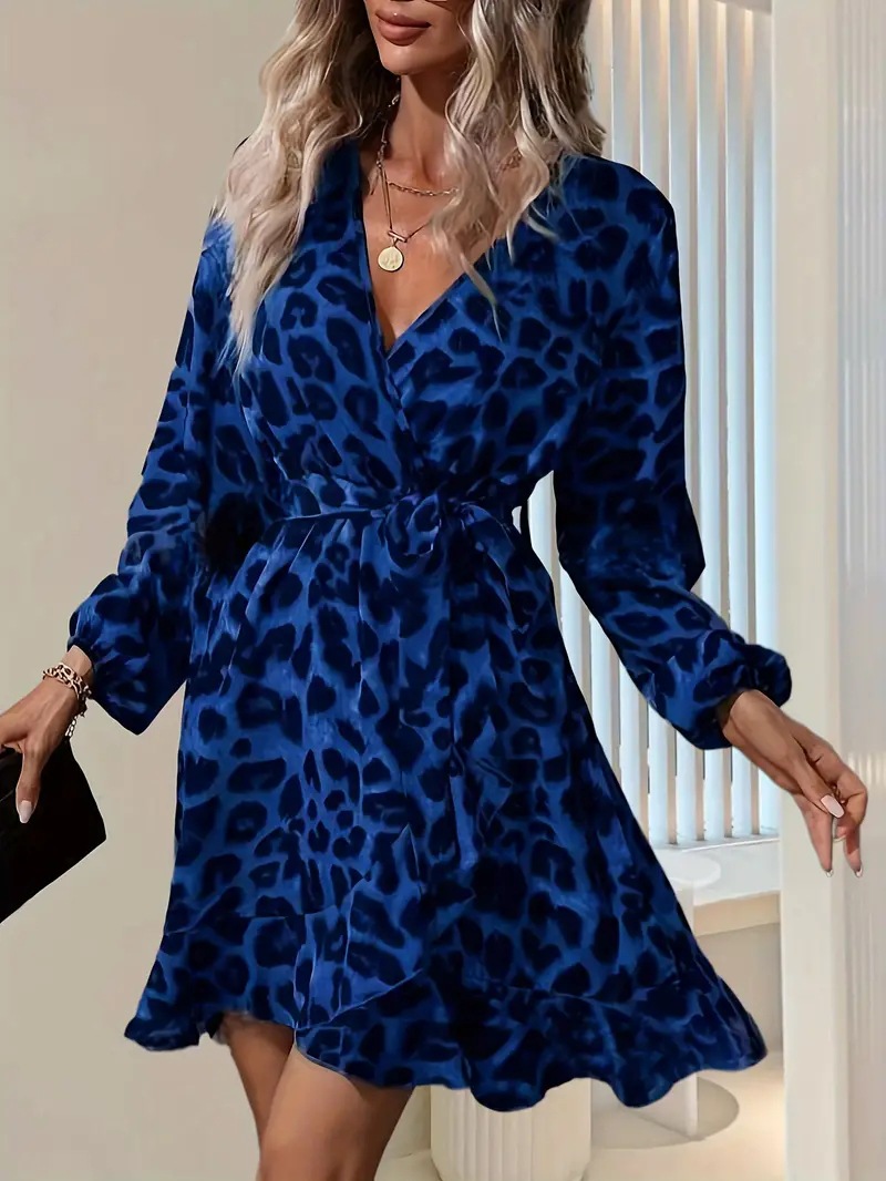 Spot 2025 국경 간 핫 세일 유럽과 미국의 레오파드 프린트 v 넥 하이 웨이스트 레이스 업 불규칙한 여성 드레스 Amazon 핫 스타일스토어 가기